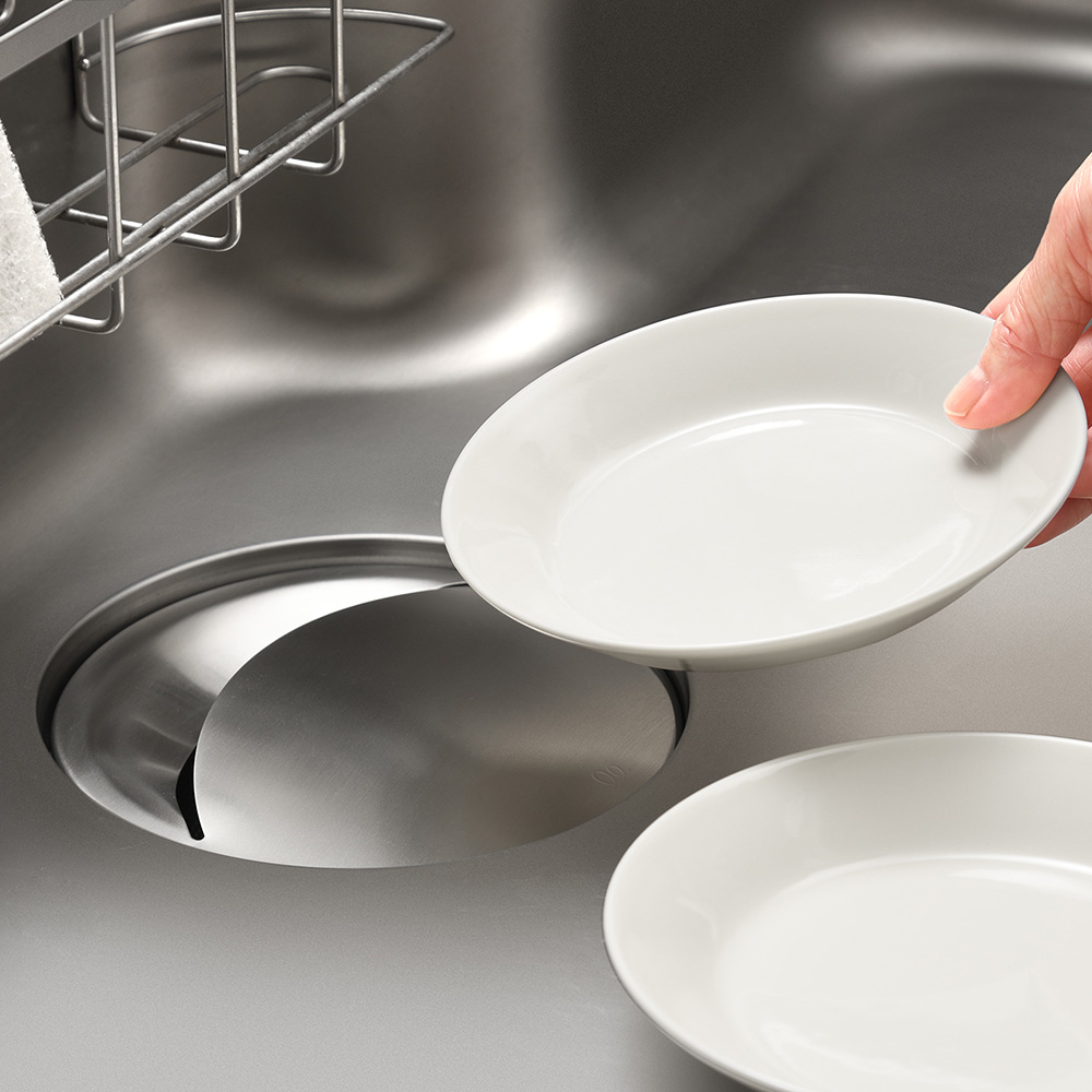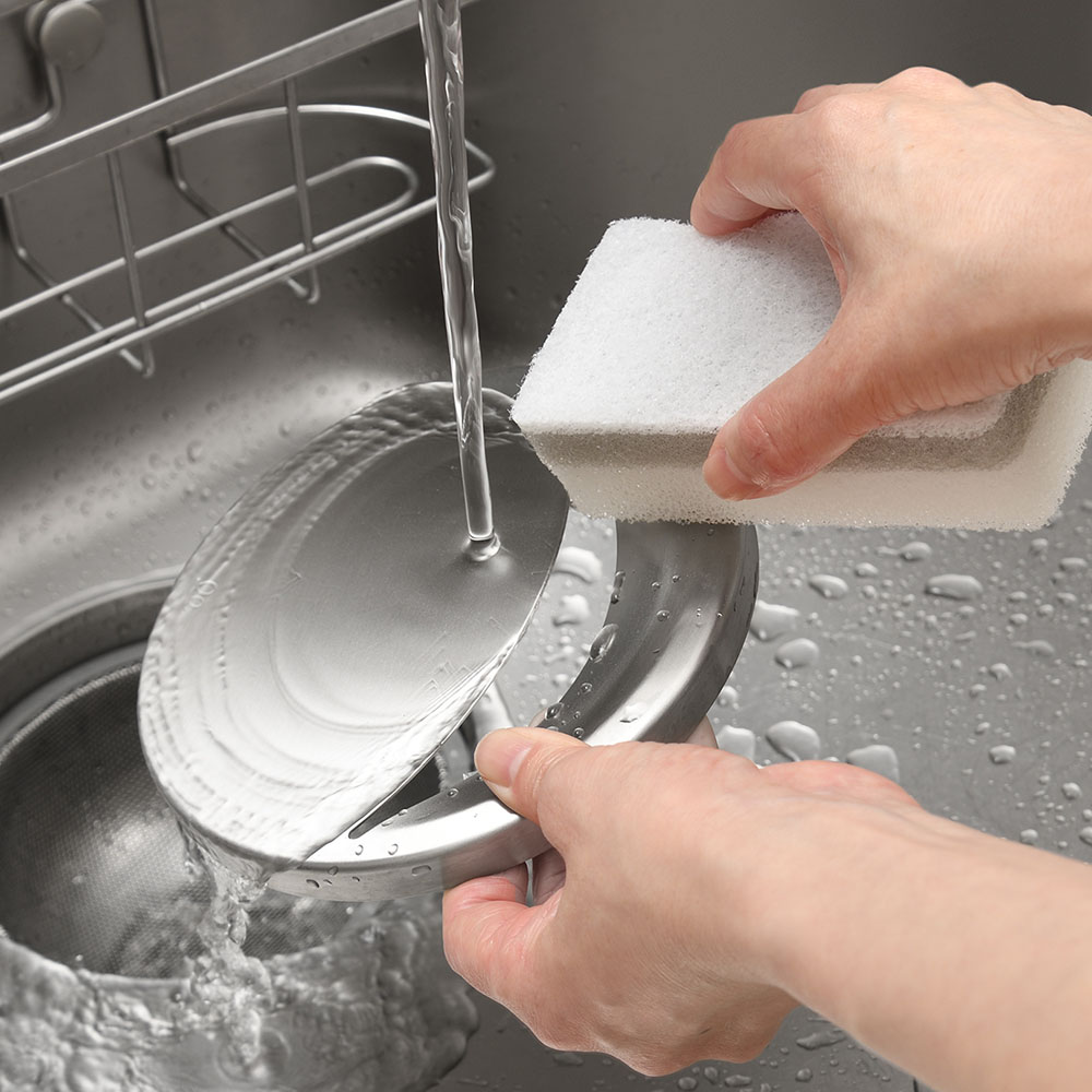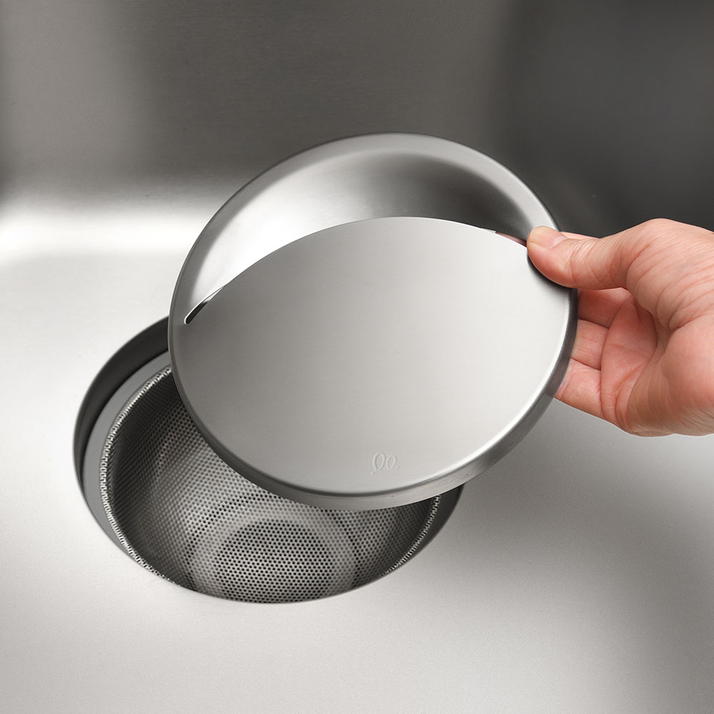 銅配合のステンレスで、ぬめりにくく清潔な毎日銅配合のステンレス素材だから、銅イオンの抗菌効果でぬめりを軽減。4時間後には菌を約98%抑制。ぬめりにくく、サッと洗えるので、清潔な毎日が送れます。広いドーム型のカバー面なので、スプーンやパッキンなどの小物がズリ落ちにくい。カバー面が広いので、洗い物時に食器が置けてシンクを広く使えます。水が残りにくい開口部。シンプルな形状なのでサッと洗えます。シンクに馴染むステンレス蓋なので、排水口をスッキリカバー。シンクの見た目がワンランクアップします。金属加工の街「新潟県燕三条」の職人がひとつひとつ丁寧に仕上げています。