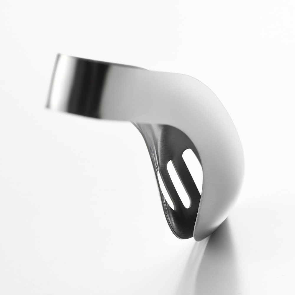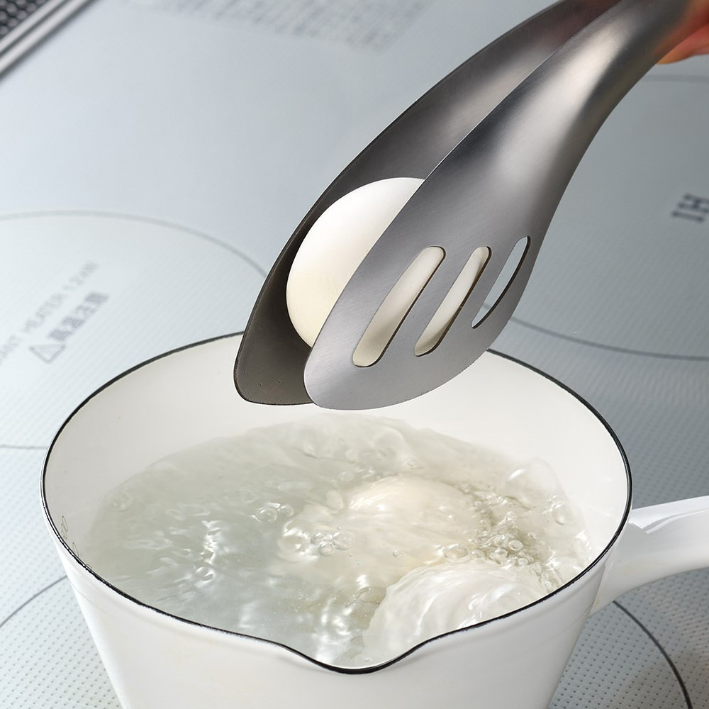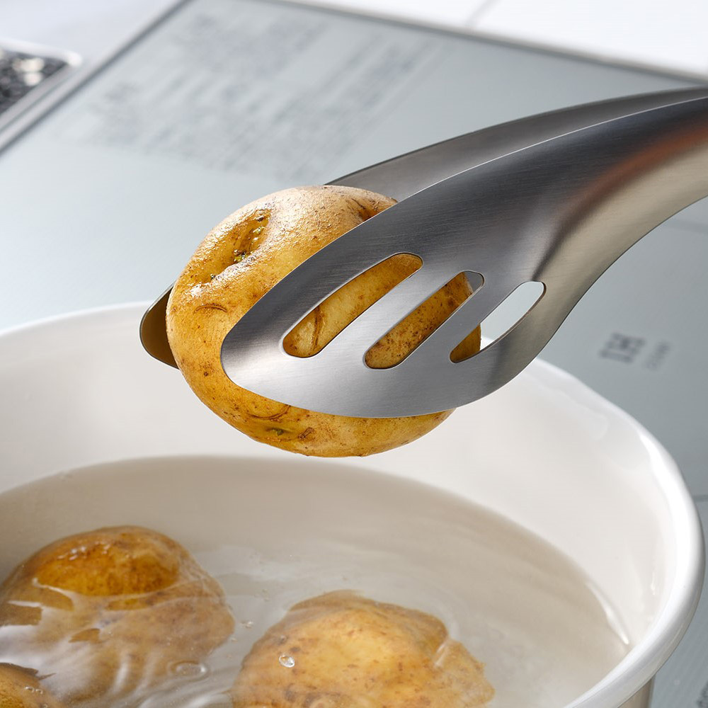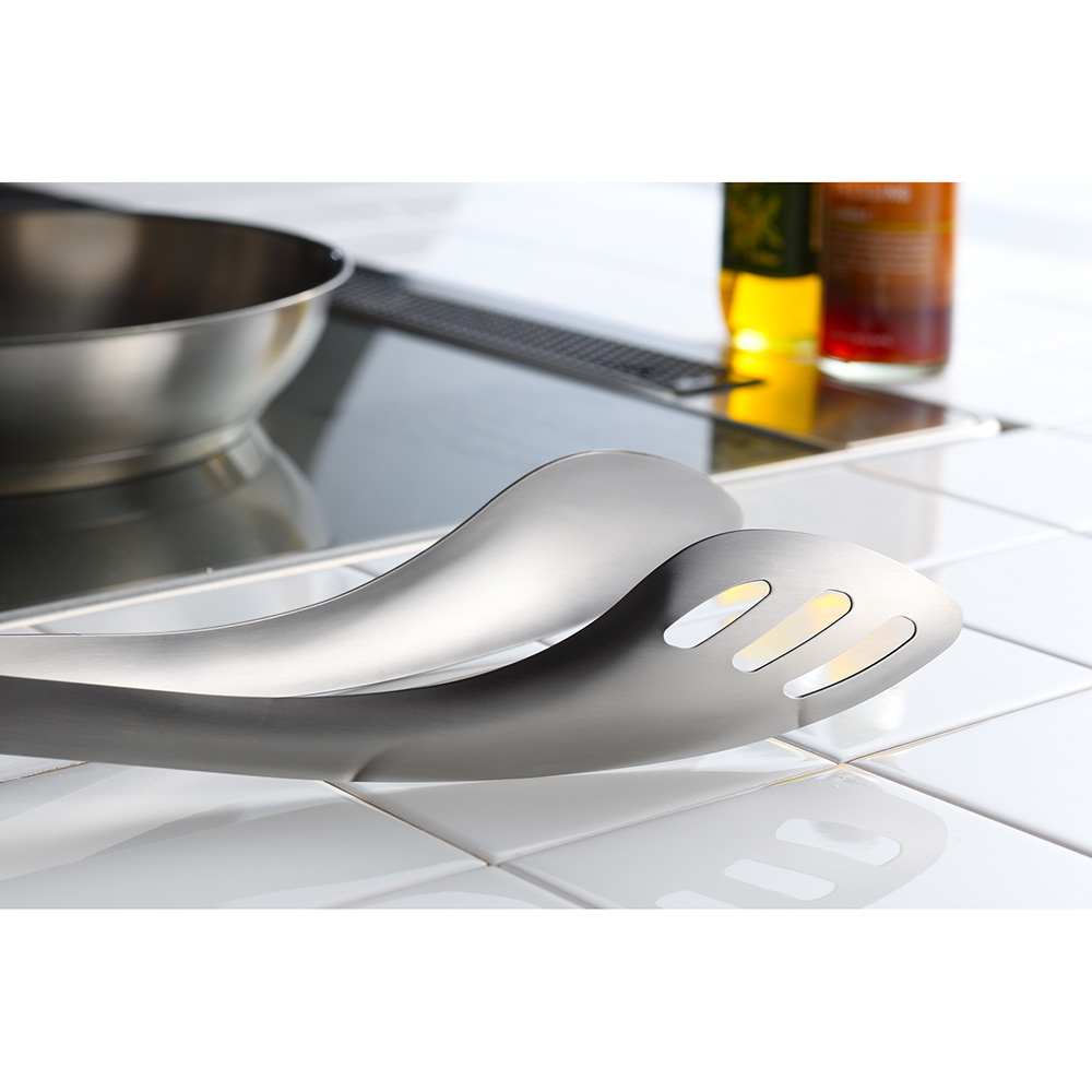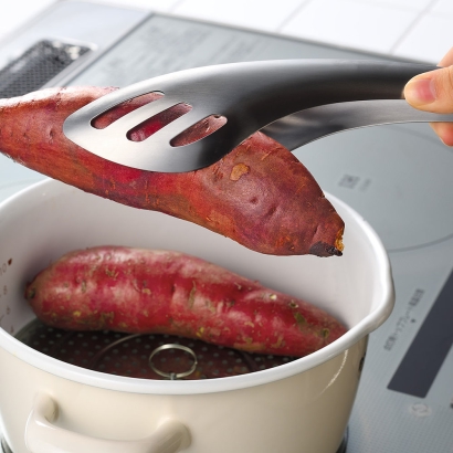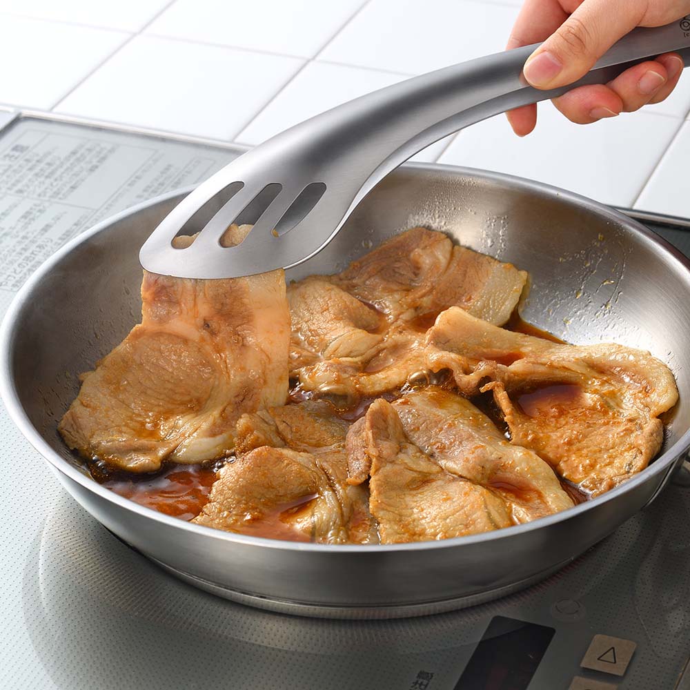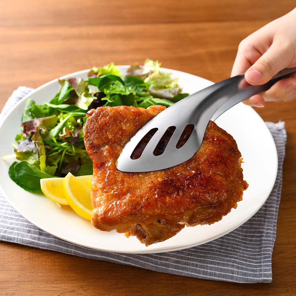 しっかりつかんでソースもすくえるトングです。食材を包み込むようにつかみ、大振りな食材もしっかりつかめます。片側が深くなっていてソースをすくえるので、調理や盛り付けのちょこっとソースがけに便利。加熱調理も安心なハンドルの長さ。腕を持ち上げず楽な姿勢で使える角度です。ひっくり返すと先端が浮くので、スペースを汚さずに置けます。特許取得のバネでやわらかくつかめます。
