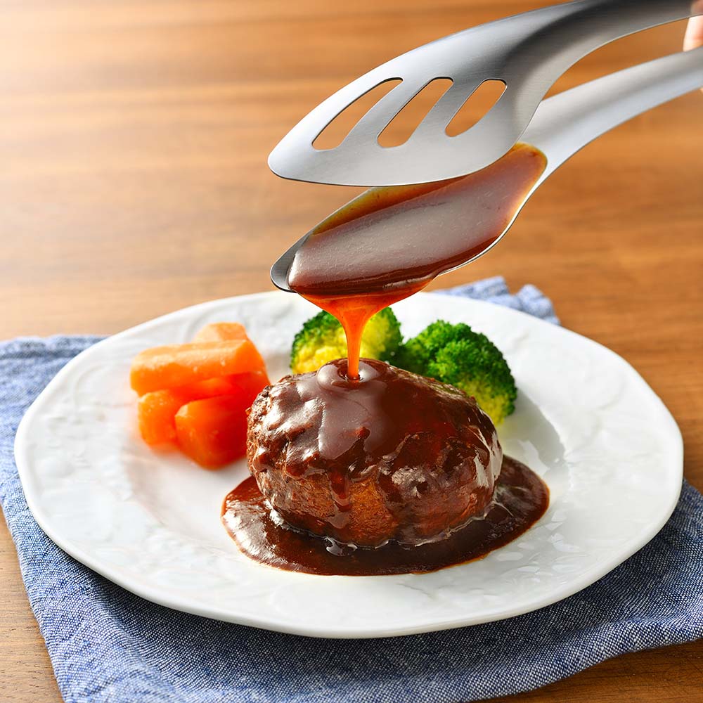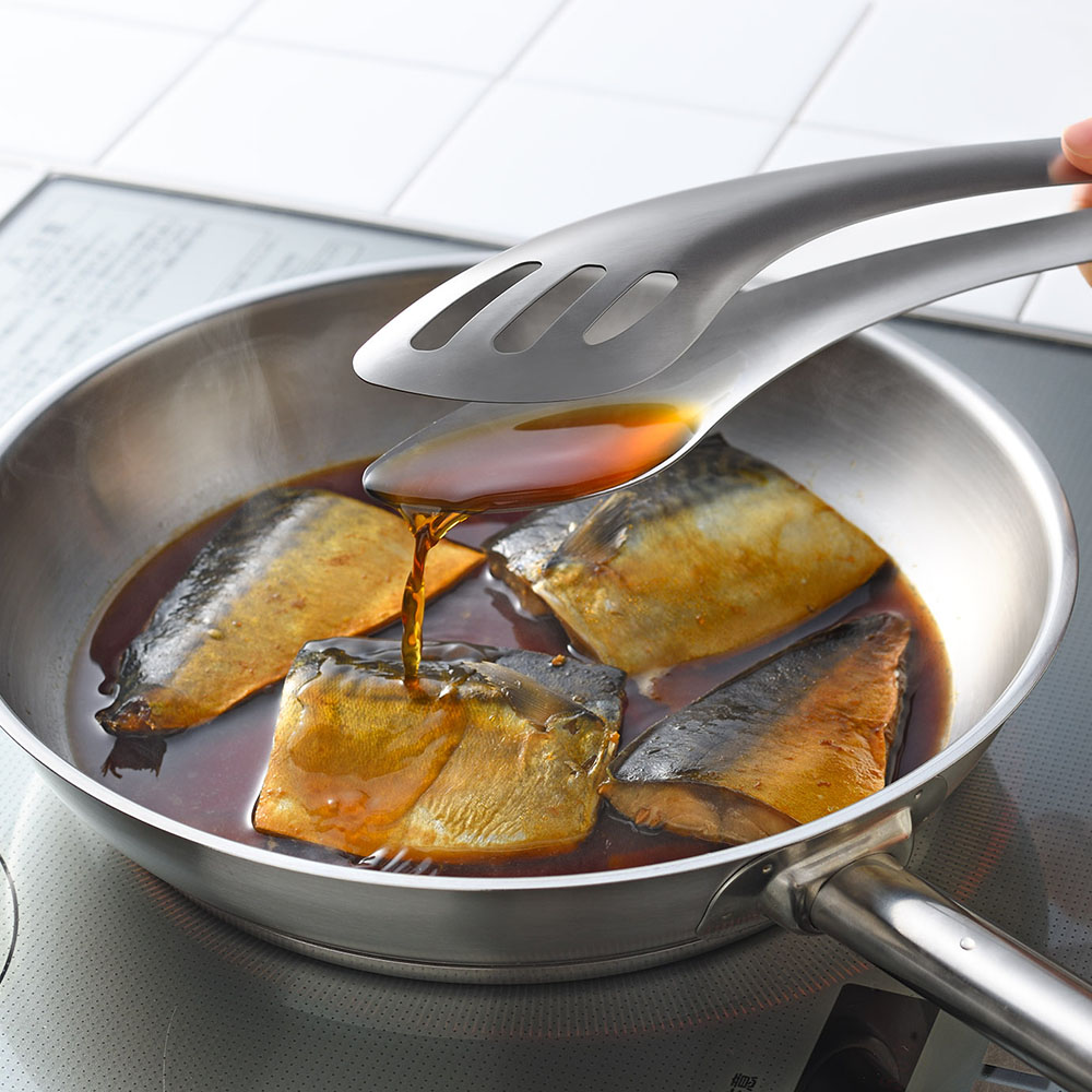 つかんだトングで、そのまま煮汁やソースをすくってかけられます。