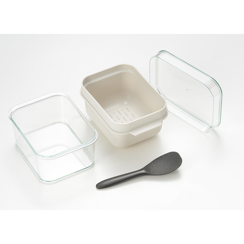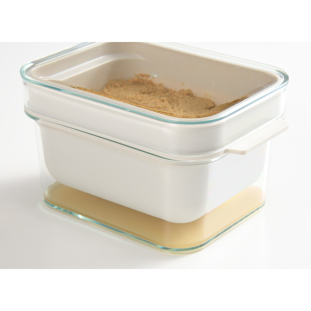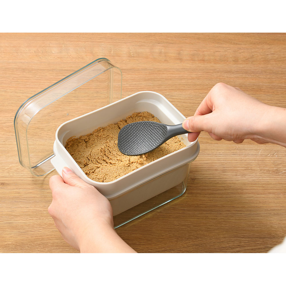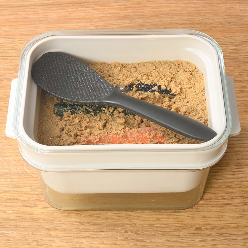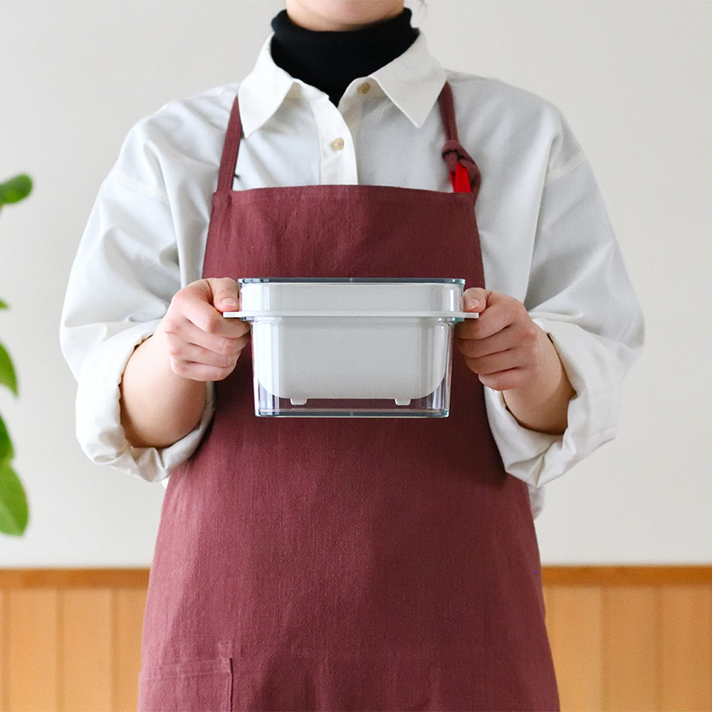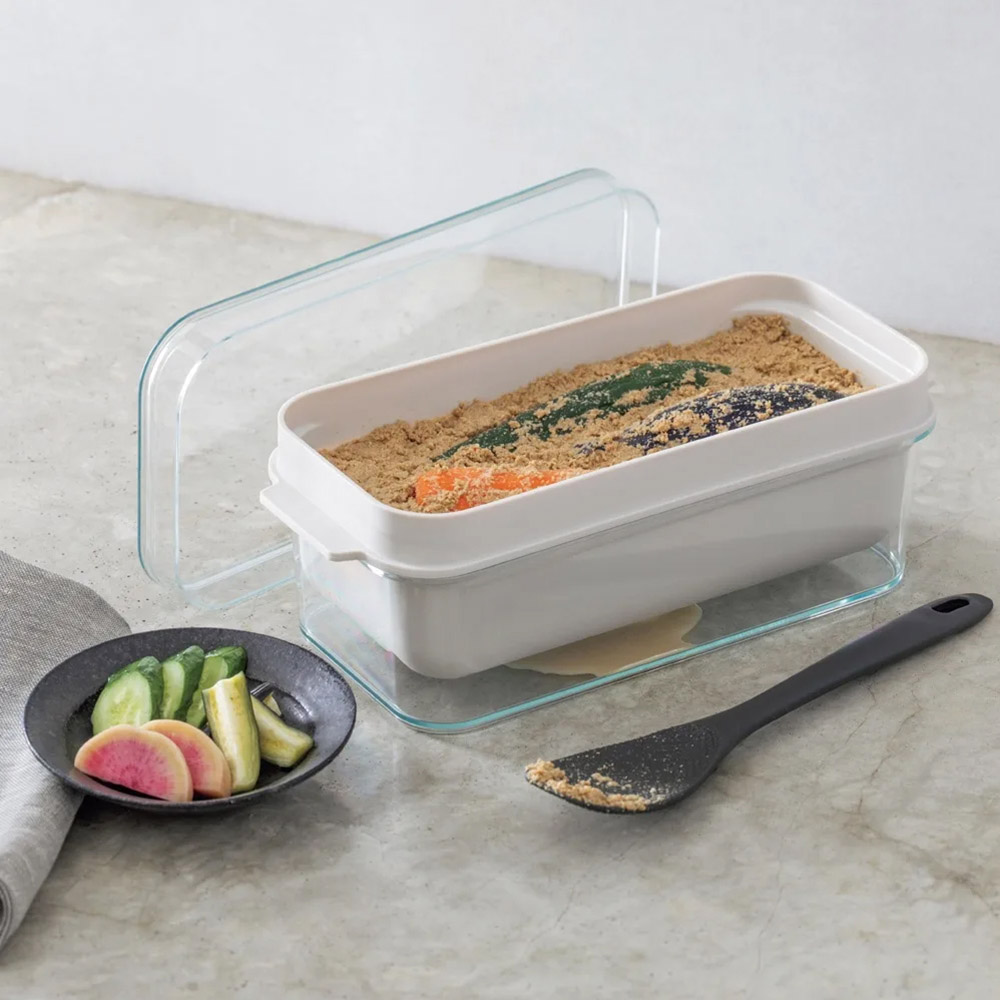 ぬか床のお悩みを解消!ぬか漬けが続かなかった人にも好評の「ぬかどこボックス」に待望のハーフサイズが新登場。初めての方でも、お試し感覚で手軽にぬか漬けライフをスタートできます。食べきりサイズで無駄なく、ストレスなく美味しいぬか漬けが楽しめます! 従来サイズ(1kg分)では、「漬かりすぎてしまって食べきれない」「途中でやめてしまった」というご意見も。このハーフサイズ(500g分)なら無理なく食べきれる量を漬けることができ、いつでも新鮮で美味しいぬか漬けを楽しめます。内容器の底には水抜き用のスリット穴付きこの商品の一番の特徴と言えるのが、内容器に入ったスリット。このスリットから野菜から出る余分な水分が透明な外容器に自然排出されます。このスリット穴の形や数、位置を決めるのが本当に大変だったそうで、その開発期間は、なんと1年以上!試作と検証を何度も繰り返しやっと完成した自信作なんです。ぬか床の余分な水分は外容器に落ち、水捨ても簡単!あとは外容器にたまった水分を捨てるだけ。今まで、小さな穴あきの容器で水分を抜いたり、ペーパーで水気を拭き取ったりしていましたが、そんな面倒な作業はもう不要です。毎日続けるのが大変なかき混ぜも、付属のしゃもじで楽々♪ 付属の専用しゃもじは、かき混ぜや野菜の取出し、ぬかならし等に便利。絶妙なカーブが本体にぴったりとフィットする形なので、容器の端っこ部分もきっちりかき回すことが可能なのです。また表面に凹凸加工がされているので、ヌカがくっつきにくい構造。しゃもじは持ち手を汚さずに収納可能しゃもじを本体に収納した際に、持ち手が浮く設計。手を汚さず、衛生的にお使いいただけます。付属のしゃもじにはこんな工夫が!ぬかのかき混ぜや野菜の取り出し時に便利な専用しゃもじの裏面には突起が付いているので、キッチンのシンクなどに置いてもかき混ぜ部分が直に付かず、衛生的です。 冷蔵庫に入れて安定したぬか床の状態をキープ!冷蔵庫に入れることで一年中安定したぬか床の状態を保つことができ、いつでも美味しいぬか漬けをお召し上がりいただけます。フタと外容器の透明度が高いので、中の様子がよく見え、ぬかの状態やどのくらい水分が出ているのかすぐに確認することができます。幅約13cmと程よいサイズで冷蔵庫内で邪魔にならず、出し入れもスムーズです。コンパクトで持ち運びやすく、冷蔵庫の中での出し入れもスムーズ!両手に収まるコンパクトサイズで、本体自体も軽いのでたっぷり漬けても持ち運びやすいのが嬉しいポイント。本体は3つのパーツに分解可能でお手入れもラクラク外容器、内容器、フタ、しゃもじが付属しています。自分好みの味を複数育てる楽しみもぬか床は、加える食材やお手入れによって風味が変わるのが魅力です。ハーフサイズを複数使えば、「昆布ダシを効かせたぬか床」や「果物の皮で甘味をつけたぬか床」など、異なる風味のぬか床を少量ずつ同時に育てることも可能です。自分だけのこだわりの味を見つけてみませんか。