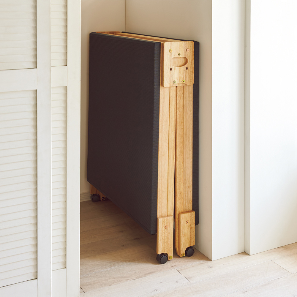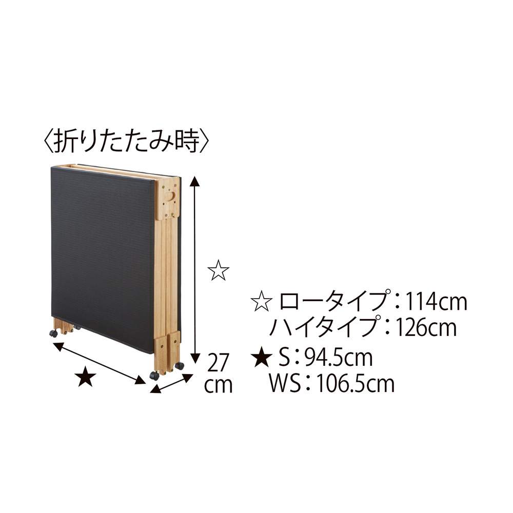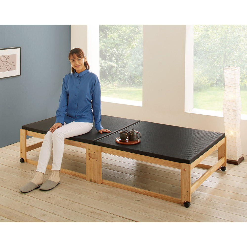 湿気から布団を守る!ラクに折りたためる!布団が干せる!干し上手になれるモダンな折りたたみベッドサラッとドライで爽やかな睡眠をお届けします!涼しい!軽い!湿気をぐんぐん放出してドライな寝心地に眠る時は湿気を逃がしてサラッと快適。日中は折りたたんで布団干しに早変わり。1台2役で24時間ジメジメ対策が出来ちゃいます。だから梅雨のカビや熱帯夜のじめじめ解消にはもちろん、冬は結露対策にもおすすめなんです!スプリングの力で折りたたみもラクラク!折りたたむときは取っ手に手を入れて持ち上げるだけ。床面の裏にスプリングが付いているので、女性の力でも楽に折りたためます。毎日の布団の上げ下ろしが大変という方、床に寝ると起き上がるのが大変という方、寝具はお布団がいいという方、和室で使いたいという方におすすめ。モダンに置ける、炭入りの樹脂製パイプの黒畳この黒畳、ただの畳ではありません。湿気に対応した炭入りの樹脂製パイプの畳なので、一年中快適に爽やかにお使いいただけます。また、樹脂製なので畳やけの心配がなく、水拭きもできます。使い慣れたお手持ちの布団も敷いてお使いいただけます。またヘッドレスタイプの畳ベットで、フローリングのお部屋でも自然な和の空間が広がります。幅も高さもお好みで選べますベッドのサイズは、シングルサイズ(幅94.5cm)とワイドシングルサイズ(幅106.5cm)の2サイズ。高さもロータイプ(高さ27cm)とハイタイプ(高さ40cm)の2つからお選びいただけます。ベッドとしての機能も充実■ベッド時は木枠で本体を支えるので安定感がズレにくく、動かす際はキャスターが地面に影響しにくい構造なので床を傷つける心配もありません。■布団を干すときは専用のストッパーで固定できます!布団を乗せたまま折りたたむことができ、窓辺に移動させて干せちゃいます!■折りたたみ時の幅はわずか27cm。ちょっとしたすき間に収納できます。作りもしっかり。安心の日本製国内の家具職人が、一点一点心を込めて丁寧に仕上げた国産折り畳みベッド。実際に女性が折りたたんでいるシーンを動画で紹介。楽々具合をぜひご覧ください。