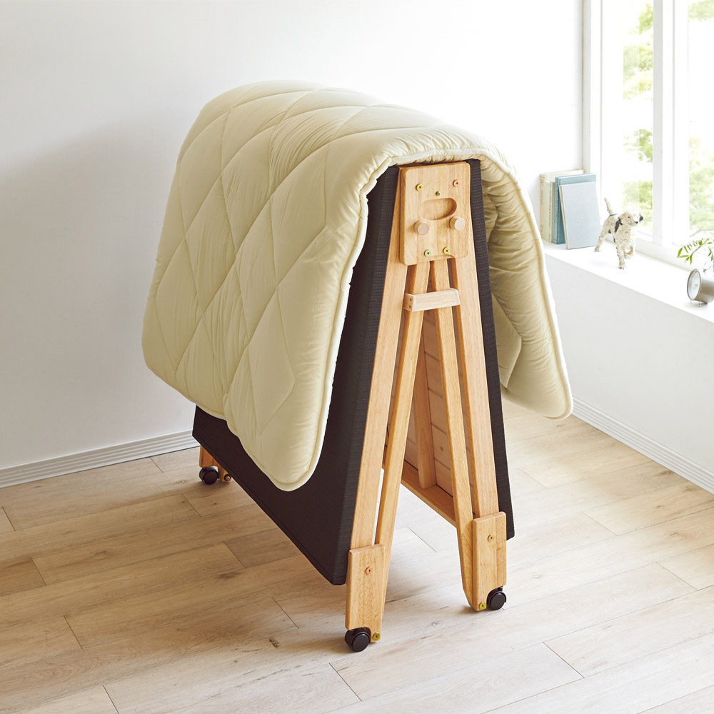 湿気から布団を守る!ラクに折りたためる!布団が干せる!干し上手になれるモダンな折りたたみベッドサラッとドライで爽やかな睡眠をお届けします!涼しい!軽い!湿気をぐんぐん放出してドライな寝心地に眠る時は湿気を逃がしてサラッと快適。日中は折りたたんで布団干しに早変わり。1台2役で24時間ジメジメ対策が出来ちゃいます。だから梅雨のカビや熱帯夜のじめじめ解消にはもちろん、冬は結露対策にもおすすめなんです!スプリングの力で折りたたみもラクラク!折りたたむときは取っ手に手を入れて持ち上げるだけ。床面の裏にスプリングが付いているので、女性の力でも楽に折りたためます。毎日の布団の上げ下ろしが大変という方、床に寝ると起き上がるのが大変という方、寝具はお布団がいいという方、和室で使いたいという方におすすめ。モダンに置ける、炭入りの樹脂製パイプの黒畳この黒畳、ただの畳ではありません。湿気に対応した炭入りの樹脂製パイプの畳なので、一年中快適に爽やかにお使いいただけます。また、樹脂製なので畳やけの心配がなく、水拭きもできます。使い慣れたお手持ちの布団も敷いてお使いいただけます。またヘッドレスタイプの畳ベットで、フローリングのお部屋でも自然な和の空間が広がります。幅も高さもお好みで選べますベッドのサイズは、シングルサイズ(幅94.5cm)とワイドシングルサイズ(幅106.5cm)の2サイズ。高さもロータイプ(高さ27cm)とハイタイプ(高さ40cm)の2つからお選びいただけます。ベッドとしての機能も充実■ベッド時は木枠で本体を支えるので安定感がズレにくく、動かす際はキャスターが地面に影響しにくい構造なので床を傷つける心配もありません。■布団を干すときは専用のストッパーで固定できます!布団を乗せたまま折りたたむことができ、窓辺に移動させて干せちゃいます!■折りたたみ時の幅はわずか27cm。ちょっとしたすき間に収納できます。作りもしっかり。安心の日本製国内の家具職人が、一点一点心を込めて丁寧に仕上げた国産折り畳みベッド。実際に女性が折りたたんでいるシーンを動画で紹介。楽々具合をぜひご覧ください。