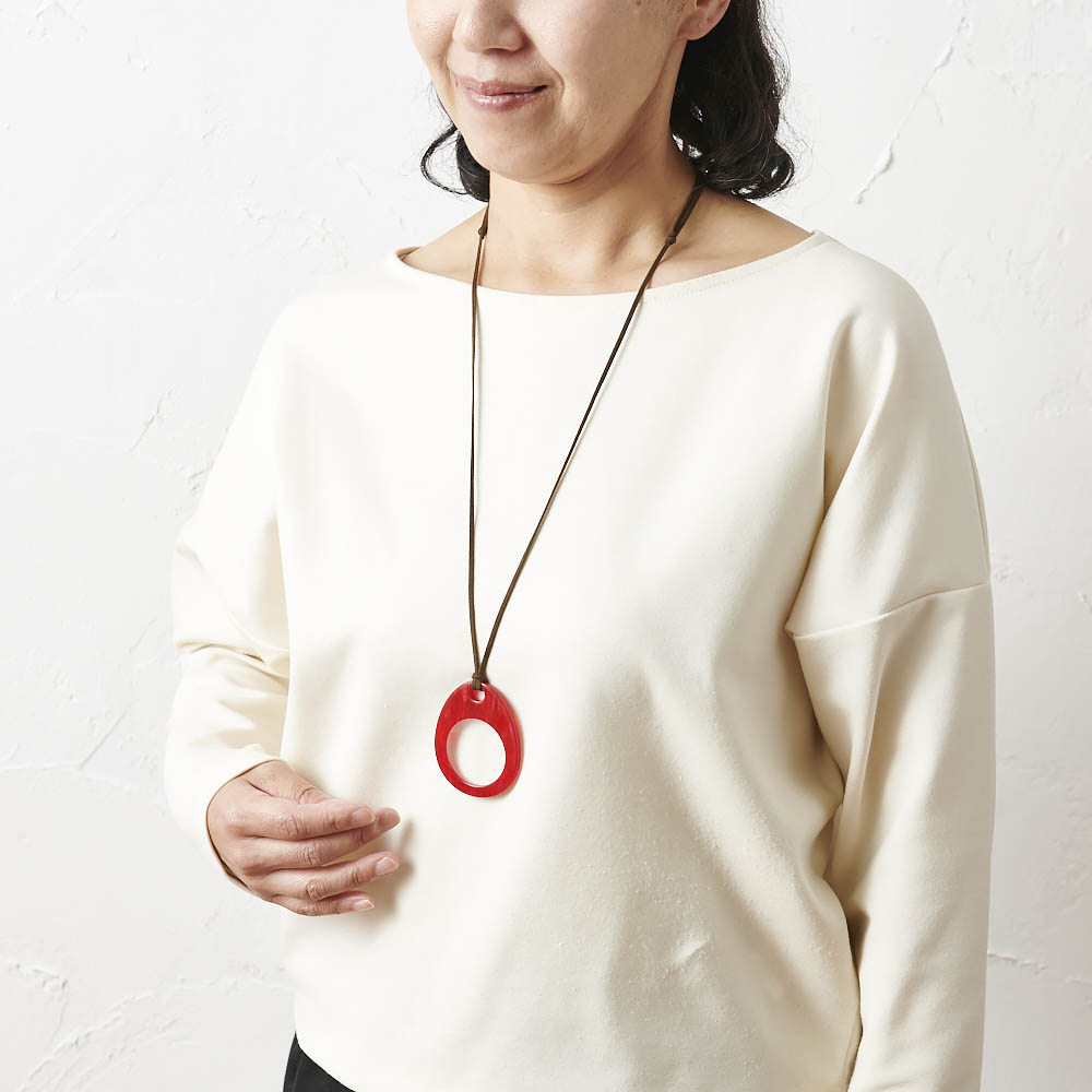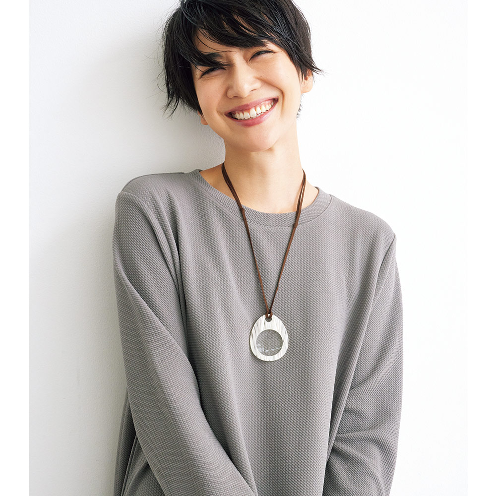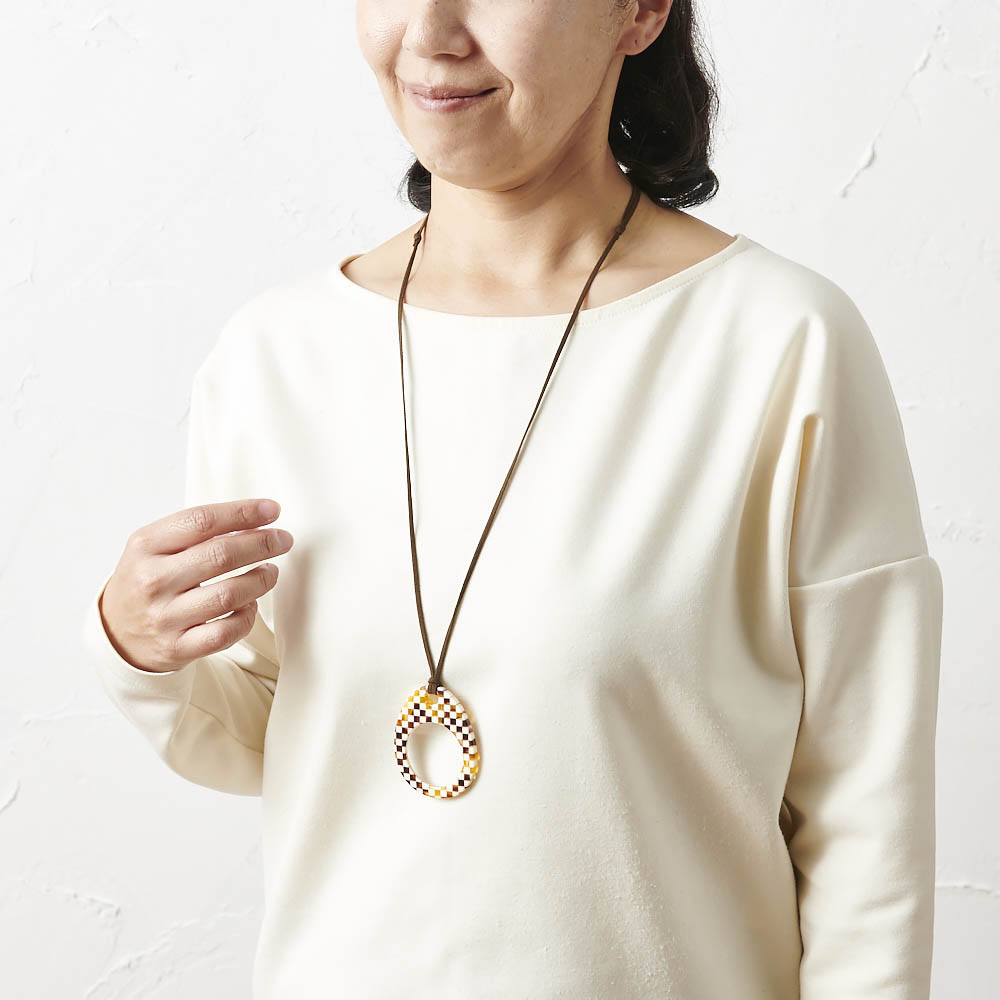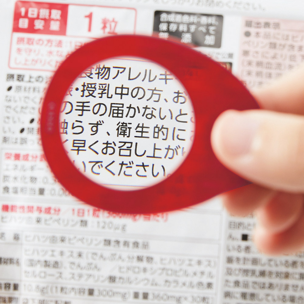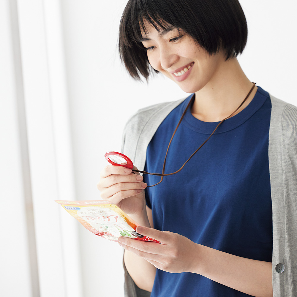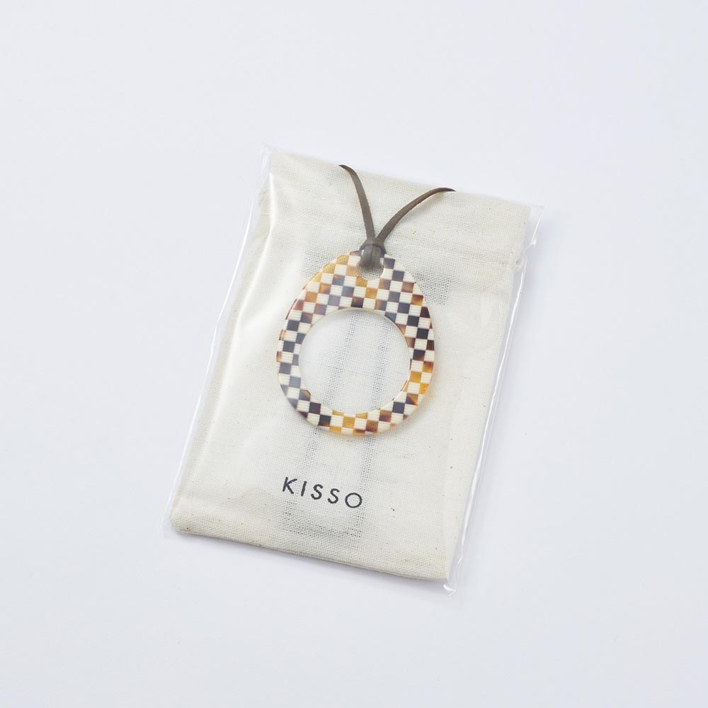 お洒落なペンダント見えするルーペは何かと便利!軽いから日常使いからおでかけまでOKイタリア製の天然素材(綿花由来)「セルロースアセテート」の色彩を活かし、普段はネックレスにして胸元をおしゃれに、必要な時にはルーペとして便利に使用できます。眼鏡のフレームやテンプルにも使われるセルロース、レンズは傷が付きにくいガラス製なのに、わずか16gと軽量で首に負担がかかりにくい。レンズの倍率は2倍で、説明書や値札など小さい文字も拡大して楽に見られます。ひもは、簡単に調節可能で、お好みの長さで着用可能。おしゃれなペンダントとして日常的に身につけながら、小さい文字や手元を確認したいときはさっとルーペとして使用できて便利です。■KISSOのアクセサリーは「セルロースアセテート」という、コットンを主原料にした天然素材由来の材料「バイオマスプラスチック」を使用して作られています。乾燥だけでも1mm約1週間が必要とされ、商品の仕上がりまでにたくさんの時間がかかっています。職人の手仕事でひとつひとつ丁寧に作られます。メガネの名産地、福井県鯖江市で製造しています。
