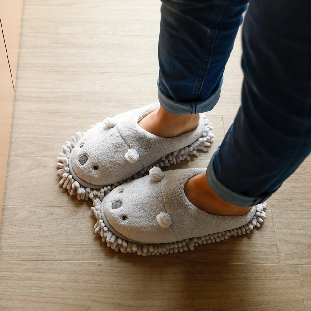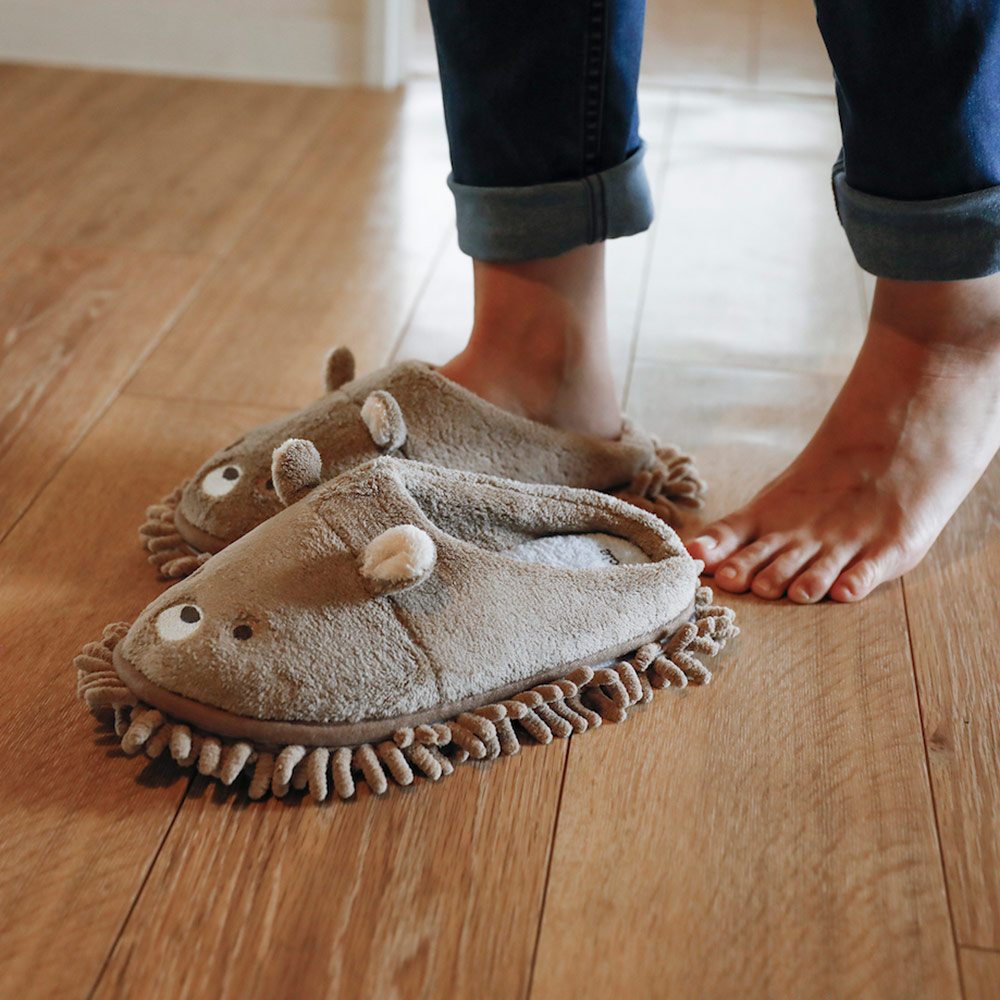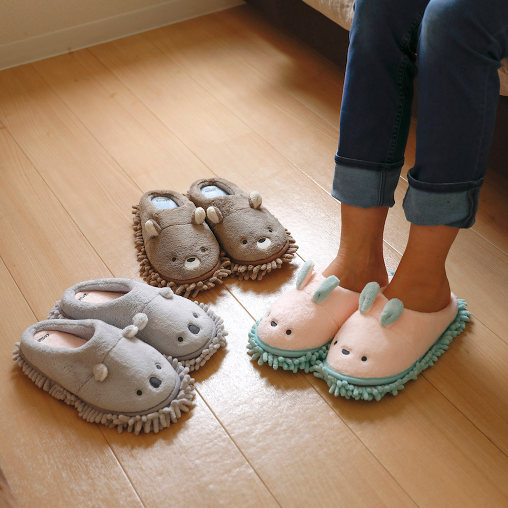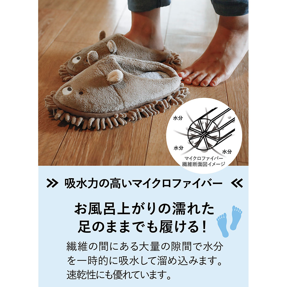 履くだけで「ながら」床掃除!履くだけで楽々床掃除が出来る、お掃除スリッパ!もじゃもじゃのモップが、ホコリも水分もキャッチしてくれます。さらに床掃除をした後は、汚れやすいモップだけ外して洗えるのでお手入れも簡単です。モップ部分の裏面がやわらかく、取り外し・取り付けがしやすいのもポイント。歩くときもカシャカシャ音が鳴りにくいタイプです。肌に触れる部分は吸水性に優れたマイクロファイバータオルを使用しているので、お風呂上がりに濡れた足でもそのまま履くことが出来ます。素足で履いたときのふわふわの肌触りは、病みつきになりそうな気持ちよさです。
