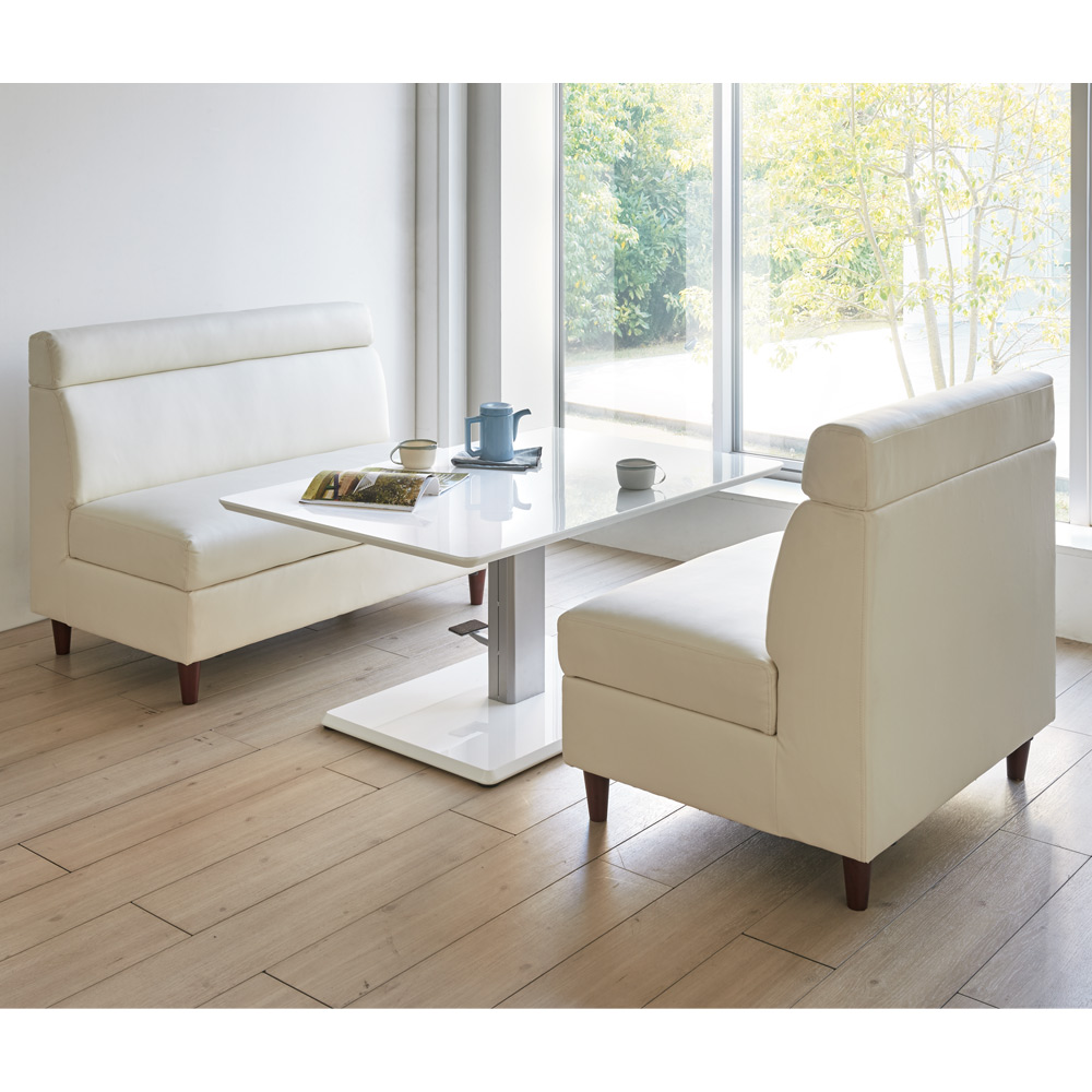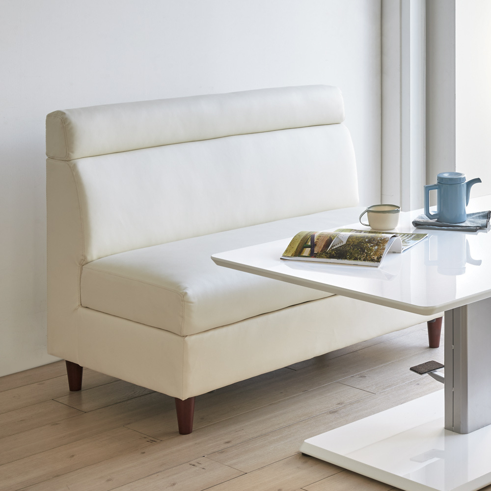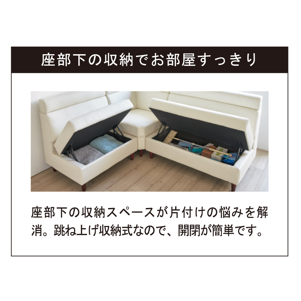 限られたスペースを有効活用できる収納スペース付きのソファ。合成皮革なので食べこぼしもさっとひと拭き!テーブルに合わせてダイニングソファとしても。【ご注意】このページはソファ幅118cm単品の販売ページです。ソファとダイニングセットを合わせておくスペースがない方にお勧めなLD兼用タイプ。リビングの主役になる家具ですので機能面にも見た目にもこだわりたいですね。たっぷりとした収納やモダンなシルエットなど、お部屋をすっきり見せる魅力満載の一品です。[ point01 ] 収納たっぷり!収納庫付ソファソファには収納たっぷりな収納庫付き。(※コーナーソファには収納庫はございません。)リビングで何かと散らばりがちな雑誌やブランケット、そのほか普段あまり使わないものをしまっておくのにぴったりです。大きめのものを入れても出し入れで手間取る心配もありません。[ point02 ] 食べこぼしも安心。合成皮革ソファでお手入れ簡単。ダイニング兼用のソファであれば心配なのは汚れです。お手入れのしやすさを考え、張地には合成皮革を使用しました。食べこぼしもさっと一拭きでなかったことに。清潔感あふれる豊かでくつろぎのダイニングづくりに一役買ってくれそうです。[ point03 ]大人のモダンさを感じさせるシンプルスマートなシルエット省スペースをかなえるLD兼用ダイニングソファですが、見た目はまるでラウンジに置いてありそうなモダンな顔。無駄のないシルエットだけでも、ますますお部屋を広々と見せてくれそうです。何かと生活感のあふれてしまうリビング・ダイニングを、このシリーズで余所行きの顔に変身させてみては?〜担当者の座り心地コメント〜座面構造は、鋼製バネの上に少し硬めのウレタンが敷きつめられていて程よい硬さが体を支えてくれます。また、収納庫付きなので雑誌やブランケットなど収納すればソファに座ったまま取り出せ、わざわざ動く必要がなくなる優れものです!!
