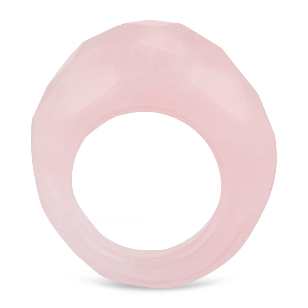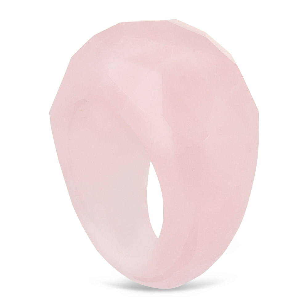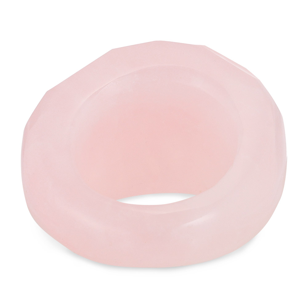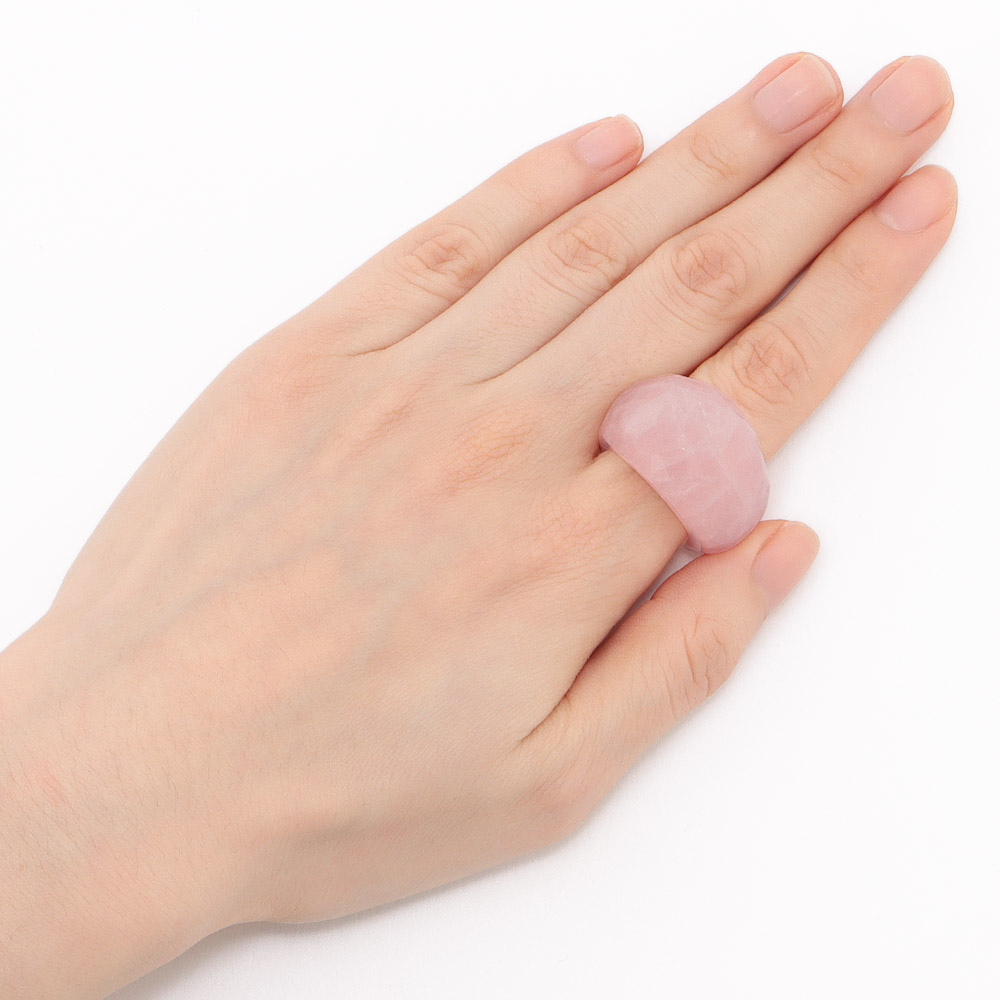 とても大きなローズクオーツの原石を贅沢に使い、職人が1個1個カットを施し、時間をかけて仕上げました。上部にだけカットを施した丸みのある立体的なリングです。ナチュラルストーンならではの味わい、石の温かみを肌で感じるアイテム。つるっとしていて指あたりも良く、カット面が動きとともにキラキラ輝きます。お手元で動かしてお楽しみください。丸ごとくり抜いているので裏抜きや引っかかりがなく、着け心地がなめらかです。