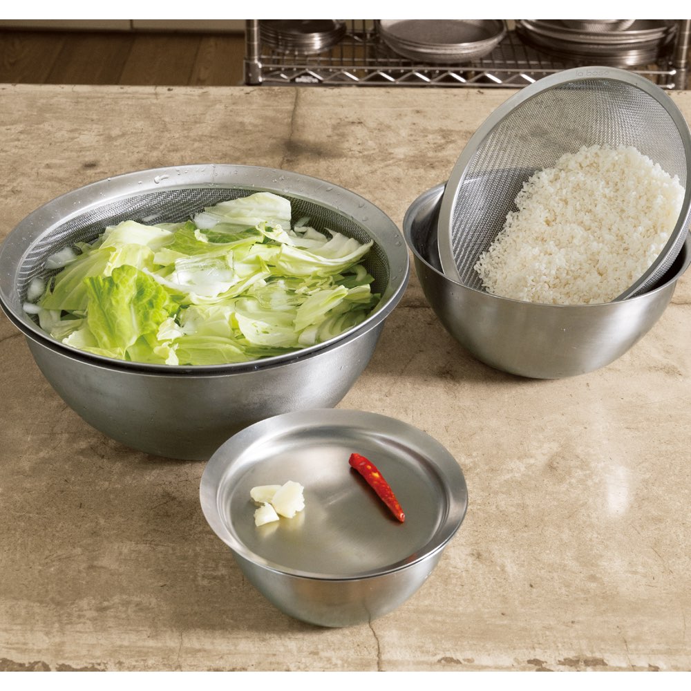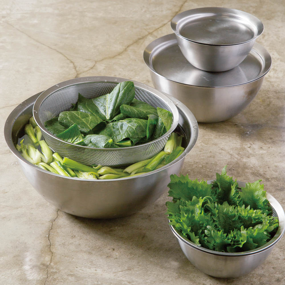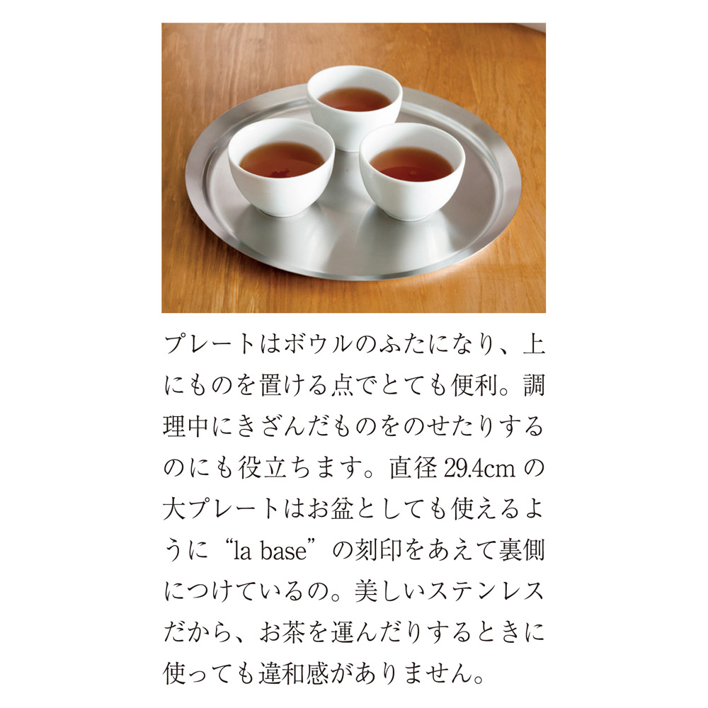 「使いやすく、洗いやすく、取り出しやすい形にこだわりました。この3サイズがあれば家庭料理には充分。ふたにもなるプレート、あるととっても便利なんです」人気料理研究家の有元葉子さんの大中小ボウル+プレート3点セット「使いやすく、洗いやすく、取り出しやすい形にこだわりました。この3サイズがあれば家庭料理には充分。」有元さんのこだわりが詰まったグッドデザイン。日本製で衛生的メーカーと一緒にボウルやざるを作るにあたって「まず第一に、汚れのたまりやすい縁の巻き込みをなくしたかった」と有元さん。巻き込みのないフチと洗練されたデザインは、使いやすさと美しさを兼ね備えています。品質も高く、衛生的に使い続けることができます。省スペースで効率的!3サイズのボウル+プレートのセットで料理上手にプレートは調理中にきざんだ薬味をのせたり、使い途中のトングや菜箸置きとしてかなり便利に使えます。ふたとして使えばラップいらずですし、冷蔵庫内でスタッキングもできて重宝です。しかし!一番のおすすめは野菜の保存。これが驚くほどの威力を発揮します!野菜をよみがえらせる、長期保存する、そのためだけにでも欲しい道具ボウルに別売りのザルを重ねて水けをきった野菜を入れ、プレートでフタをして冷蔵庫に入れておくと、いつまでも野菜が新鮮でびっくりするほど。プレートでフタをするのが最大のポイントです。ステンレスのフタなので内側がとっても冷やされ、野菜の新鮮さがキープされるようです。すぐにしなびる大葉もボウルに水を入れてザル(別売り)の間から出た茎が水に触れるようにしてプレートをかぶせて冷蔵庫に入れておけばいつまでもシャッキ!が保てます。万能サイズで多彩な料理に対応!「大ボウルは一見大きすぎるようですが、サラダをふんわり混ぜて、おいしく仕上げるにはこの大きさが必要。ハンバ―グや餃子などのお肉をこねるにもこのサイズが便利です」ラバーゼシリーズで作業効率アップ!ザルとボウルのコンビネーション別売りのザルやプレートと組み合わせることで、使い勝手がさらに向上します。特にラバーゼシリーズのザルとボウルを重ねて米を研ぐと、水を注ぐ、米を研ぐ、水を流すという一連の動きがスムーズに行えます。la baseについてla base(ラバーゼ)とはイタリア語で“基本”や“基礎”という意味。上質な基本の料理道具をコンセプトに、料理研究家・有元葉子さんが考案、日本の生産技術から生まれたキッチンウェアブランドです。料理研究家 有元葉子さん100冊以上の著書を持ち、雑誌やテレビなど幅広く活躍。おいしい料理はもちろん、長く使える本当にいいものを見る目や、すっきりとした快適な暮らしぶりに憧れるファンが多い。使いやすく手入れがラクでデザインが美しい、台所道具のシリーズ『ラバーゼ』のディレクター。