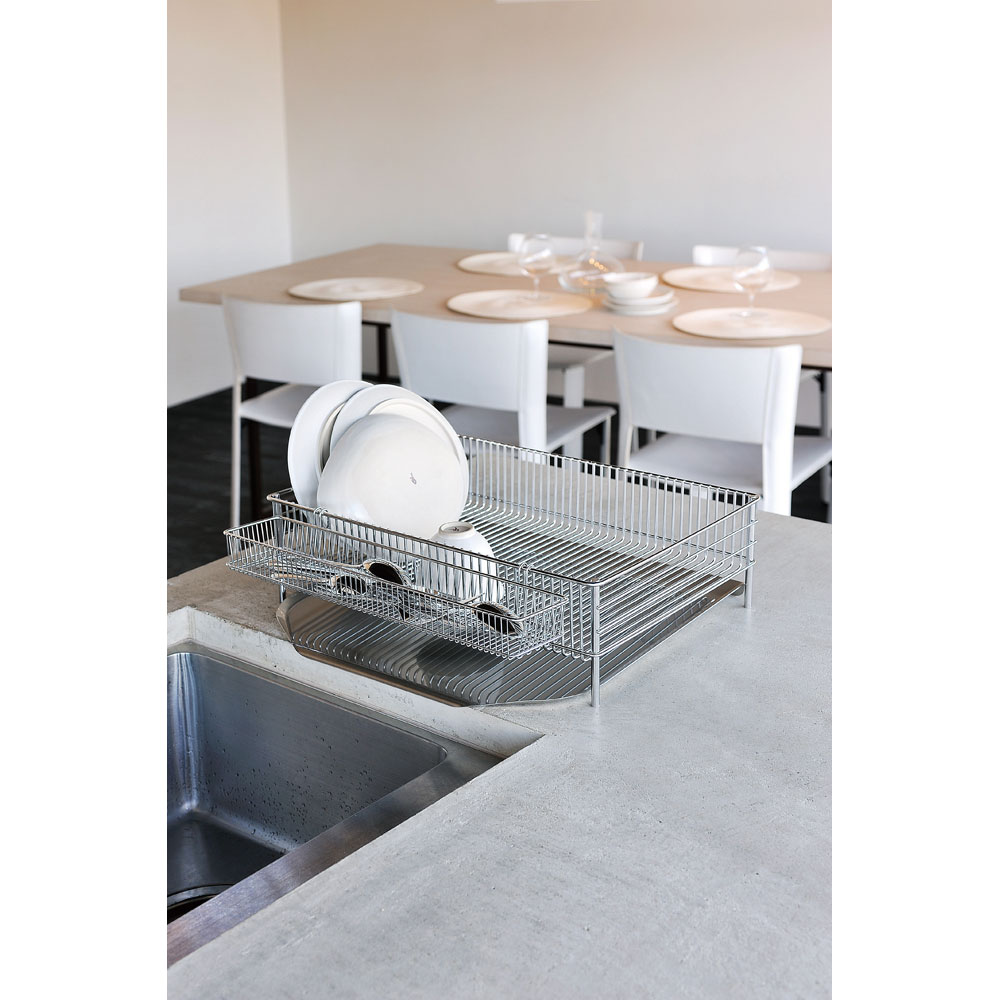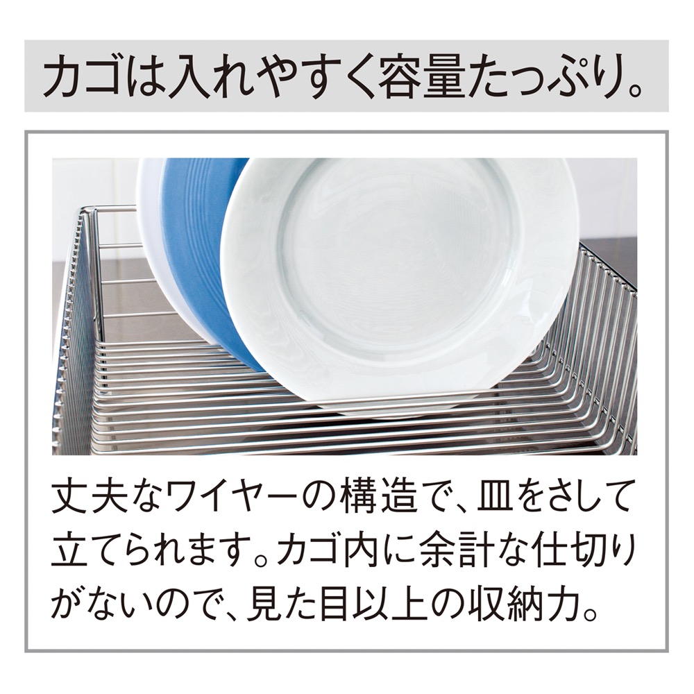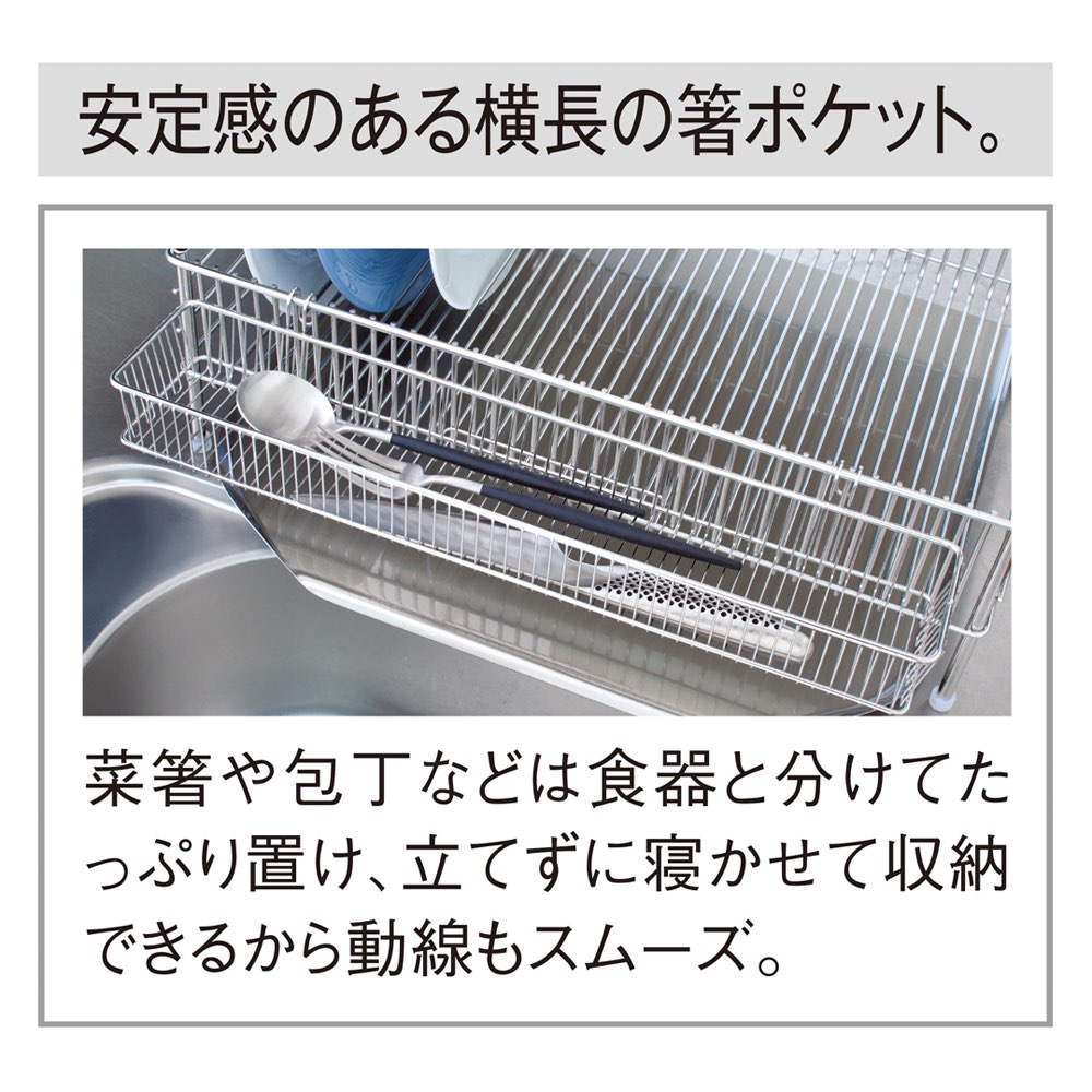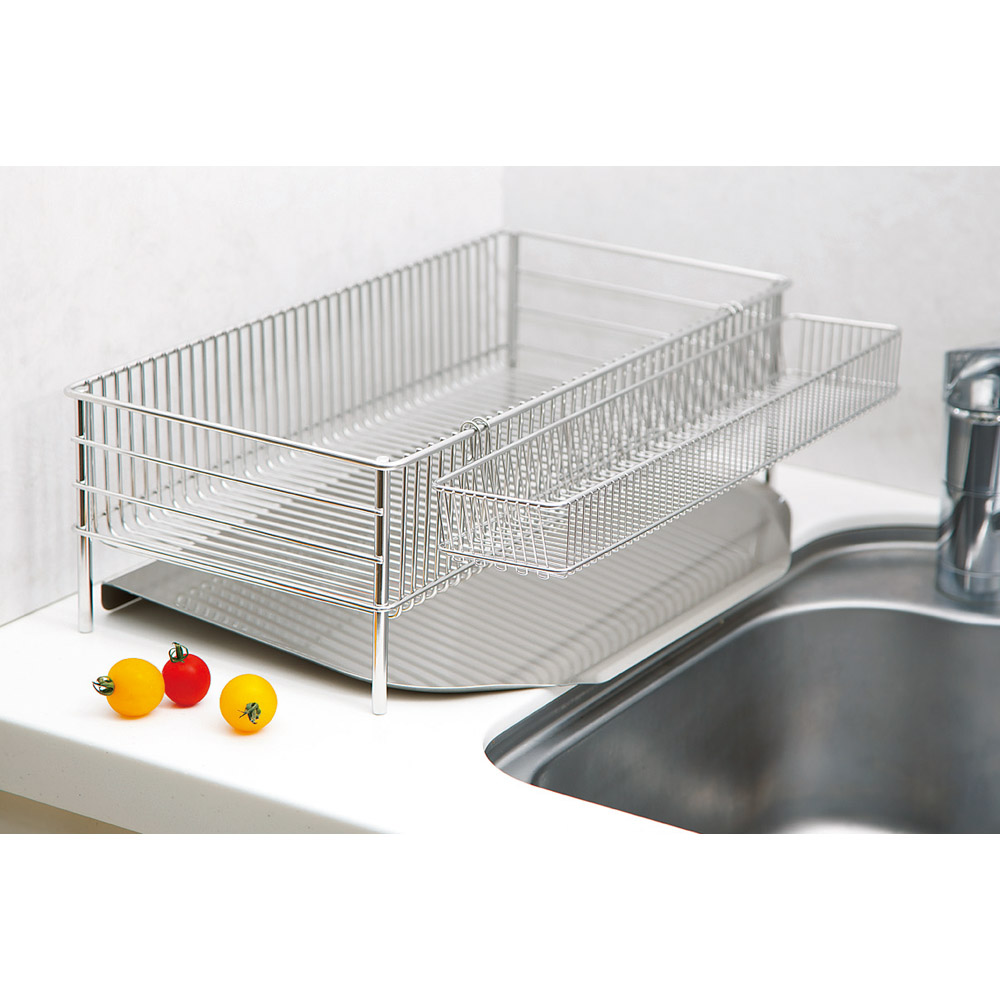 人気料理研究家の有元葉子さんが、プロの目線から本当に使いたいものを追求して開発した大ヒット水切りです。人気料理研究家の有元葉子さんプロデュースメイドインジャパンを誇る、美しく使いやすい水切りかご。人気料理研究家の有元葉子さんが、プロの目線から本当に使いたいものを追求して開発されました。高品質ワイヤーならではの美しさと耐久性も評判で、使用するとさらに良さが実感できます。ご自宅のシンク周りの使い勝手に合わせて、5つのサイズからお選びいただけます。下部の「シリーズ商品のご案内」から、シンクに対して置く向きをよくご確認の上、ご注文ください。 「いつかはラバーゼ」ーそう言われる納得の理由水切れのよさや食器の出し入れのしやすさ、お手入れのしやすさなどのこだわりが満載。衛生的で使いやすい、ラバーゼの水切りかごのヒミツをご紹介します。(1)シンプルな形で大容量底に溶接部分が無いので汚れがたまらず、清潔を保ちやすい形状。かごの深さを浅めにする事によって、食器の出し入れがしやすくなりました。底はワイヤーが縦にまっすぐ通っているだけのシンプルなデザインで、ワイヤーのピッチが細かくフラットなので、皿が立てやすく、グラスを置いた時の安定性に優れています。さらにワイヤー間隔の細かい専用のポケットを使えば、箸や調理ベラ、小さな道具を分別できます。(2)衛生を保ち、永く使えるラバーゼの水切りかごに使用されている18-8ステンレス素材は、サビにくく、水と反応してにおいを分解する特徴があり、非常に衛生的な素材です。さらに、トレーが斜めに傾いているので洗い物の水がトレーにたまらず、自然にシンクに流れ落ちます。トレーのフチには巻き込みが無いので汚れがたまりににくく洗いやすいので常に清潔を保てます。洗い物が終わったらトレーを布巾でさっと一拭きするだけと、お手入れも簡単です。■la baseについてla base(ラバーゼ)とはイタリア語で“基本”や“基礎”という意味。上質な基本の料理道具をコンセプトに、料理研究家・有元葉子さんが考案、日本の生産技術から生まれたキッチンウェアブランドです。