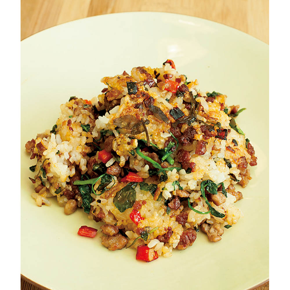 「底面の広い鉄のフライパンだからこそ、香ばしい焼きめしができるんです。肉にしみこませたしょうゆの味つけだけで、ご飯がおいしく食べられます」
