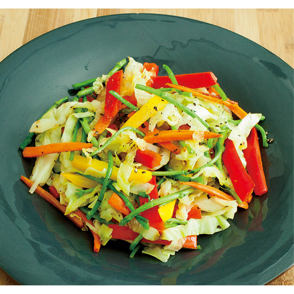 「フライパンの底に野菜を広げたら、あまりいじらずに焼くようなつもりで炒めます。高温の鉄のフライパンで短時間で炒めた野菜は、色鮮やかで、とにかく甘い!」