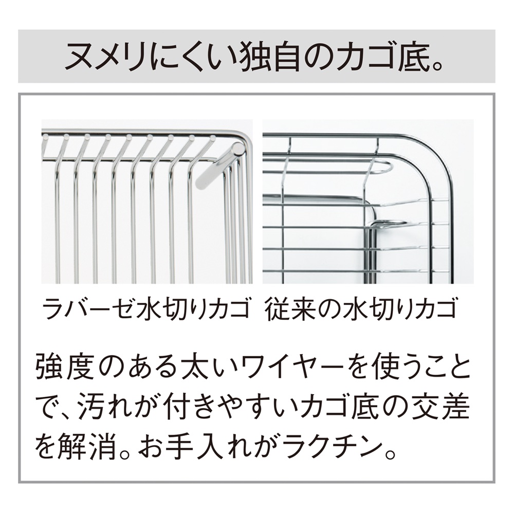 人気料理研究家の有元葉子さんが、プロの目線から本当に使いたいものを追求して開発した大ヒット水切りです。人気料理研究家の有元葉子さんプロデュースメイドインジャパンを誇る、美しく使いやすい水切りかご。人気料理研究家の有元葉子さんが、プロの目線から本当に使いたいものを追求して開発されました。高品質ワイヤーならではの美しさと耐久性も評判で、使用するとさらに良さが実感できます。ご自宅のシンク周りの使い勝手に合わせて、5つのサイズからお選びいただけます。下部の「シリーズ商品のご案内」から、シンクに対して置く向きをよくご確認の上、ご注文ください。 「いつかはラバーゼ」ーそう言われる納得の理由水切れのよさや食器の出し入れのしやすさ、お手入れのしやすさなどのこだわりが満載。衛生的で使いやすい、ラバーゼの水切りかごのヒミツをご紹介します。(1)シンプルな形で大容量底に溶接部分が無いので汚れがたまらず、清潔を保ちやすい形状。かごの深さを浅めにする事によって、食器の出し入れがしやすくなりました。底はワイヤーが縦にまっすぐ通っているだけのシンプルなデザインで、ワイヤーのピッチが細かくフラットなので、皿が立てやすく、グラスを置いた時の安定性に優れています。さらにワイヤー間隔の細かい専用のポケットを使えば、箸や調理ベラ、小さな道具を分別できます。(2)衛生を保ち、永く使えるラバーゼの水切りかごに使用されている18-8ステンレス素材は、サビにくく、水と反応してにおいを分解する特徴があり、非常に衛生的な素材です。さらに、トレーが斜めに傾いているので洗い物の水がトレーにたまらず、自然にシンクに流れ落ちます。トレーのフチには巻き込みが無いので汚れがたまりににくく洗いやすいので常に清潔を保てます。洗い物が終わったらトレーを布巾でさっと一拭きするだけと、お手入れも簡単です。■la baseについてla base(ラバーゼ)とはイタリア語で“基本”や“基礎”という意味。上質な基本の料理道具をコンセプトに、料理研究家・有元葉子さんが考案、日本の生産技術から生まれたキッチンウェアブランドです。