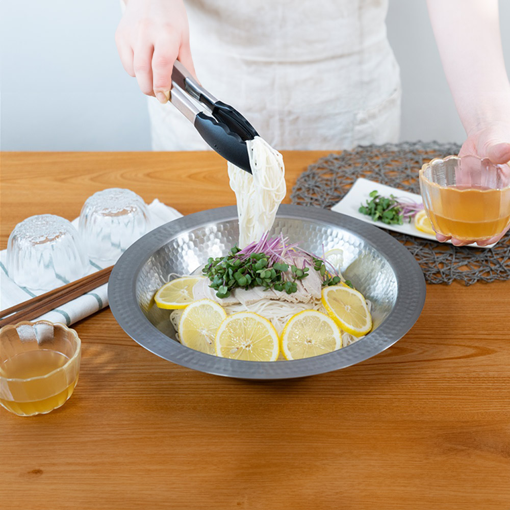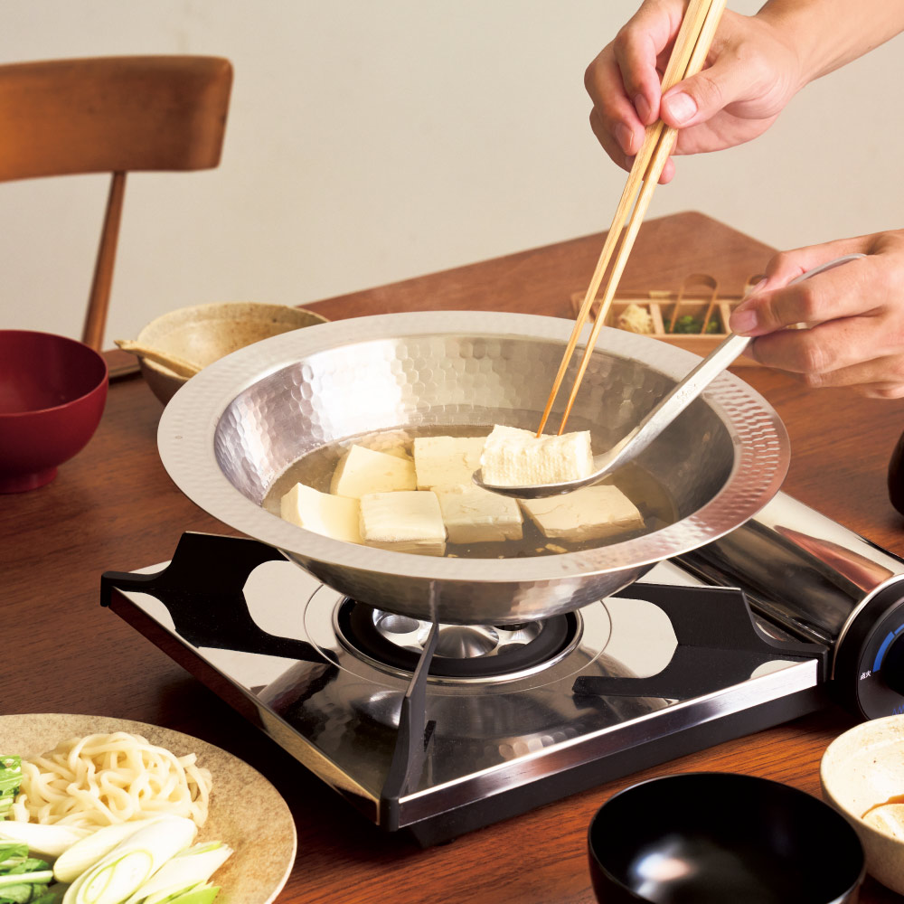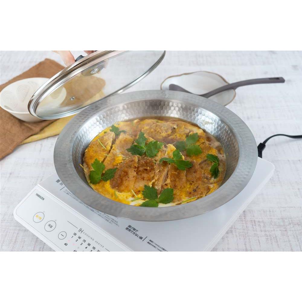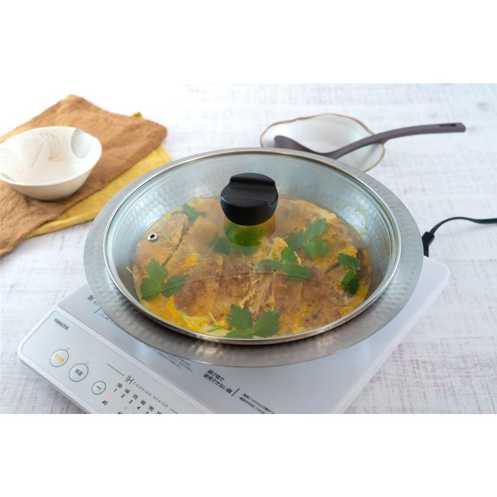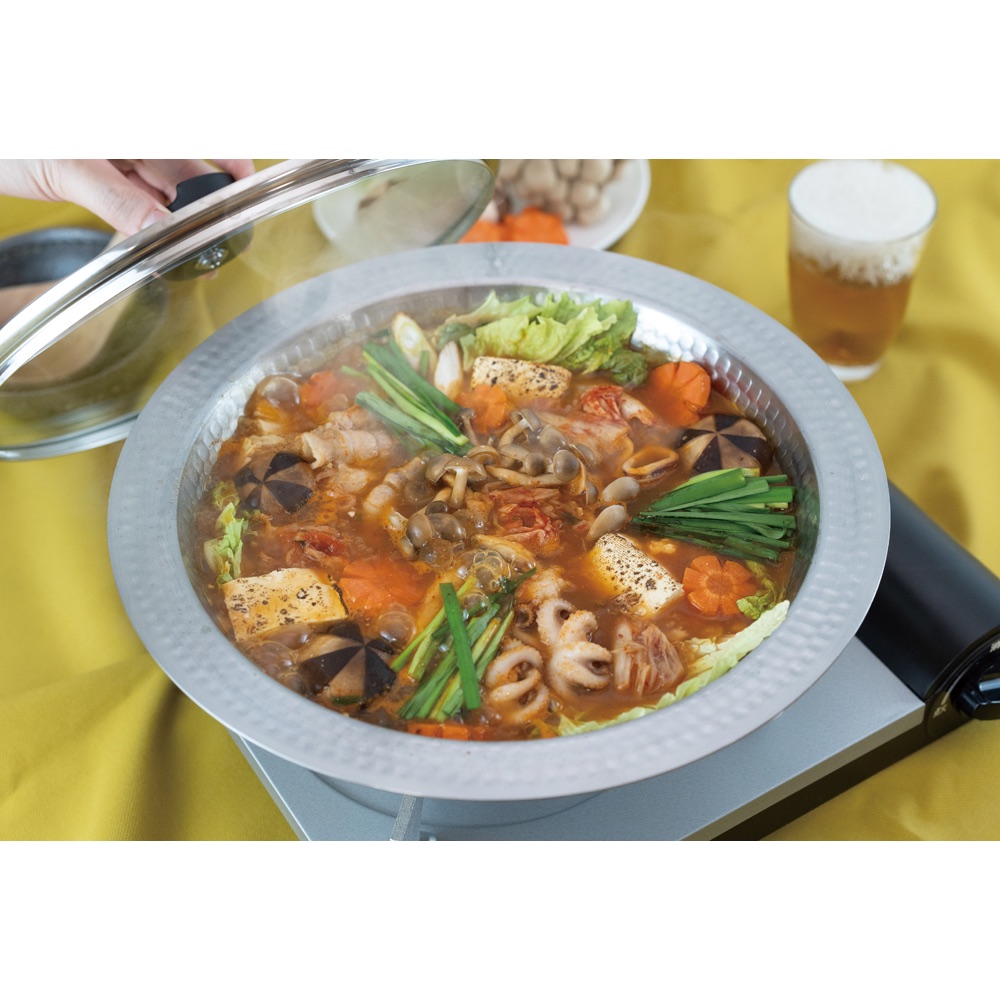 軽くて熱伝導も高いステンレス製鍋なら、お手入れラクで気軽に鍋料理が。ガス火・IHでご使用可能です。 ガスでもIHでも使える軽くて扱いやすいお鍋です継ぎ目のない高級感のあるステンレス製の鍋は、土鍋のように割れたり匂いが移る心配もなく、軽くてお手入れも簡単です。見やすいガラス蓋つきで、直火にもIHにも対応します。新潟・燕三条で製造。熱伝導率アップの為の槌目が美しく高級感があります重厚な光沢のあるステンレス製。つなぎ目がないので高級感があり、お手入れも簡単です。土鍋と違い割れる心配もなく本体は690g(径26cmタイプの場合)と比較的軽量なので長くご愛用いただけます。使いやすいデザイン具材が中に沈みこまないように底が浅く、麺を取り出す際に汁が飛びにくいよう、縁部分が広く水平に設計されてます。ステンレス製なので保温性・保冷性が高く大皿としても活躍しますお鍋以外にもサラダや素麺などのお皿としても活躍します。冷たいまま美味しくいただけます。また、中華料理とも相性がよくたっぷりのエビチリや麻婆豆腐、青菜の炒め物のお皿としても使えます。バイヤーおススメ。使ってみましたまず見た目がとってもかっこいい!これで鍋をすると、まるでお店のようで気分が上がります♪それでいて、とても軽くて扱いやすくて割れないので、お鍋をする機会がとても増えました。土鍋だと匂い移りが気になるもつ鍋やトマト鍋、カレー鍋もステンレス製なら気軽に作れます。底は平らなので食卓で使用するカセットコンロの上でも安定感は◎でした。 取っ手がないので持ち運びにくいのでは、と思いましたが、フチを持ては簡単に運べます。(ただし熱くなるのでミトンなどお忘れなく!)