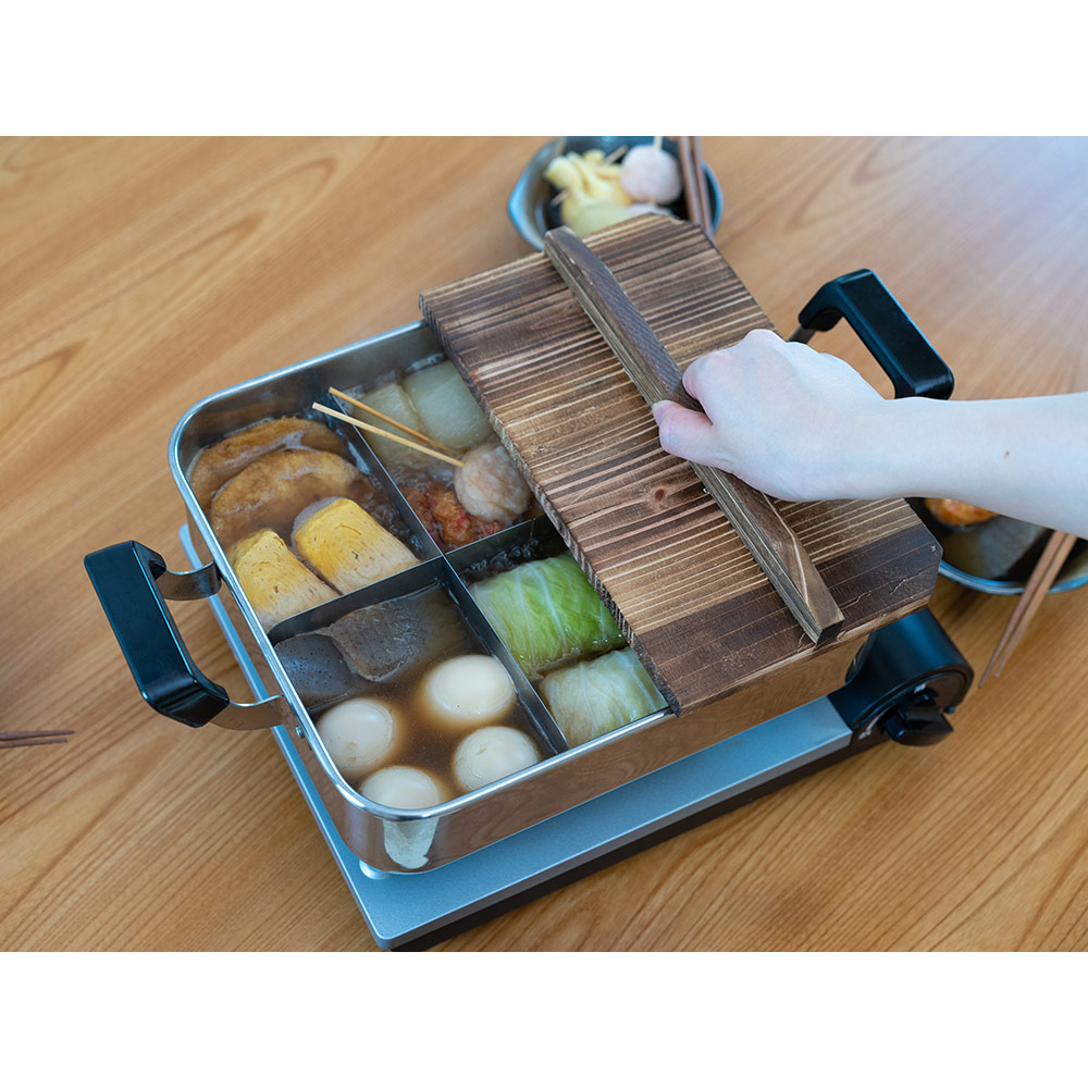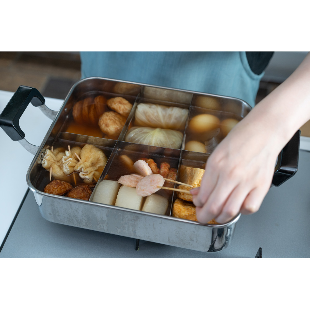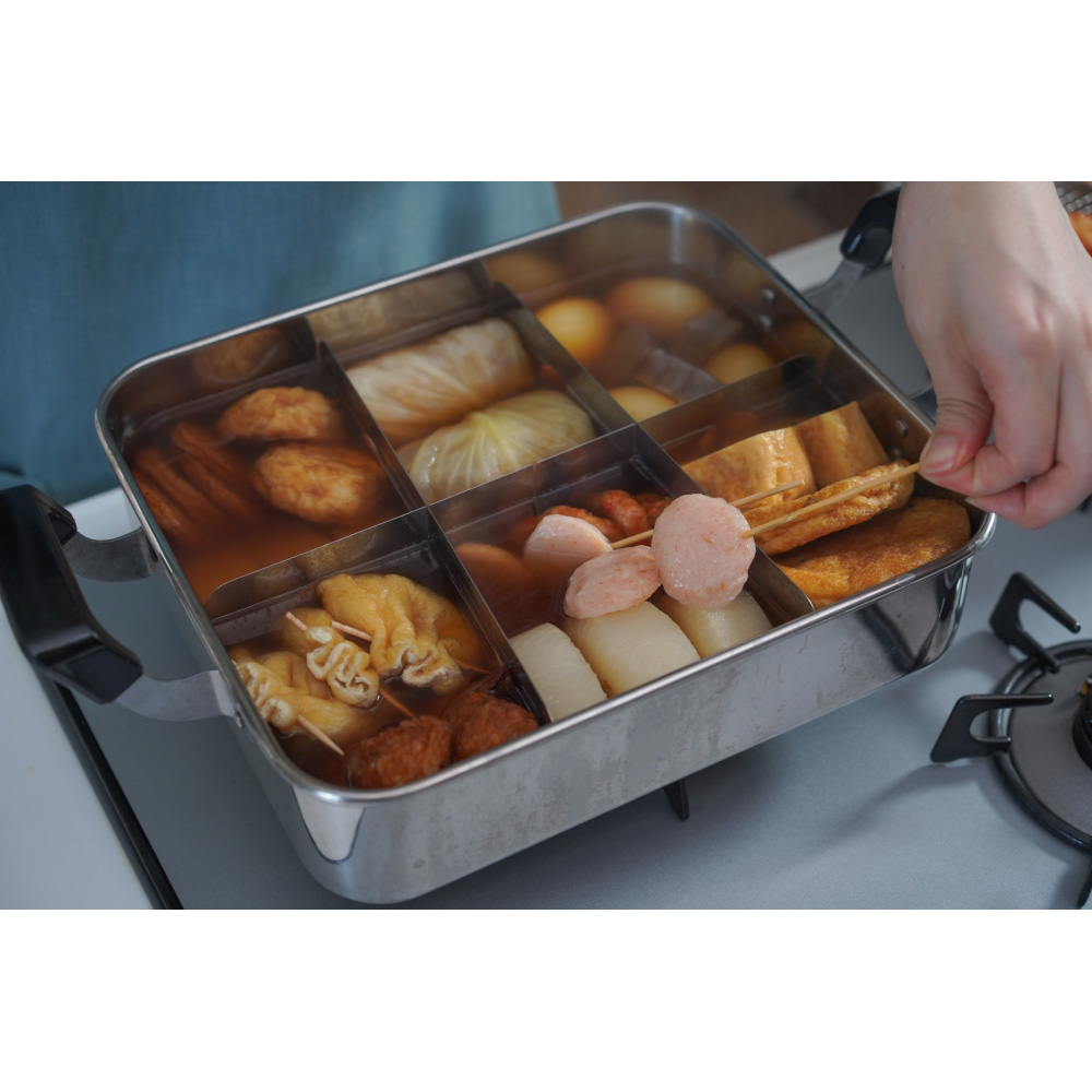 まるで屋台のような本格的なおでん鍋!まるで屋台のような本格的なおでん鍋珍しい四角い形の鍋に仕切りがついて、木製のふたまで揃っている本格的なおでん鍋。おでんは一度にたくさん作ってしまいたいですが、大鍋だと色んな具材がぐちゃぐちゃに混ざってしまいがち。お店のような仕切りがあるこの鍋で分けて煮れば見た目もすっきり美しく、屋台のように楽しくいただくことができます。メインはおでんですが、仕切りを外せば大きな四角い鍋として使えるので、煮魚なども作りやすいです。鍋は丈夫なステンレス製で、ふたは風情ある木蓋です。