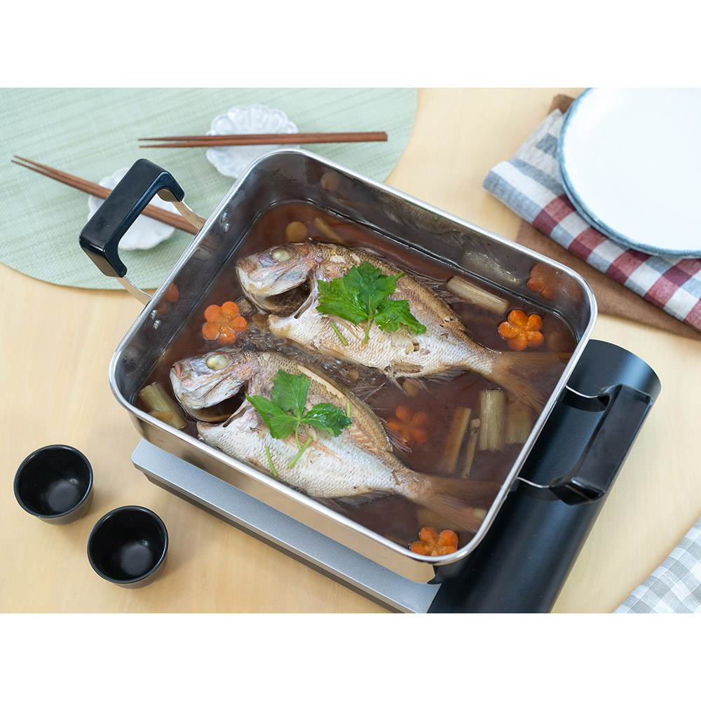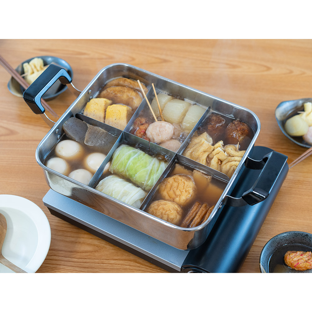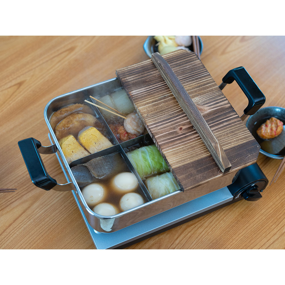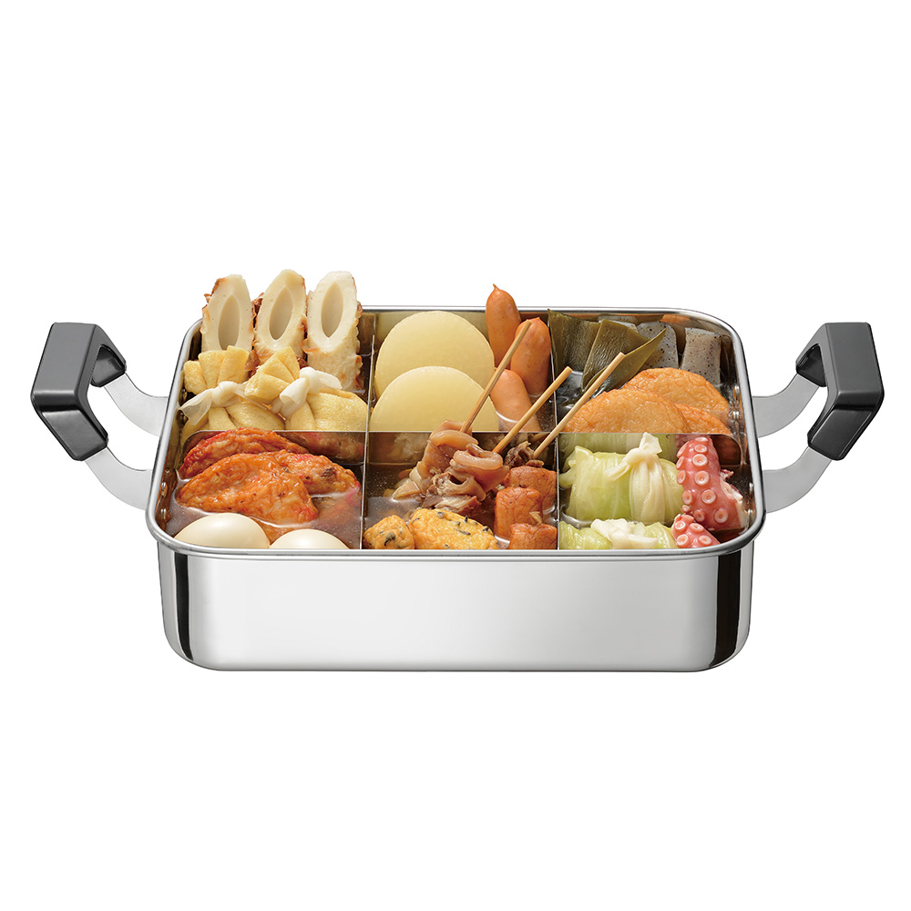 まるで屋台のような本格的なおでん鍋!まるで屋台のような本格的なおでん鍋珍しい四角い形の鍋に仕切りがついて、木製のふたまで揃っている本格的なおでん鍋。おでんは一度にたくさん作ってしまいたいですが、大鍋だと色んな具材がぐちゃぐちゃに混ざってしまいがち。お店のような仕切りがあるこの鍋で分けて煮れば見た目もすっきり美しく、屋台のように楽しくいただくことができます。メインはおでんですが、仕切りを外せば大きな四角い鍋として使えるので、煮魚なども作りやすいです。鍋は丈夫なステンレス製で、ふたは風情ある木蓋です。