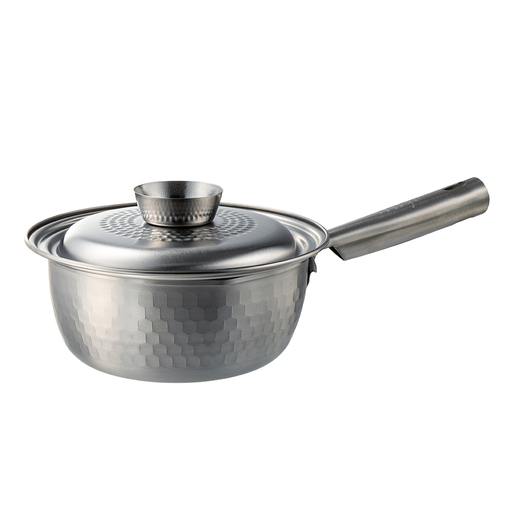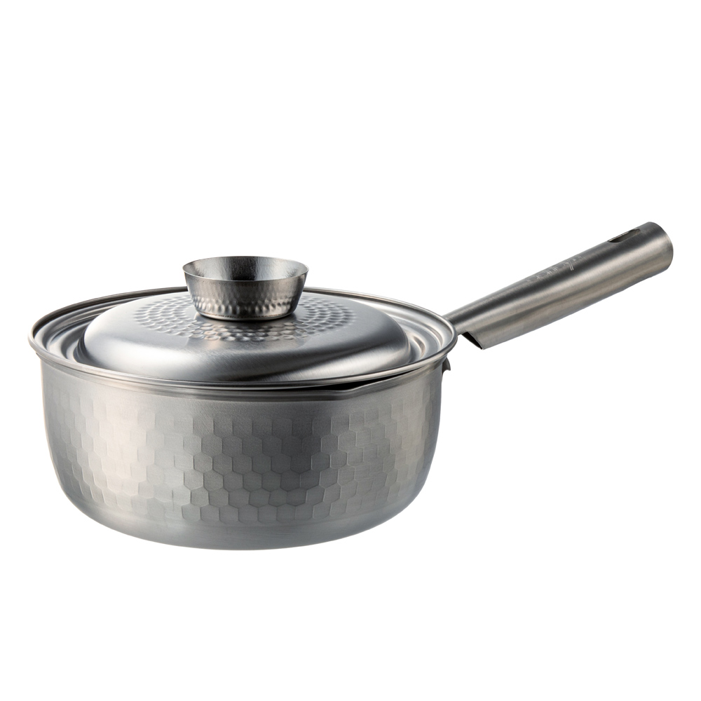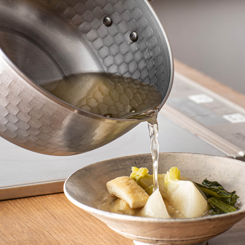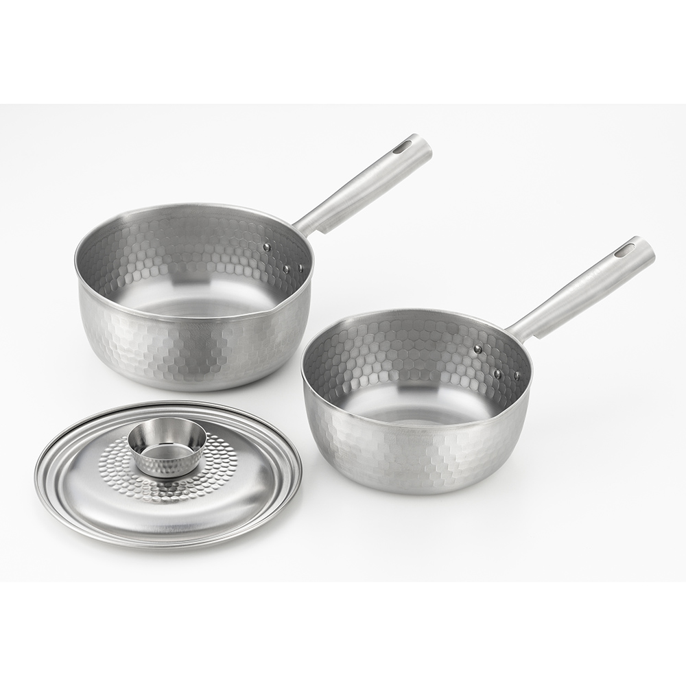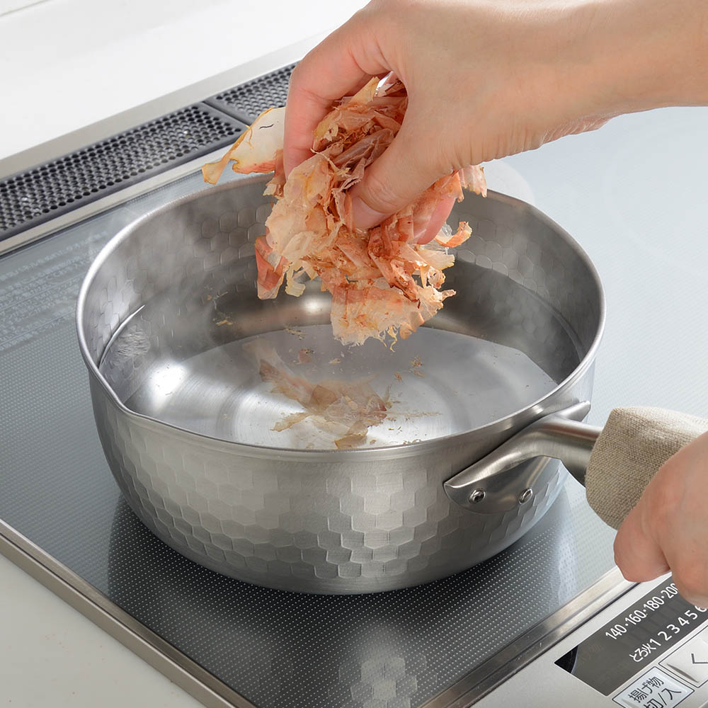 ニッポンの万能鍋、雪平が丈夫なステンレスでさらに使いやすく。燕三条製です。昔から日本の生活に馴染んできた雪平鍋が進化。雪平鍋はさっと仕立てる味噌汁や色よく茹でた野菜のおひたしなど、手早く火を通して仕上げることの多い和食作りに使い勝手のよいお鍋として古くから愛されてきました。雪平といえばアルミ製が多い中、こちらの鍋はステンレス製。さびにくく、丈夫なので、長くお使いいただけます。匂いや色も移りにくく、お手入れも簡単です。登場頻度の高い片手鍋だからこそ、長く使える仕様がうれしいですね。作れる料理の幅が広がります。アルミ鍋は素早く熱が伝わるので沸騰するのも早く、手早く火を通して仕上げることの多い和食作りで活躍してきました。一方でステンレス鍋は一度温まると熱が逃げにくいので、高い温度をキープする煮込み料理などに適しています。酸性とアルカリ性にも強いので、トマト煮込みも気兼ねなく作れます。さらにガスコンロでもIHヒーターでも使えて便利。現代の生活にマッチしたお鍋です。お料理上手になった気分になれる本格的な見た目。昔ながらの「打ち出し」をイメージした槌目模様。取っ手までステンレスで玄人感が漂います。食と暮らしを豊かにするメディア「dancyu」とのコラボ商品。ステンレス製品の扱いが得意な燕三条製です。3点セットはうれしいフタ付きです!使い勝手のよい18cm(単品)と18cm+メイン料理作りに適した20cm+フタの3点セットが選べます。18cmは2〜3人の味噌汁やスープに最適な定番サイズ。20cmは2人前の肉じゃがなどの煮物、切り身の煮魚にちょうどよいサイズ感。お味噌汁なら3〜4人前です。フタは18cmにも20cmにも対応する兼用フタ。