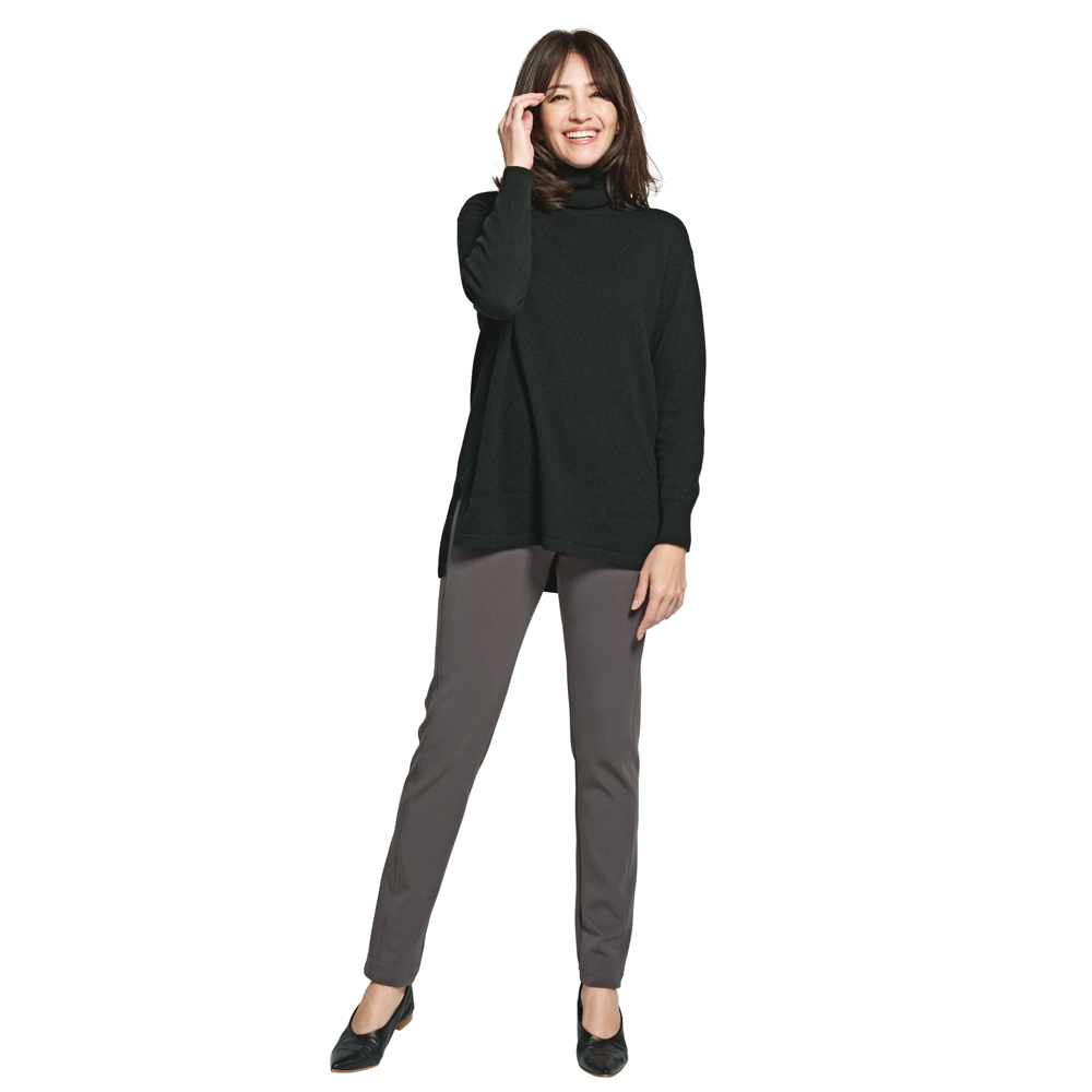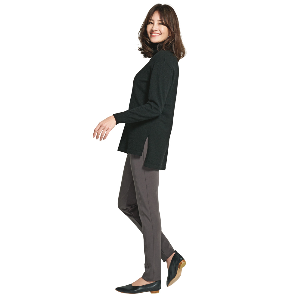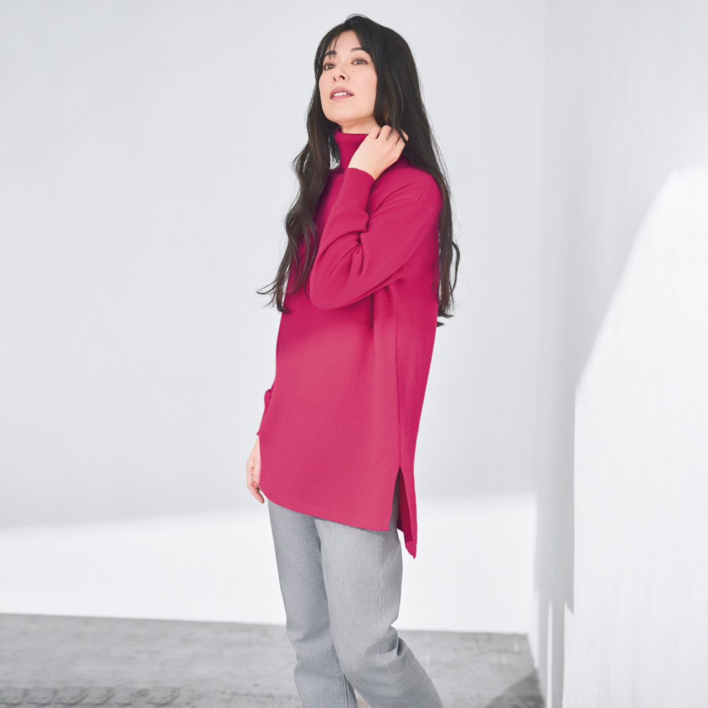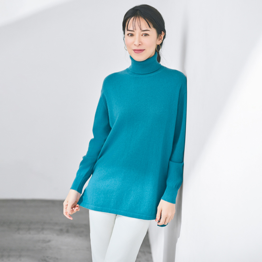 CASHMERE LIFE− カシミヤで過ごす毎日。−「着ていて気持ちがいい服」しか、もう欲しくない大人の私たち。冬は毎日、上質なカシミヤの洋服で過ごしたい。綺麗な色、元気な配色、旬のデザイン、ほっそり見えるシルエットを「And」がご紹介します。上質に包み込まれる安心感。優しい気持ちになれる服見るからに上質な柔らかさのカシミヤのチュニック。ゆったりとして華やかなタートルネック、ゆとりのある身幅、前後差をつけて脚が長く見える&お尻がすっぽり隠れるデザインなど、大人の女性を美しく見せる計算づくの一枚です。両脇に入れたスリットで軽さを出し、袖口はたくし上げやすいリブ仕様。定番カラーもカラフルな色も素敵で、冬のお洒落が楽しくなります。10シーズンも愛され続けて「And」が「オルドス」社のカシミヤにこだわる理由世界トップクラスのカシミヤ生産地として名高い、中華人民共和国内モンゴル自治区にあるオルドス市。この地に生きる人たちは、古くからカシミヤ山羊の飼育を行ってきました。冬にはマイナス20度以下になるという過酷な地で大切に育てられたカシミヤ山羊の毛は、細く長く、保湿性の高いうぶ毛に覆われています。中でも希少とされる、曇りのない白い山羊毛“ホワイトカシミヤ”だけを厳選しているのが「And」のこだわりです。カシミヤの品質の高さは、原毛そのもののクオリティによるところが約7割。残りの3割が生産技術の高さによると言われています。「And」がパートナーシップを組んで今季で10シーズン目となる「オルドス」社は、30年以上も前に、原毛の紡績から製品の仕上げまで、すべてを自社で一貫生産する体制を始めました。SDGsに取り組みつつ、流通コストの削減によるコストパフォーマンスのよさで、世界中に流通する上質なカシミヤ製品を手がけるメーカーです。「And」のカシミヤがこれほどまでにご好評いただいているのは、「オルドス」社のカシミヤのとろけるような柔らかな風合い、優しい暖かさを皆様が認めてくださっているから。今季もお気に入りの素敵なニットたちと、どうぞ気持ちのいいシーズンをお過ごしください。カシミヤを自宅で洗おうHOW TO CARE FOR CASHMERE カシミヤは、実は自宅で洗うことができるのです。ポイントを掴めば難しいことは一切なく、簡単にサッと手洗いすることで、大切なニットの柔らかな風合いが長持ちしてくれます。01 大判のタオルで包むカシミヤの繊維にとって摩擦は大敵。最小限に抑えるために、大判タオルに衣類をはさみ、ロール状に包んでからネットに入れます。02 桶に水と洗剤を入れる洗い桶に常温の水をはり、ウール用洗剤を入れてよく泡立てます。03 一枚ずつ「押し洗い」1を2にひたし、両手で優しく押し洗いします。短時間でOKです。摩擦を抑えるため、カシミヤ衣類は一枚ずつ洗うのが鉄則。04 すすぎ→柔軟剤3を一度すすいで、桶に新しい水をはり、柔軟剤を加えてカシミヤ衣類をひたします。油分を補って、繊維を保護します。05 洗濯機で脱水する脱水で完全に水気を取ります。ドラムに衣類が張り付き、遠心力で水分が飛ぶ脱水は、タオルなどで絞るよりも実は繊維に優しい。06 日陰で干す風通しのよい日陰に平干しし、自然乾燥します。半絞りの状態で吊るして干すと、水分の重みで編み地が伸びてしまうのでご注意を。