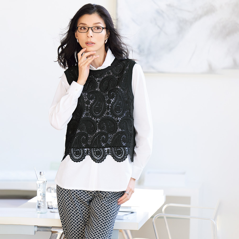 (ア)ホワイト コーディネート例 /新鮮味のある短丈のレースジレを重ねるだけで、ベーシックなシャツの着こなしが今どきの表情に一新!オフィススタイルにも新風を吹かせて。