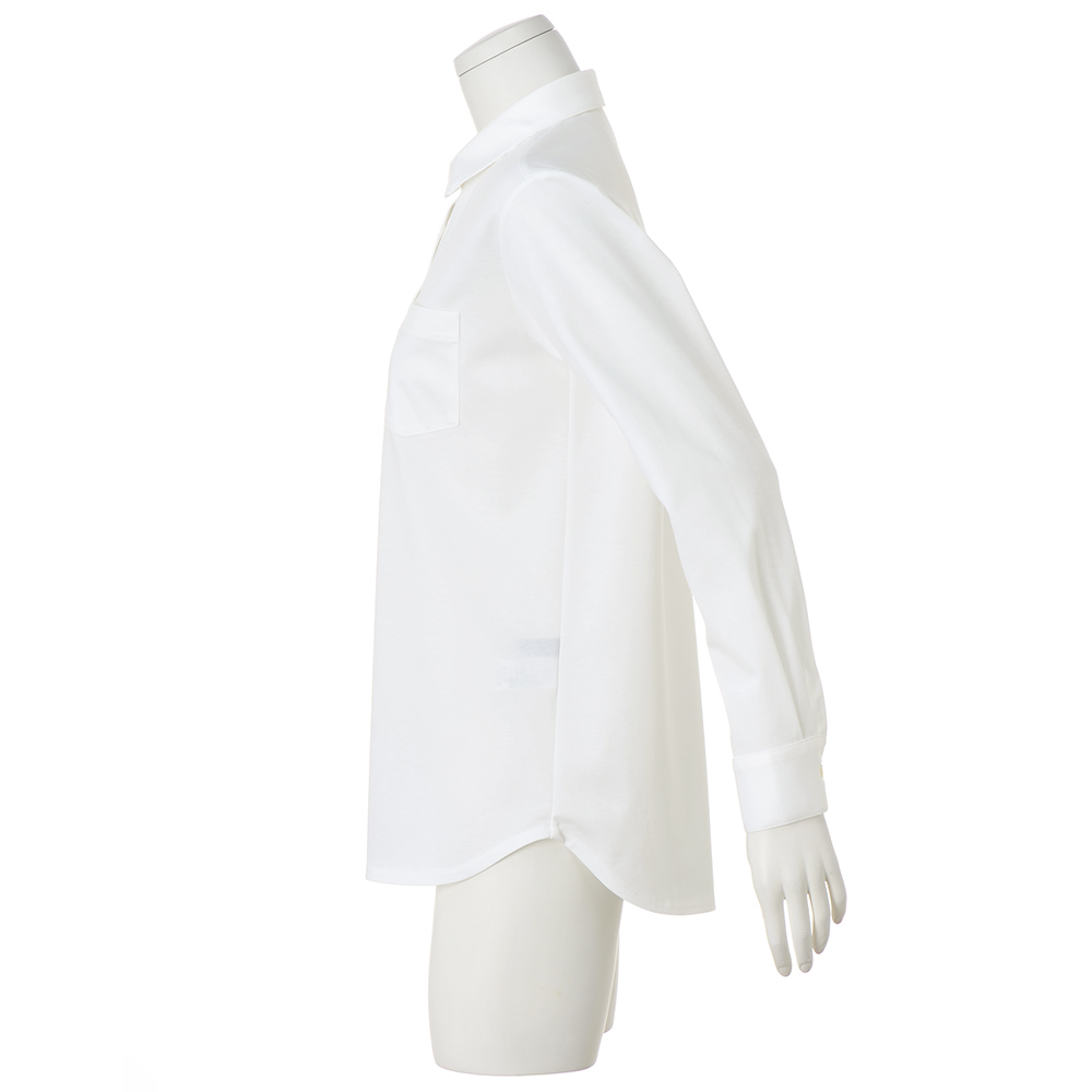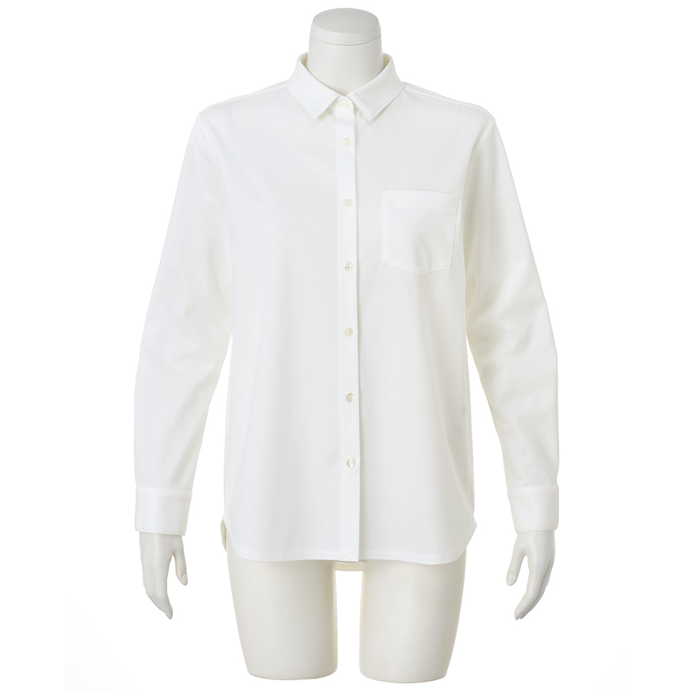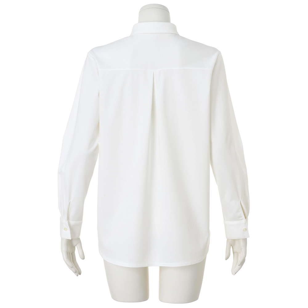 CAREER STYLE知性と気品で魅せる印象美仕事での活躍の場が広がるほど、本質的な美しさを求めたくなるキャリア服。上質な生地、豊かな色、美しい仕立て…。品位を礎に、自分らしいスタイルを磨き続けて。一見すると布帛のようなクリアな表面感ときちんと感を携えた高密度ジャージーシャツは、本格的な本縫いミシンで仕上げることで高級感の漂う仕上がりに。ジャストサイズに仕立てたすっきりとした佇まいで、自宅で洗えてシワになりにくいのも毎回人気の理由。後ろ身頃の中心にはボックスタックを入れて動きやすさにも考慮しました。≫ POINTイージーケア性に優れ、忙しい日常でも手軽にお手入れができます。ホワイトとライトピンクの2色展開。