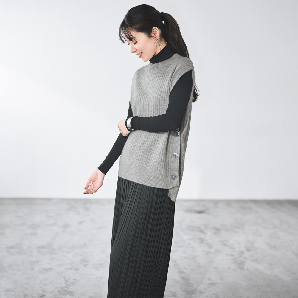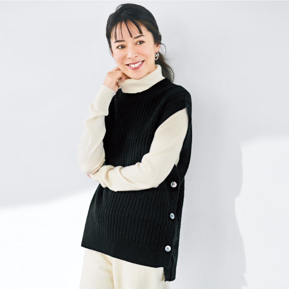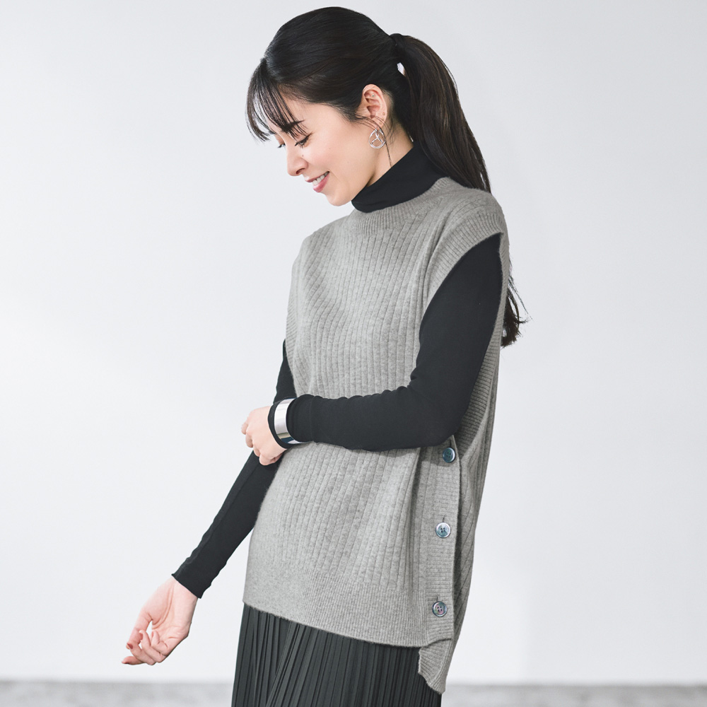 − カシミヤで過ごす毎日。−「着ていて気持ちがいい服」しか、もう欲しくない大人の私たち。冬は毎日、上質なカシミヤの洋服で過ごしたい。綺麗な色、元気な配色、旬のデザイン、ほっそり見えるシルエットを「And」がご紹介します。とにかく便利で大ヒット。真夏以外、長〜く活躍しますとても人気で、ヒットが続いているカシミヤのベストです。秋口や春先はブラウスやTシャツに、冬場は薄手セーターに重ねて、トレンドのレイヤースタイルを長いシーズン楽しめる便利な一枚。広めの肩幅と、着丈に前後差をつけたボックスシルエットで体型カバーも。それでいて縦ラインを強調するワイドリブで、細見え効果も◎。両サイドの貝ボタンをひとつふたつ外して、スリットにしても素敵です。今季は、意外に初登場のブラックにも注目してください。10シーズンも愛され続けて