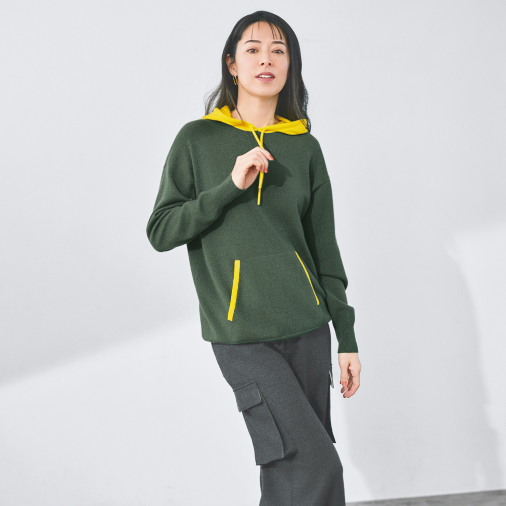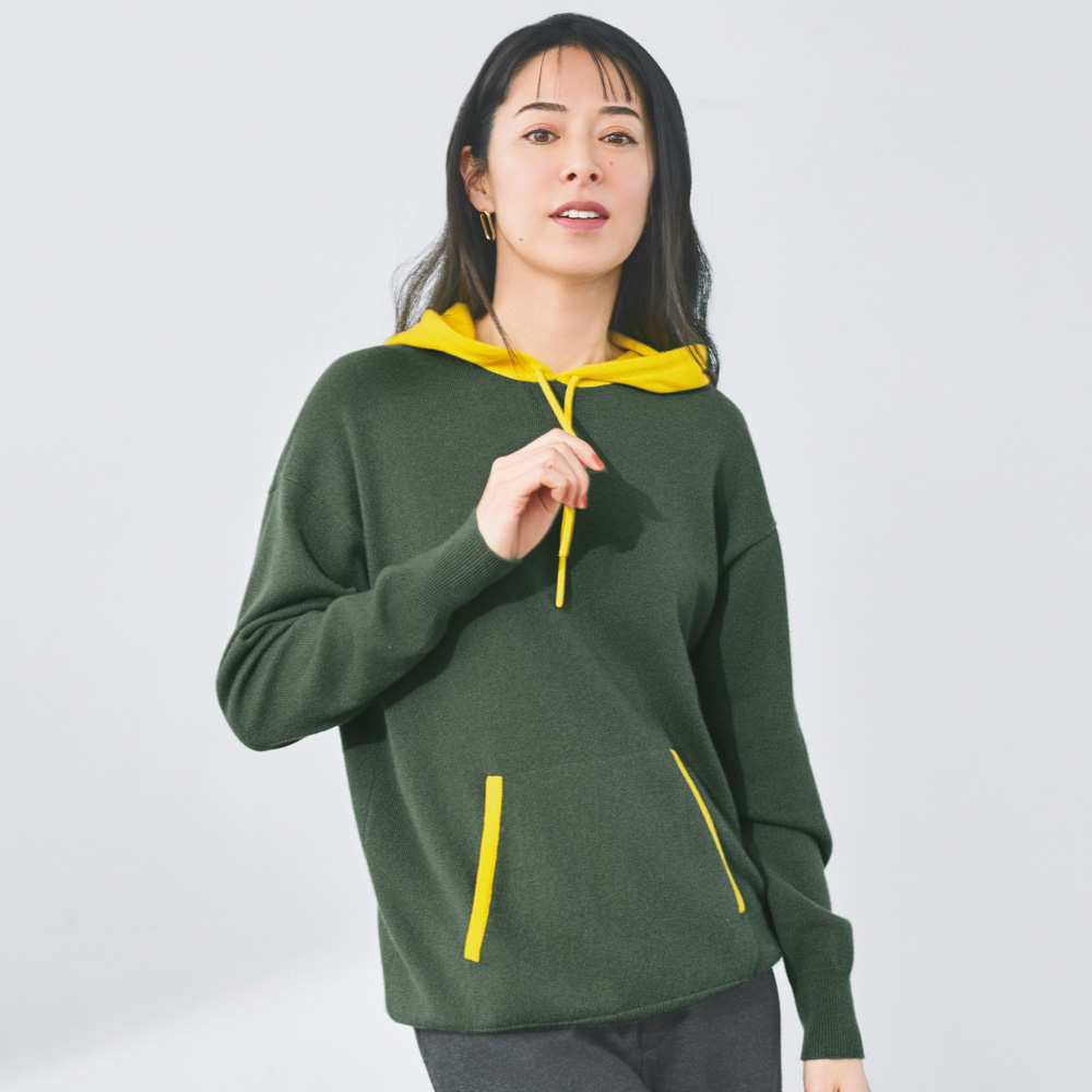 CASHMERE LIFE− カシミヤで過ごす毎日。−「着ていて気持ちがいい服」しか、もう欲しくない大人の私たち。冬は毎日、上質なカシミヤの洋服で過ごしたい。綺麗な色、元気な配色、旬のデザイン、ほっそり見えるシルエットを「And」がご紹介します。ストリート感覚をカシミヤで着る遊び心とろけるようなカシミヤの贅沢なパーカーを、大人が着るのが素敵。フード、フードヒモ、カンガルーポケットの口の配色が、全体の印象を引き締める、毎年人気のデザインです。程よい厚みでアウターのインにしてももたつかず、上質カシミヤの暖かさですっきり着こなせます。カーキ×イエローの元気カラーが今季の気分。10シーズンも愛され続けて「And」が「オルドス」社のカシミヤにこだわる理由世界トップクラスのカシミヤ生産地として名高い、中華人民共和国内モンゴル自治区にあるオルドス市。この地に生きる人たちは、古くからカシミヤ山羊の飼育を行ってきました。冬にはマイナス20度以下になるという過酷な地で大切に育てられたカシミヤ山羊の毛は、細く長く、保湿性の高いうぶ毛に覆われています。中でも希少とされる、曇りのない白い山羊毛“ホワイトカシミヤ”だけを厳選しているのが「And」のこだわりです。カシミヤの品質の高さは、原毛そのもののクオリティによるところが約7割。残りの3割が生産技術の高さによると言われています。「And」がパートナーシップを組んで今季で10シーズン目となる「オルドス」社は、30年以上も前に、原毛の紡績から製品の仕上げまで、すべてを自社で一貫生産する体制を始めました。SDGsに取り組みつつ、流通コストの削減によるコストパフォーマンスのよさで、世界中に流通する上質なカシミヤ製品を手がけるメーカーです。「And」のカシミヤがこれほどまでにご好評いただいているのは、「オルドス」社のカシミヤのとろけるような柔らかな風合い、優しい暖かさを皆様が認めてくださっているから。今季もお気に入りの素敵なニットたちと、どうぞ気持ちのいいシーズンをお過ごしください。カシミヤを自宅で洗おうHOW TO CARE FOR CASHMERE カシミヤは、実は自宅で洗うことができるのです。ポイントを掴めば難しいことは一切なく、簡単にサッと手洗いすることで、大切なニットの柔らかな風合いが長持ちしてくれます。01 大判のタオルで包むカシミヤの繊維にとって摩擦は大敵。最小限に抑えるために、大判タオルに衣類をはさみ、ロール状に包んでからネットに入れます。02 桶に水と洗剤を入れる洗い桶に常温の水をはり、ウール用洗剤を入れてよく泡立てます。03 一枚ずつ「押し洗い」1を2にひたし、両手で優しく押し洗いします。短時間でOKです。摩擦を抑えるため、カシミヤ衣類は一枚ずつ洗うのが鉄則。04 すすぎ→柔軟剤3を一度すすいで、桶に新しい水をはり、柔軟剤を加えてカシミヤ衣類をひたします。油分を補って、繊維を保護します。05 洗濯機で脱水する脱水で完全に水気を取ります。ドラムに衣類が張り付き、遠心力で水分が飛ぶ脱水は、タオルなどで絞るよりも実は繊維に優しい。06 日陰で干す風通しのよい日陰に平干しし、自然乾燥します。半絞りの状態で吊るして干すと、水分の重みで編み地が伸びてしまうのでご注意を。