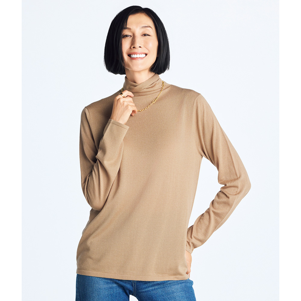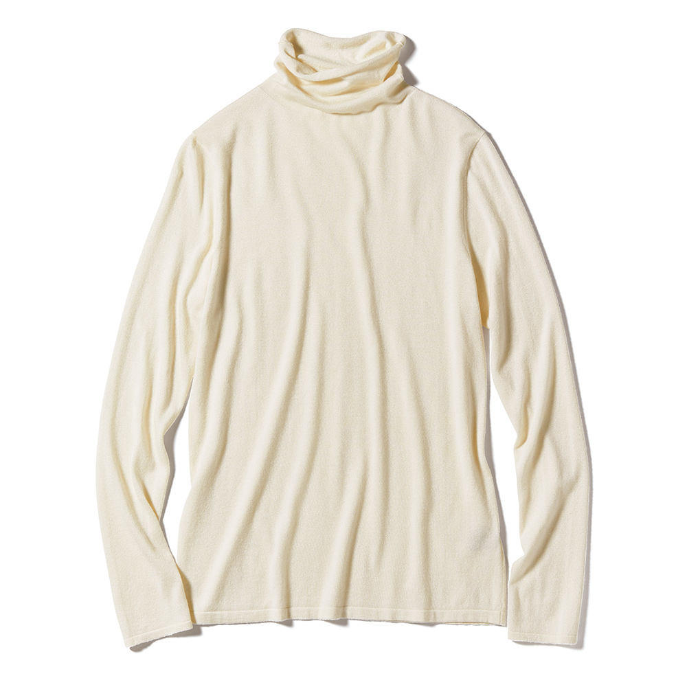 MUST BUY ITEMS春アイテムを手に入れるチャンス到来!今回の「マストバイ」はリーズナブルプライスをご紹介。気になっていたアイテムを、この機会にぜひ。三寒四温の季節にぴったりな優しい着心地のニットシルク高混率にカシミヤをブレンドした、肌になめらかに沿う優雅な着心地と美しい発色に誰もが夢中!首元を締めつけないゆったりと立ち上げた身頃続きのボトルネックも好評で、襟端の天竺編み特有のカールがさりげない甘さを添えるアクセントになっています。極細のセミ梳毛糸を編み上げた薄手のハイゲージニットは、インナーとしても一枚着としてもロングシーズン活躍してくれる万能アイテム。大人の装いを引き立てる上品なカラーバリエーションで、今春はキャメルとネイビーが新たに加わり、5色でご提案します。