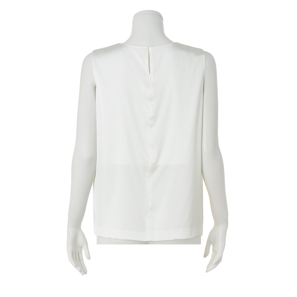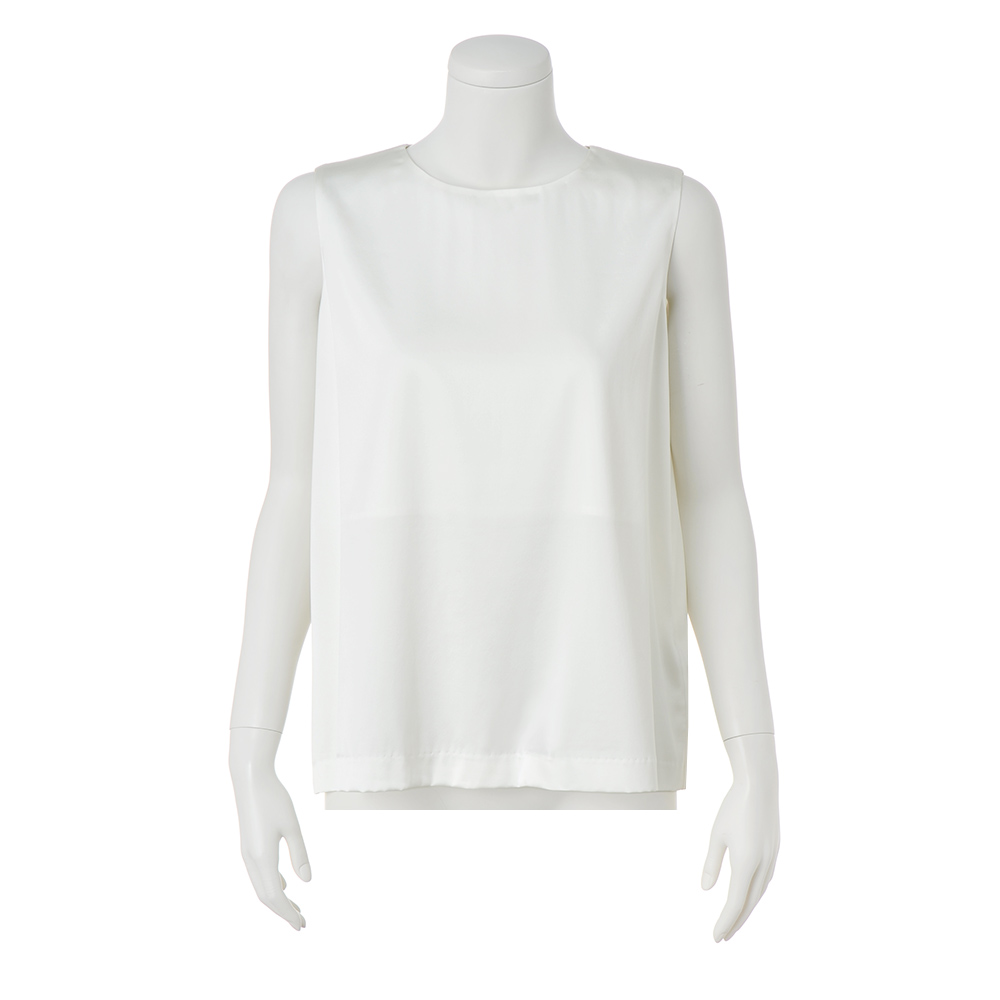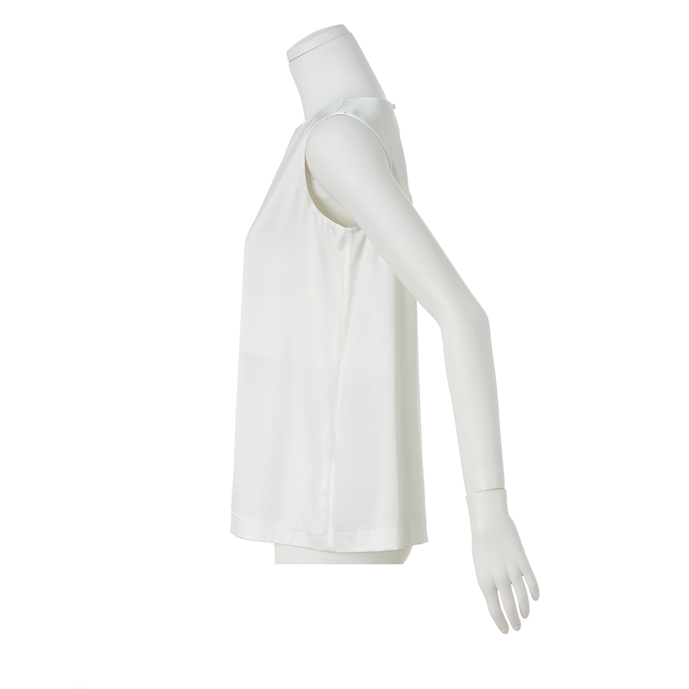夏の端麗スタイルは艶レイヤードが決め手タンクトップは、前後共に19匁の程よい肉感のシルクサテンを使用。ストレッチ糸を交織しているので、伸びやかで快適な着心地が特徴です。また、インナーに着た時の襟ぐりの見え方にも拘り、ステッチを目立たせない高度な縫製によって繊細な艶めきが際立つデザインに。≫ POINT襟元はテーラードジャケットと好バランスな開きを計算。ステッチを表に出さない縫製でエレガントな仕上がりに。