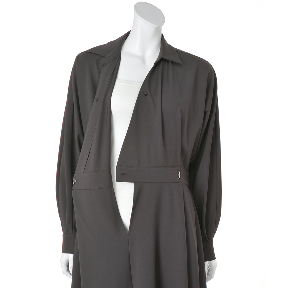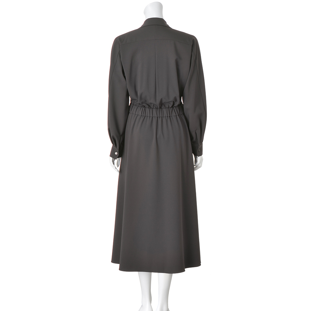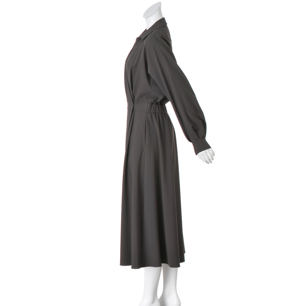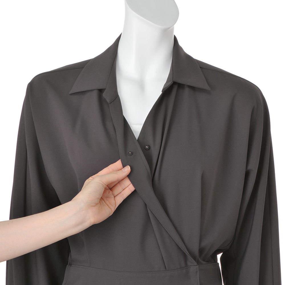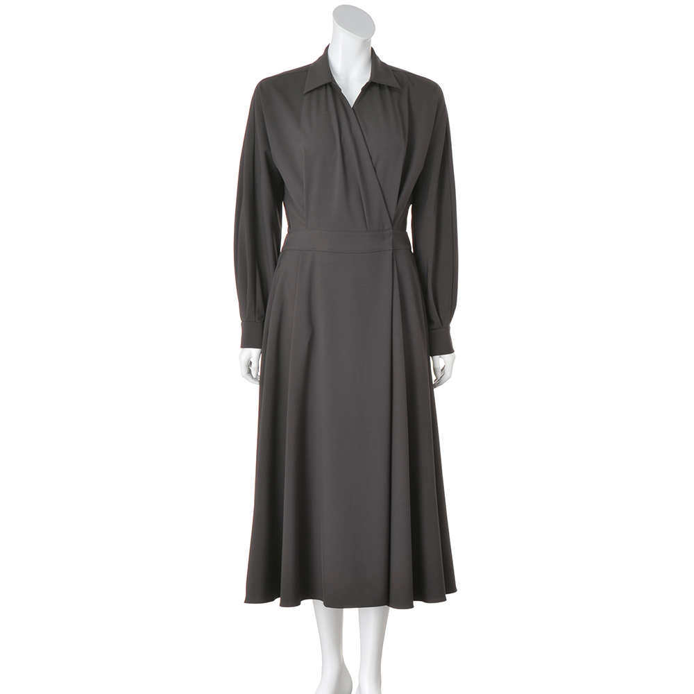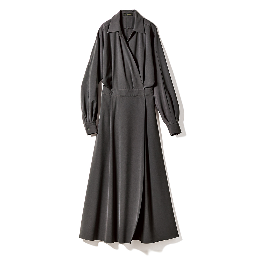 CAREER STYLE仕事も、服も、軽やかに楽しむ。冬の到来はまだ先だから、少しずつ深まる季節に合わせて着こなせるロングシーズン素材が洗練の決め手に。ドレスのように美しい佇まいに魅せられて。「色違いがあったら必ず買いたい!」というお客様の声にお応えし、今年は深いチャコールグレーで登場です。人気の秘密は、とろみとハリ感を併せ持つ特殊加工糸を織り上げた綾織り生地だから作り出せた、しなやかな女性らしさと知性を香らせたデザイン。カシュクールの胸元はスナップ留め、ラップ風スカート部分は一枚の生地を深く折り重ねることで表現されているから、うっかり肌が見えてしまう心配がありません。前ウエストのタック、後ろウエストのゴムで分量感を出したエレガントなフレアーは、思わず見とれてしまう麗しさ。≫ POINT肩ヨークを袖口まで伸ばしたエポーレットスリーブも、まろやかな肩のラインを描いて女性らしさに一役。