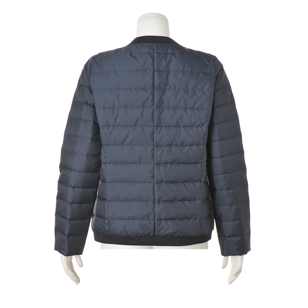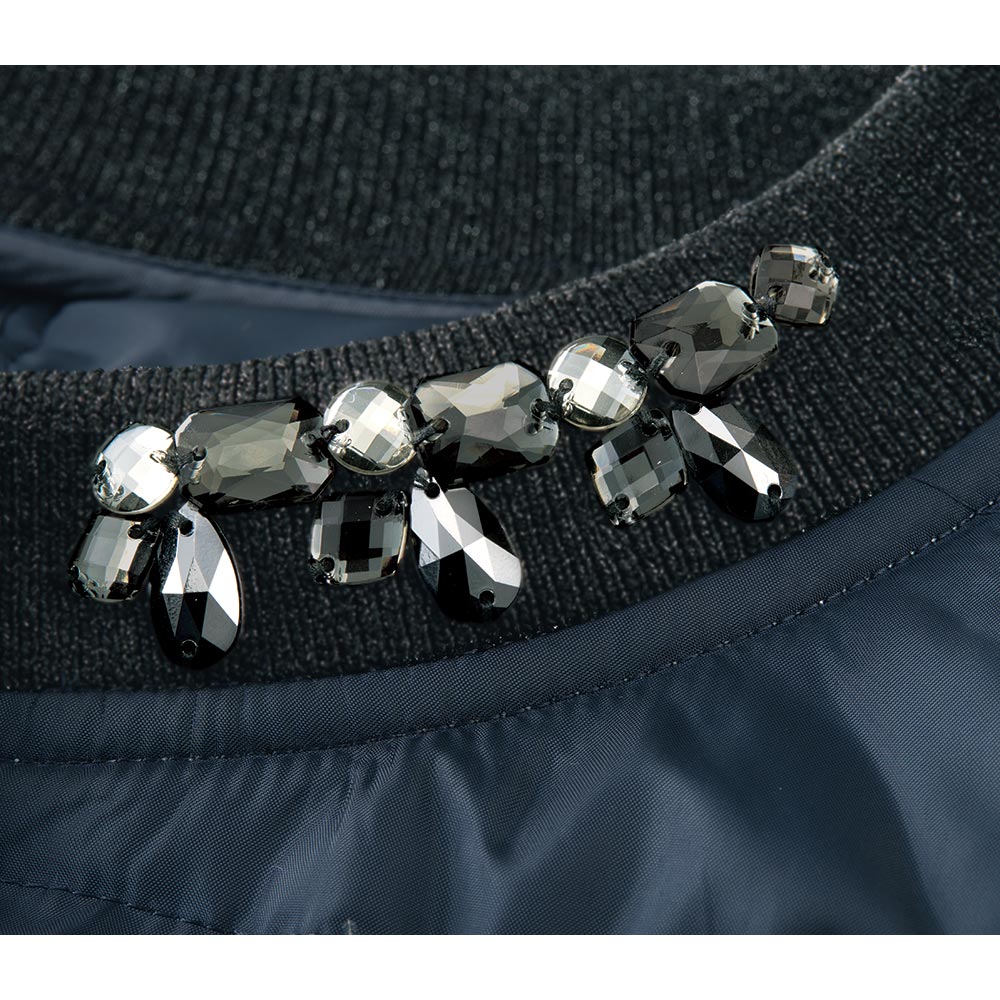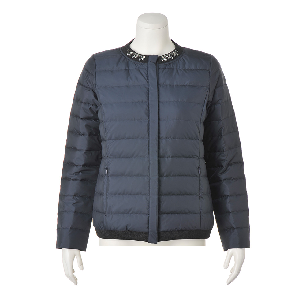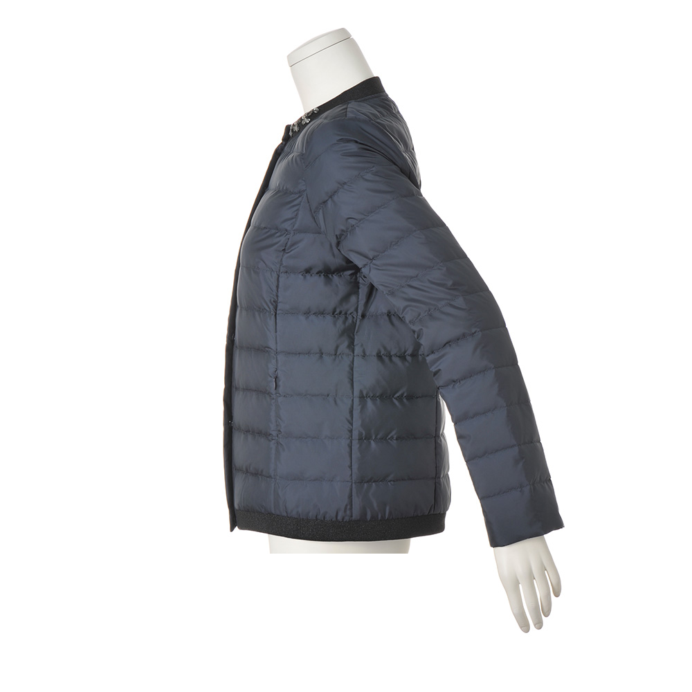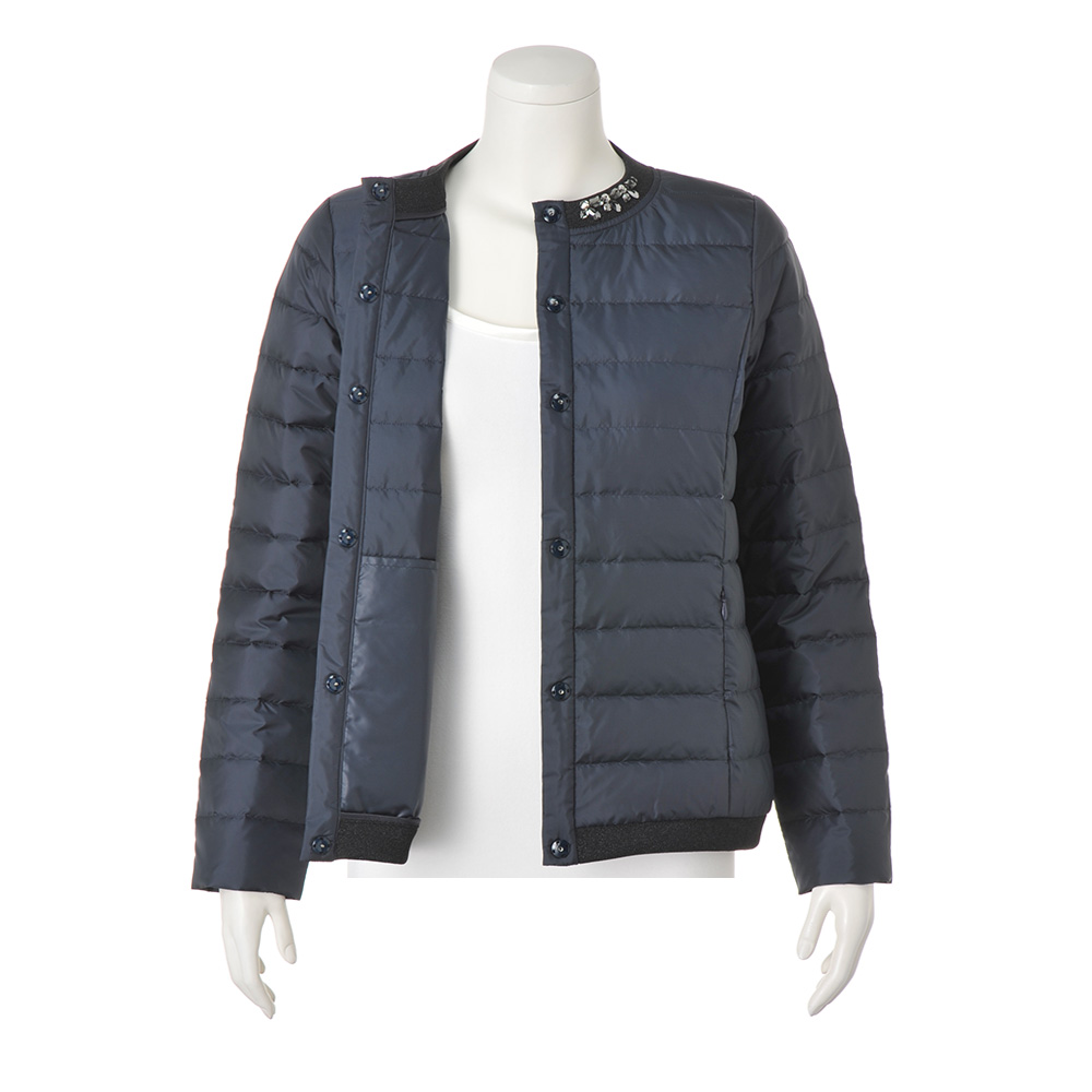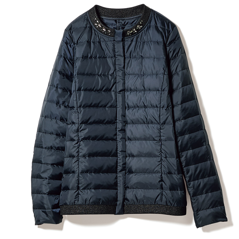 Trendy Colorマイスタイルが確立した大人の着こなしをさりげなく更新するなら、トレンドカラーに注目!深く、温かみのある色で、「今年の冬」を楽しんで。大人が恋するネイビーダウンは洗練シャイニーがキーワード!端境期は主役アウターとして、冬本番はインナーダウンとして。季節をまたいで存在感を放つ、才色兼備な薄軽ネイビーダウンはいかがでしょう?本体は、軽量で繊細な艶をまとったネイビーのはっ水高密度タフタ。着膨れを防ぎすっきり見えるよう、ダウン分量や巧みな切り替えを駆使して立体的に仕上げたシルエットも自慢です。襟ぐりにはブラックラメ糸で編み上げたリブを配し、形が異なるブラック、クリア、ガンメタリックのビジューをバランスよく配置してチョーカーのような趣に。裾も同じブラックラメ入りリブをリフレインして統一感を高めています。機能性もデザイン性も譲れない、大人のためのダウンの最旬回答がここにあります。≫ POINTビジューやラメの輝きが際立つミニマルなデザイン。フロントは比翼仕立てのスナップ留め、ポケットもシームを利用してすっきりと仕上げました。