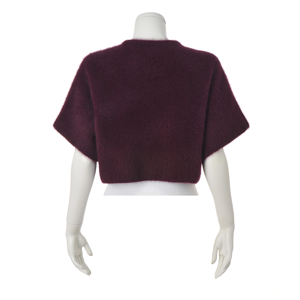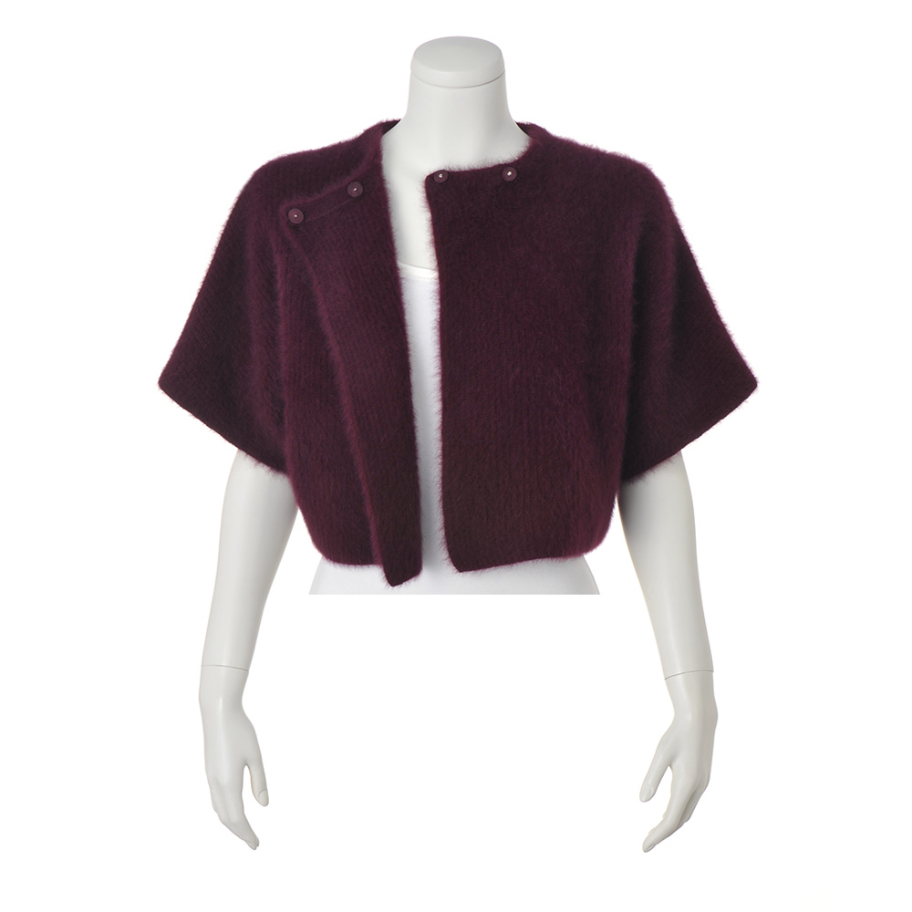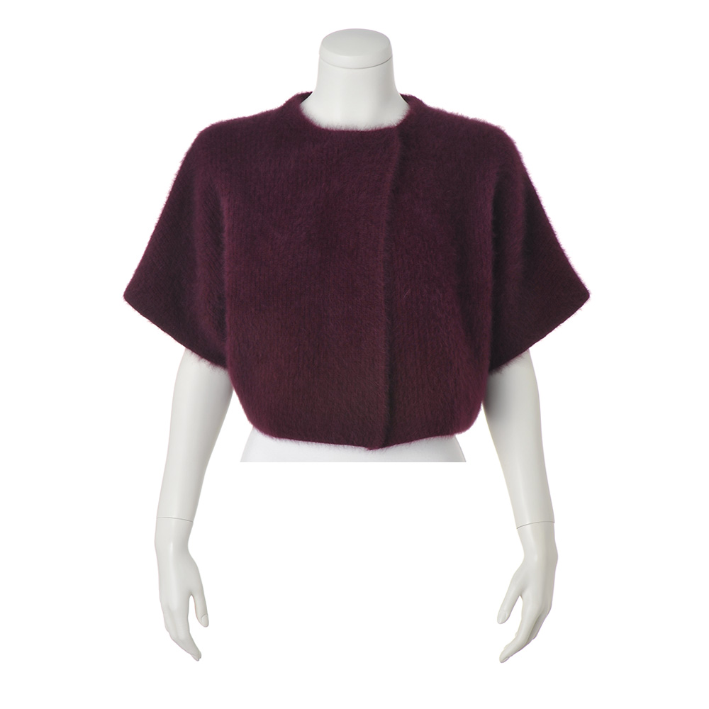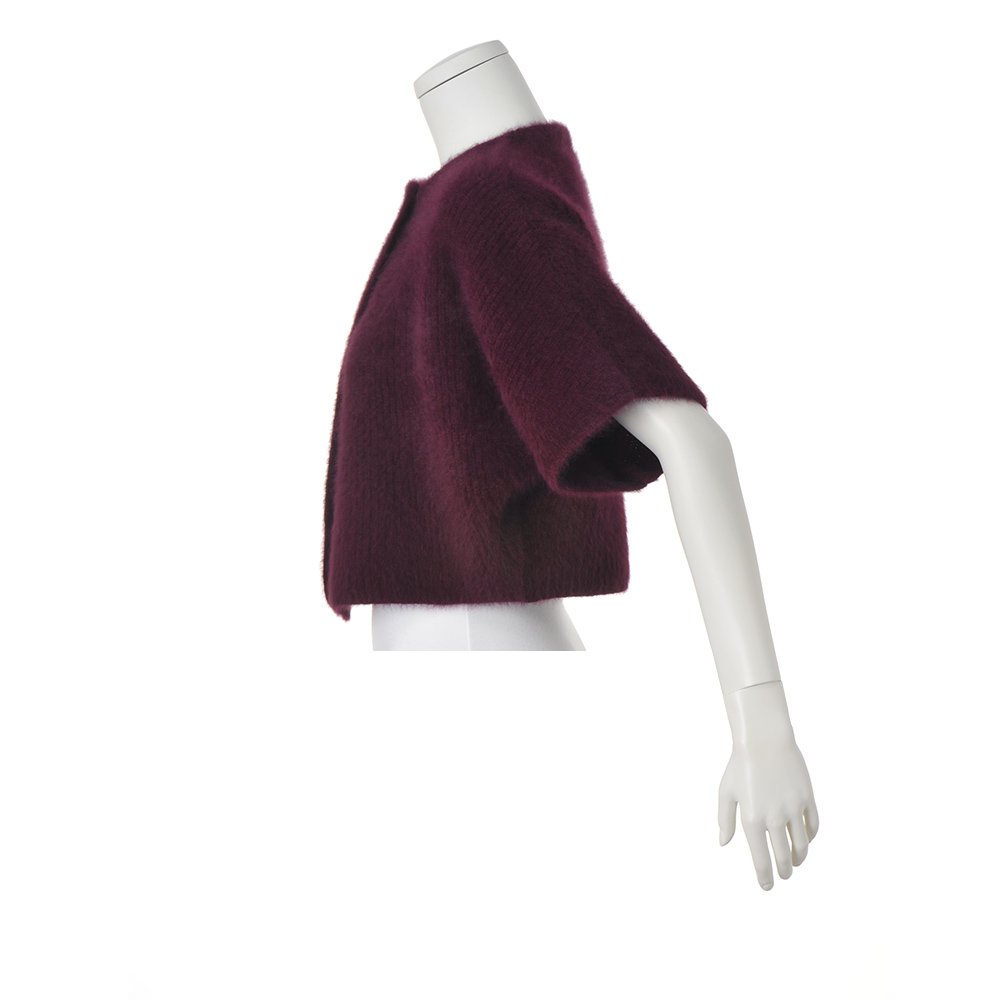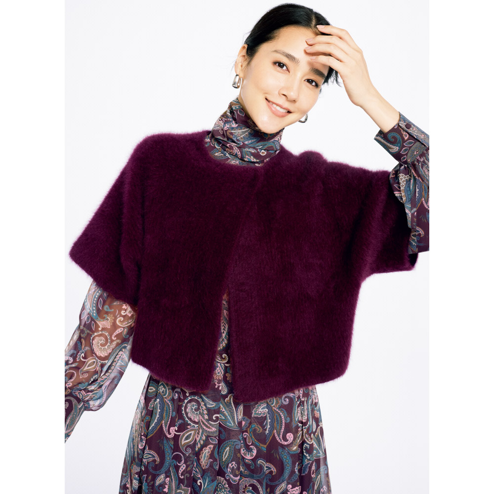 色と素材の豊潤なコンビネーションふわふわと柔らかな毛足と滑らかな質感に癒やされるニットボレロ。昨年、人気を博したアイテムが、トレンドカラーのボルドーで再登場です。へアリーなフォックスカシミヤのリュクス感が際立つ、ミドルゲージの片畦編みに。前合わせを深くとり、上部にのみスナップボタンをあしらいました。五分丈の優雅なドルマンスリーブは、合わせるものを選ばないワイド型。バランスよく着られるショート丈も愛用ポイントです。