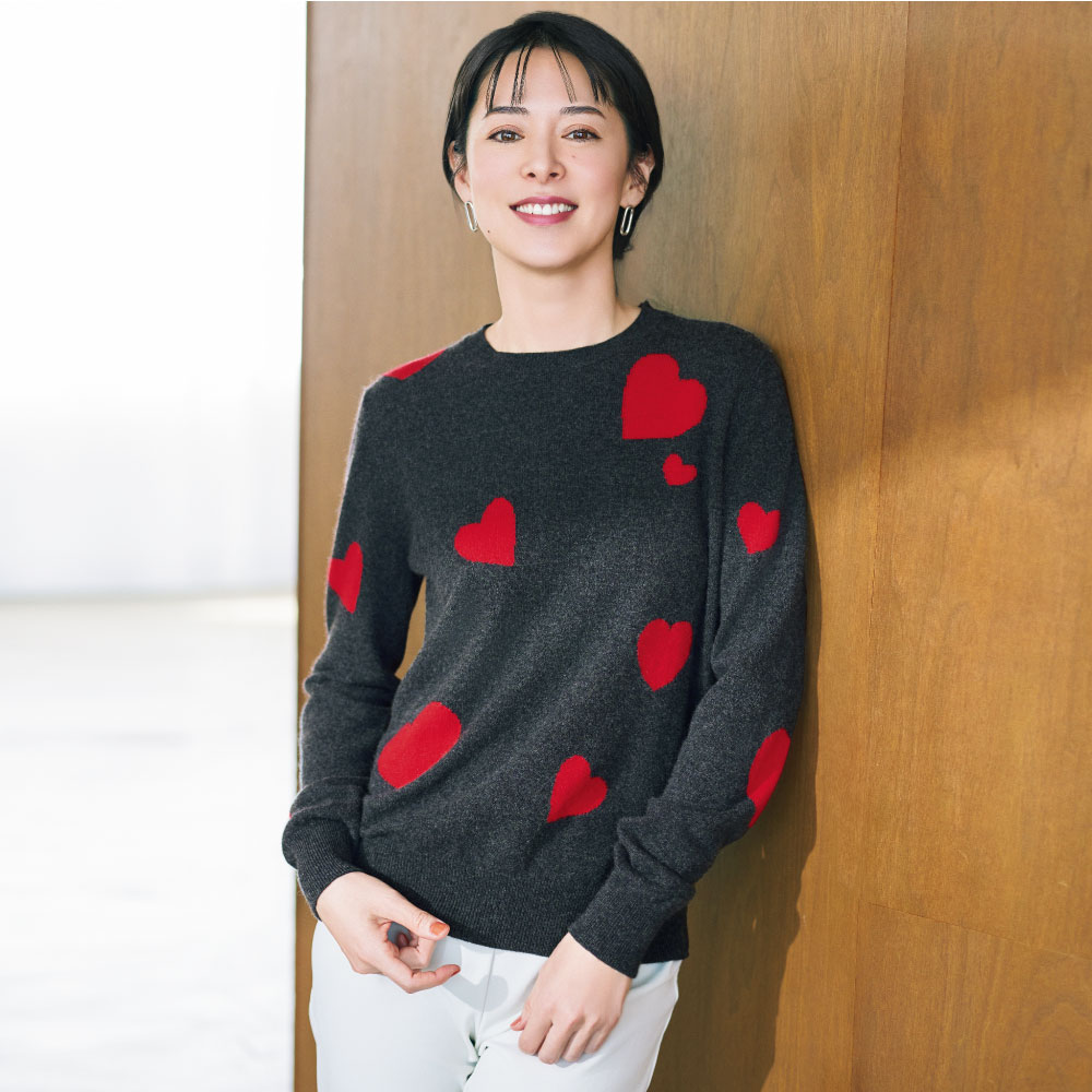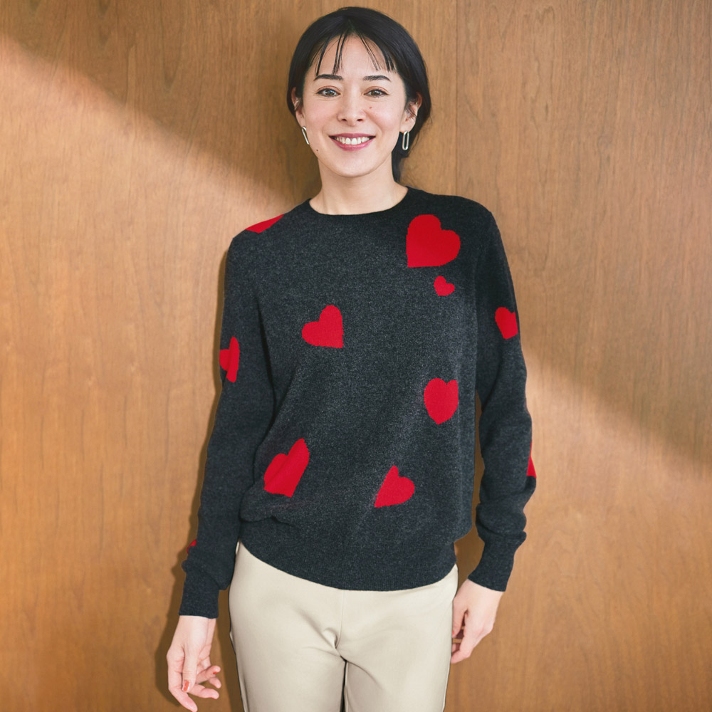 CASHMERE LIFE− カシミヤで過ごす毎日。−「着ていて気持ちがいい服」しか、もう欲しくない大人の私たち。冬は毎日、上質なカシミヤの洋服で過ごしたい。綺麗な色、元気な配色、旬のデザイン、ほっそり見えるシルエットを「And」がご紹介します。心も身体もあったかいハートウォーミングな一枚Tシャツの季節が過ぎたら、まず欲しいのがクルーネックのベーシックなプルオーバー。着ている人も、それを見る人もハッピーになるハートの柄は、裏に糸を渡らせずに柄を表現するインターシャ編み。だから厚みが出にくく、すっきりと着られて、上質感が漂います。ランダムに飛んでいる大きさの違うハートが、後ろ身頃にも腕にもあるのがたまらない!襟や袖口同様に、裾もリブ編みなので、ナチュラルにブラウジングできて、パンツにもスカートにも合わせやすい便利なニットです。10シーズンも愛され続けて「And」が「オルドス」社のカシミヤにこだわる理由世界トップクラスのカシミヤ生産地として名高い、中華人民共和国内モンゴル自治区にあるオルドス市。この地に生きる人たちは、古くからカシミヤ山羊の飼育を行ってきました。冬にはマイナス20度以下になるという過酷な地で大切に育てられたカシミヤ山羊の毛は、細く長く、保湿性の高いうぶ毛に覆われています。中でも希少とされる、曇りのない白い山羊毛“ホワイトカシミヤ”だけを厳選しているのが「And」のこだわりです。カシミヤの品質の高さは、原毛そのもののクオリティによるところが約7割。残りの3割が生産技術の高さによると言われています。「And」がパートナーシップを組んで今季で10シーズン目となる「オルドス」社は、30年以上も前に、原毛の紡績から製品の仕上げまで、すべてを自社で一貫生産する体制を始めました。SDGsに取り組みつつ、流通コストの削減によるコストパフォーマンスのよさで、世界中に流通する上質なカシミヤ製品を手がけるメーカーです。「And」のカシミヤがこれほどまでにご好評いただいているのは、「オルドス」社のカシミヤのとろけるような柔らかな風合い、優しい暖かさを皆様が認めてくださっているから。今季もお気に入りの素敵なニットたちと、どうぞ気持ちのいいシーズンをお過ごしください。カシミヤを自宅で洗おうHOW TO CARE FOR CASHMERE カシミヤは、実は自宅で洗うことができるのです。ポイントを掴めば難しいことは一切なく、簡単にサッと手洗いすることで、大切なニットの柔らかな風合いが長持ちしてくれます。01 大判のタオルで包むカシミヤの繊維にとって摩擦は大敵。最小限に抑えるために、大判タオルに衣類をはさみ、ロール状に包んでからネットに入れます。02 桶に水と洗剤を入れる洗い桶に常温の水をはり、ウール用洗剤を入れてよく泡立てます。03 一枚ずつ「押し洗い」1を2にひたし、両手で優しく押し洗いします。短時間でOKです。摩擦を抑えるため、カシミヤ衣類は一枚ずつ洗うのが鉄則。04 すすぎ→柔軟剤3を一度すすいで、桶に新しい水をはり、柔軟剤を加えてカシミヤ衣類をひたします。油分を補って、繊維を保護します。05 洗濯機で脱水する脱水で完全に水気を取ります。ドラムに衣類が張り付き、遠心力で水分が飛ぶ脱水は、タオルなどで絞るよりも実は繊維に優しい。06 日陰で干す風通しのよい日陰に平干しし、自然乾燥します。半絞りの状態で吊るして干すと、水分の重みで編み地が伸びてしまうのでご注意を。