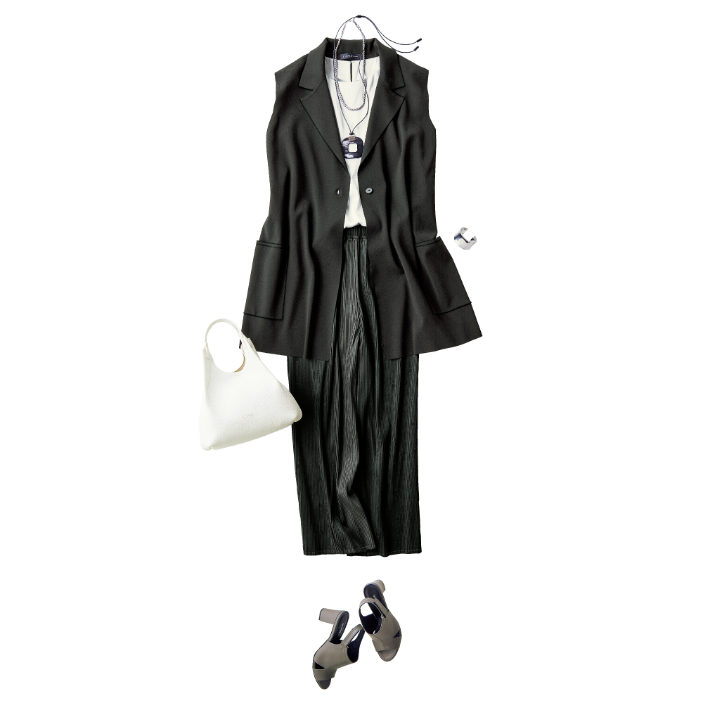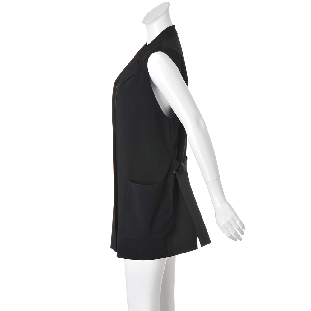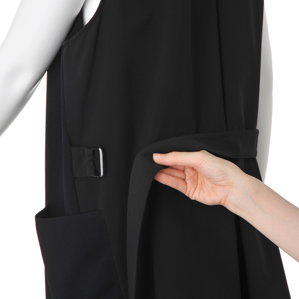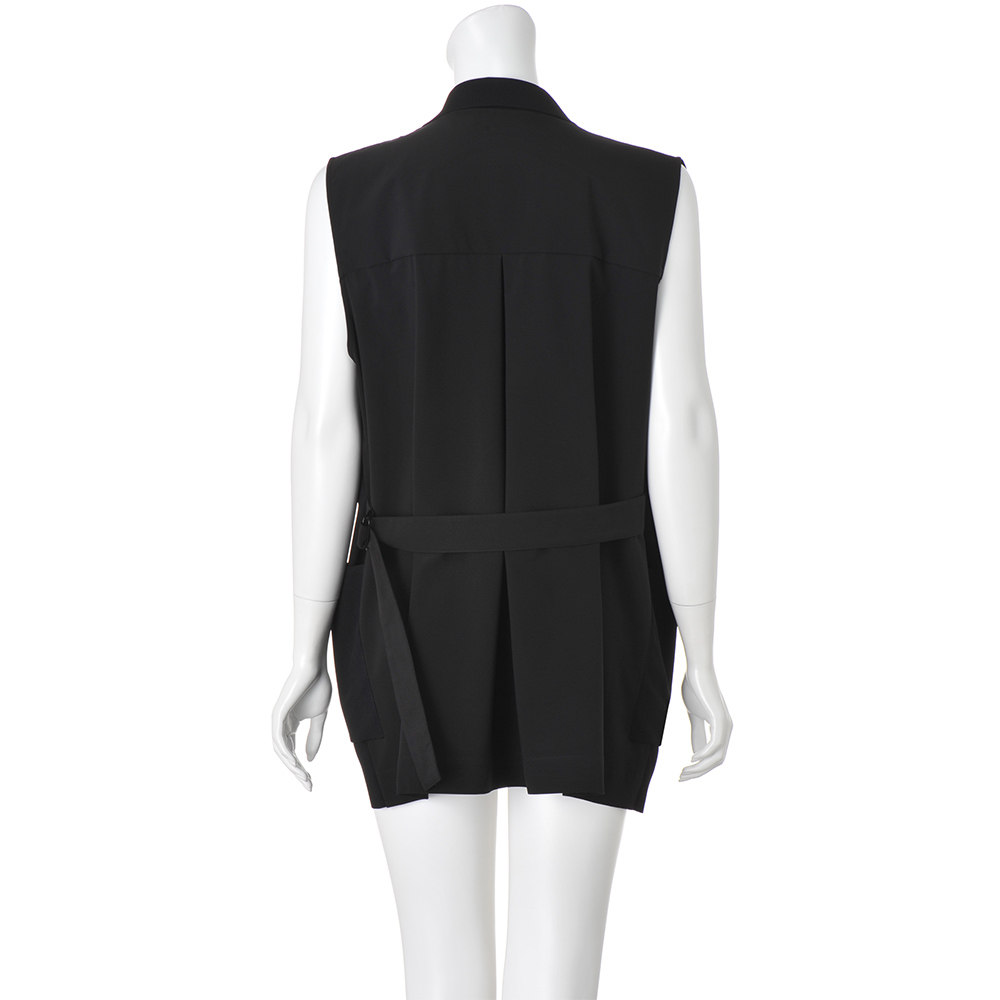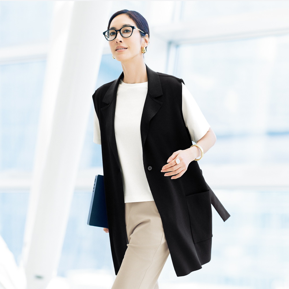 しなやかでスタイリッシュなサマーレイヤードトップス一枚では心許ないシーンで、キリッと端正な着こなしを即座に叶えるジレをご紹介します。前身頃はハイゲージの総針編み、後ろ身頃とベルトは伸びやかなサステナブルタフタ素材。ストレスのない軽やかな着心地と程よい立体感が動きやすさと洗練されたスタイルを両立します。デザインはふわりと広がる後ろ身頃のボリュームをベルトで調節ができ、パッチポケットは後ろ身頃まで廻してアクセントにすることで、立体的な印象を作り出しました。開けても締めてもサマになるシャープなラインが特徴です。後ろのボックスタックが背中の丸みやヒップラインをさりげなくカバー。