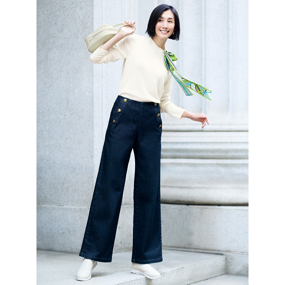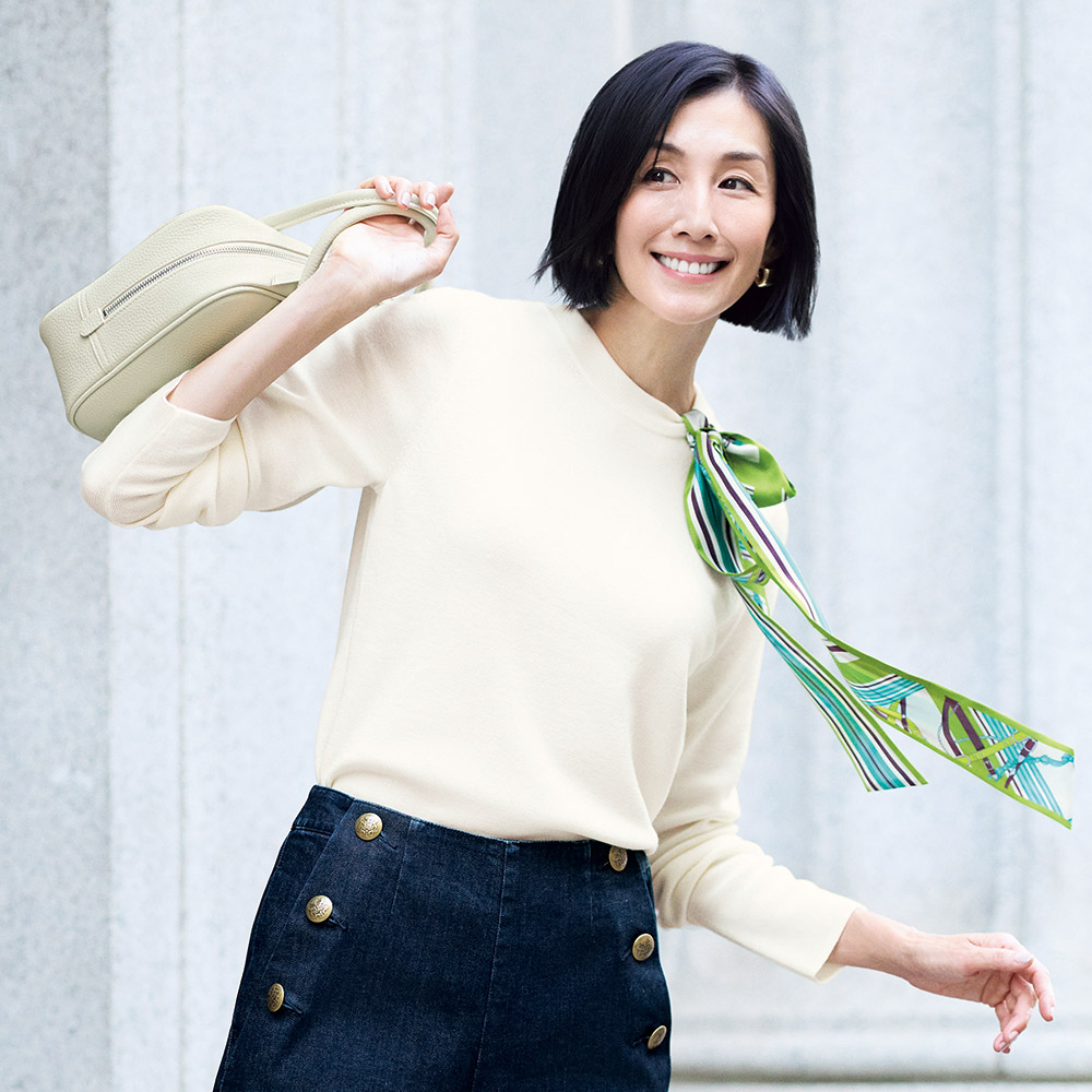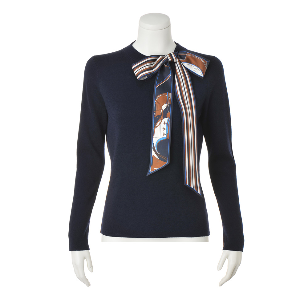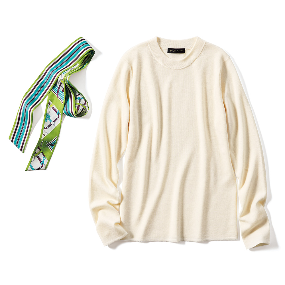 Parisien Style街に映えるフレンチシック。シンプルで上品だけど、遊び心や冒険心も忘れない。ポジティブにお洒落を謳歌するパリっ子たちをお手本に、この春はパリジャンスタイルを纏いませんか?カジュアル一辺倒にならない上品さが見事。スカーフを首に巻くのではなく“添えた”、カジュアルとエレガンスのバランスが新鮮なニットプルオーバーに、春の新色が登場です。上品なシルクツイル素材のスカーフは、ネックラインの接ぎを利用したホールに通す仕様。柄が裏表で異なるのも、結び方で多彩な表情を楽しめるポイントです。≫ POINTニットは防縮加工が施された上質メリノウールのハイゲージ。身体のラインが響きにくく、型崩れしにくい総針編み。