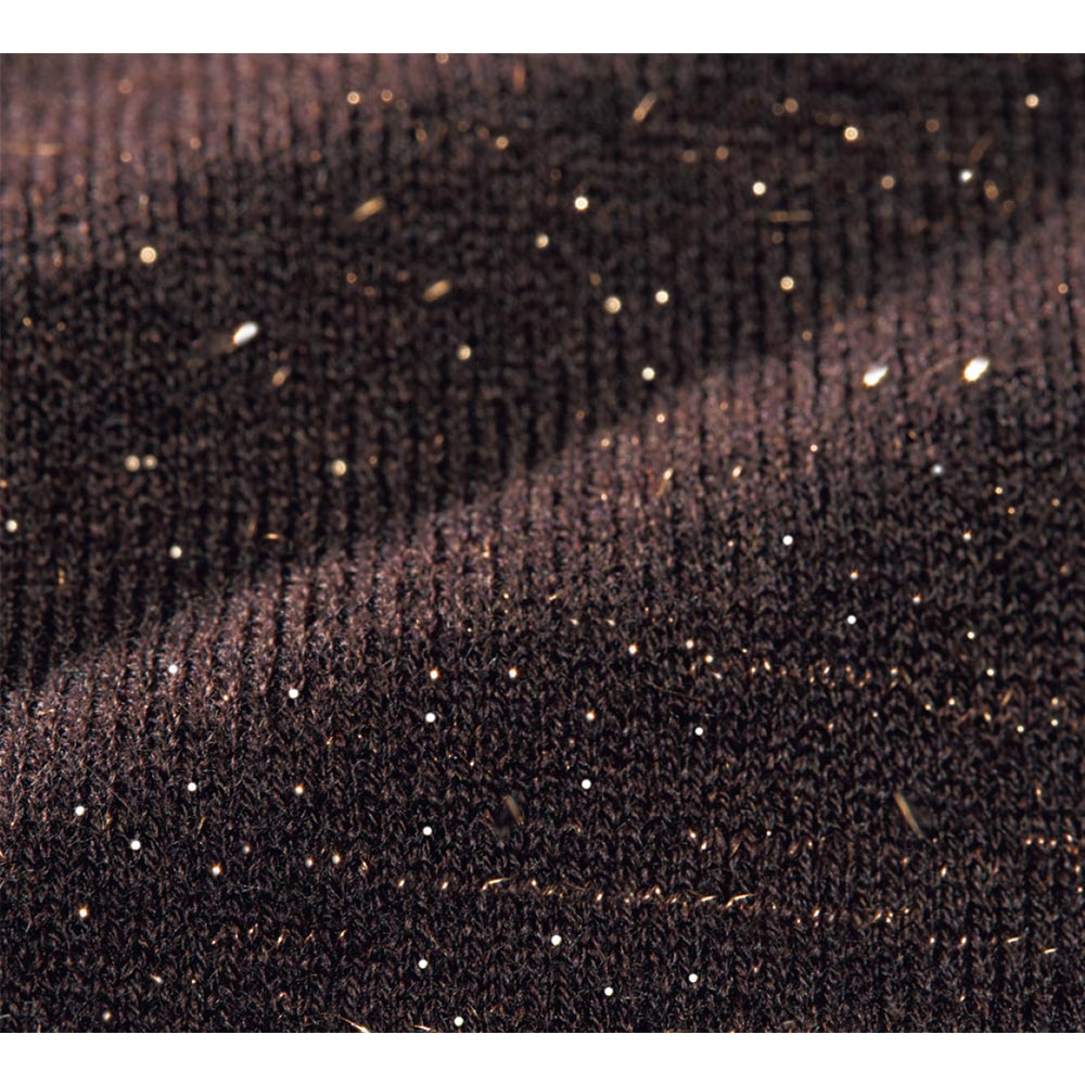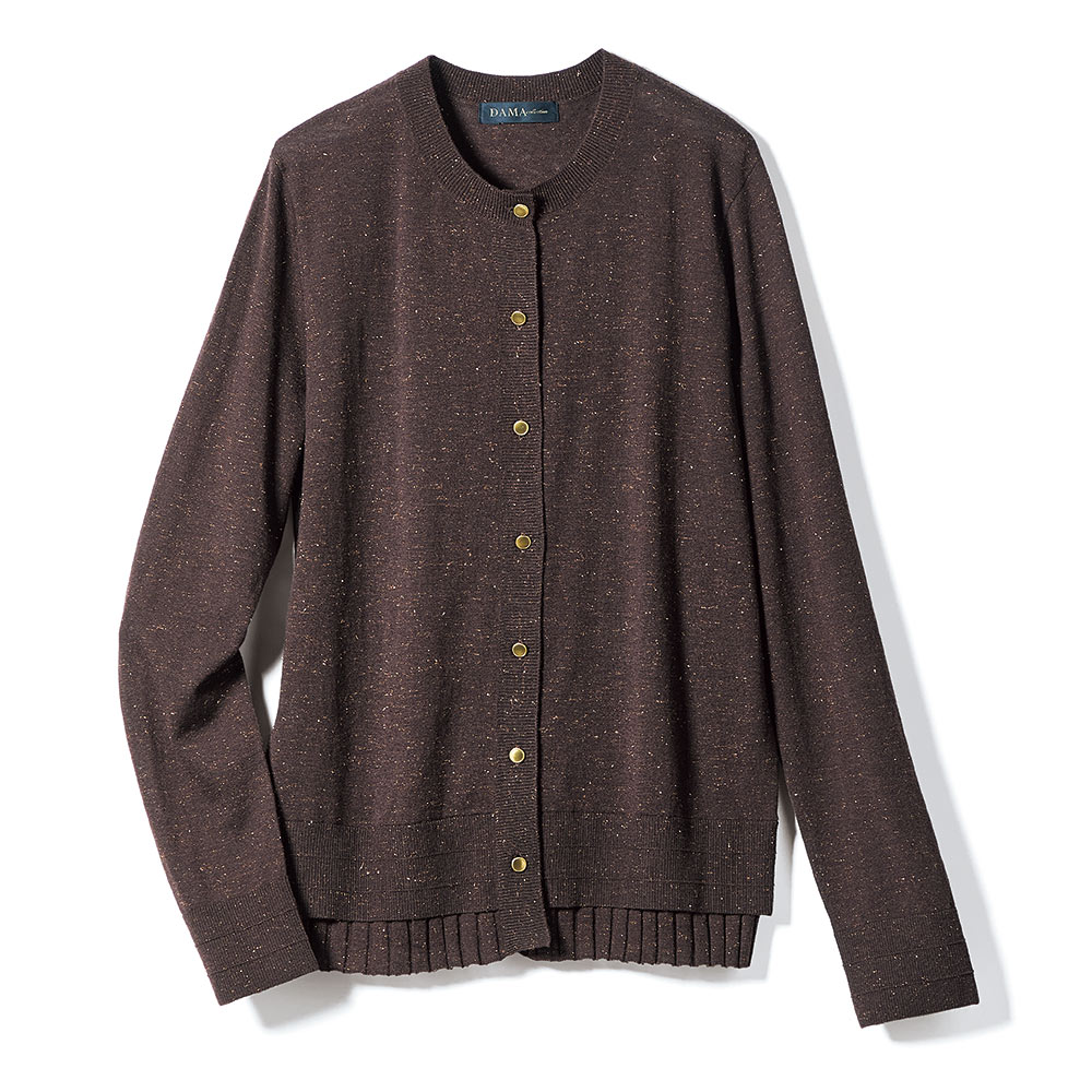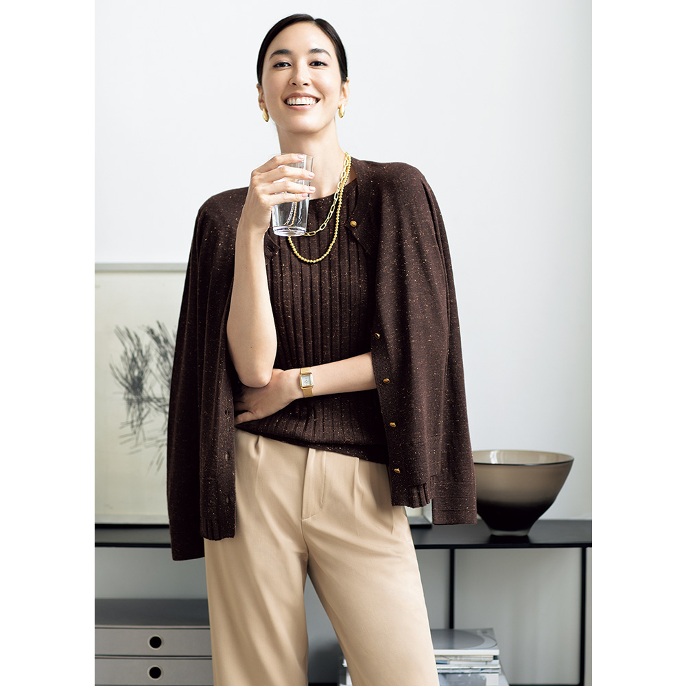 CAREER STYLE仕事も、服も、軽やかに楽しむ。冬の到来はまだ先だから、少しずつ深まる季節に合わせて着こなせるロングシーズン素材が洗練の決め手に。繊細な煌めきと深い陰影でアンサンブルを更新。こっくりとしたブラウンカラーにゴールドの煌めきが、シックでラグジュアリーな趣。極細のスーパーエクストラファインウールにメタリックラメを撚糸したハイゲージニットはとろけるように柔らかく、チクチク感のない肌触り。編み地にも拘った長袖カーディガン。天竺編みを基調に、ワイドリブを裾から覗かせて重ね着風に。≫ POINTトップ糸のメランジ感、よく見ると繊細な粒だけでなくフェザー状もミックスされたラメ、リブの凹凸感も相まった陰影豊かなニット。