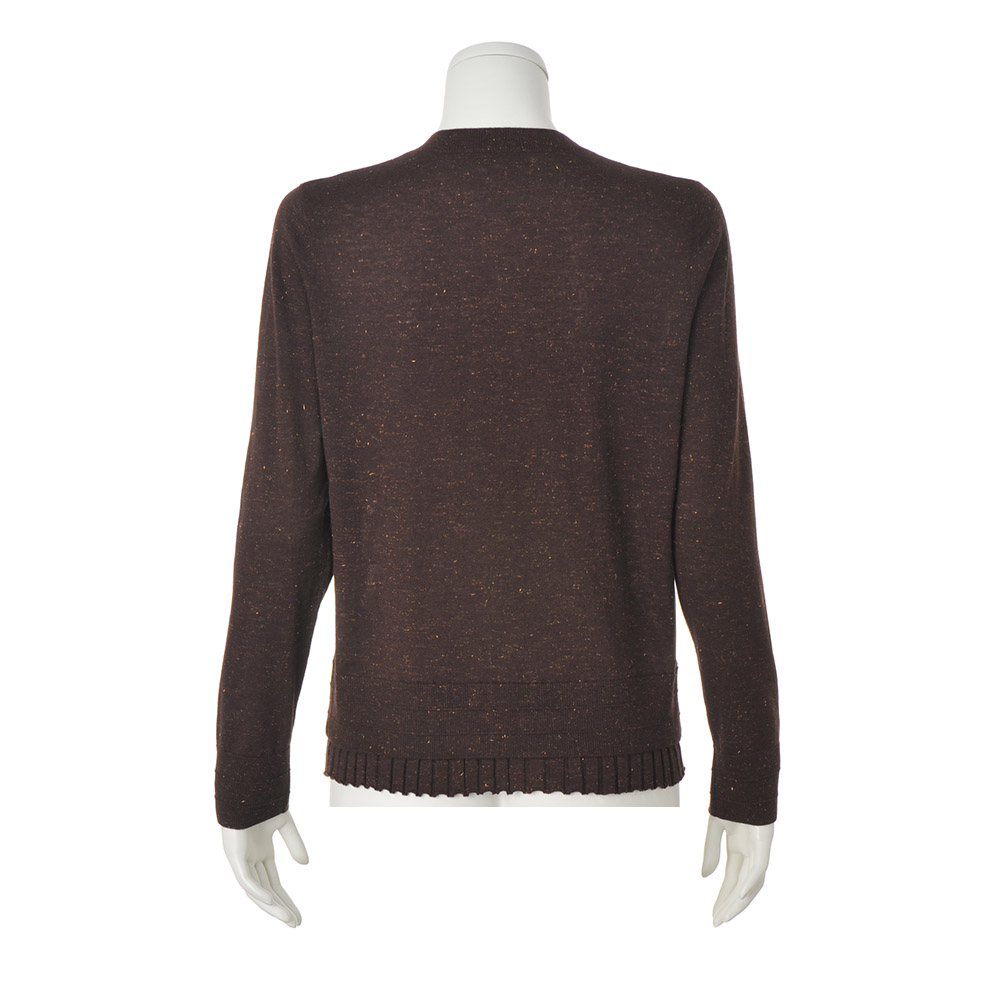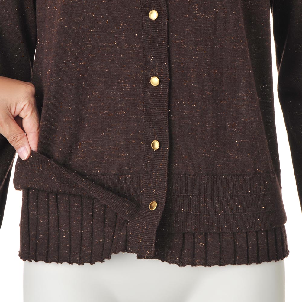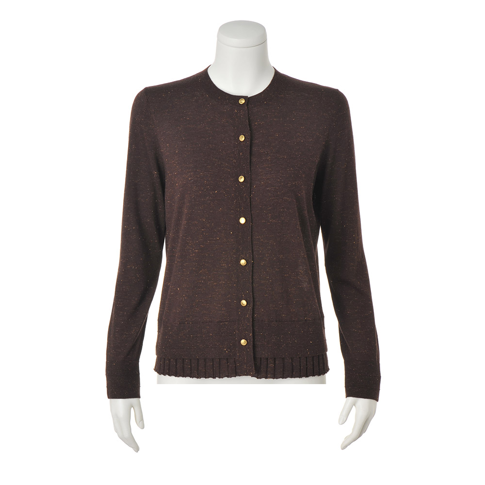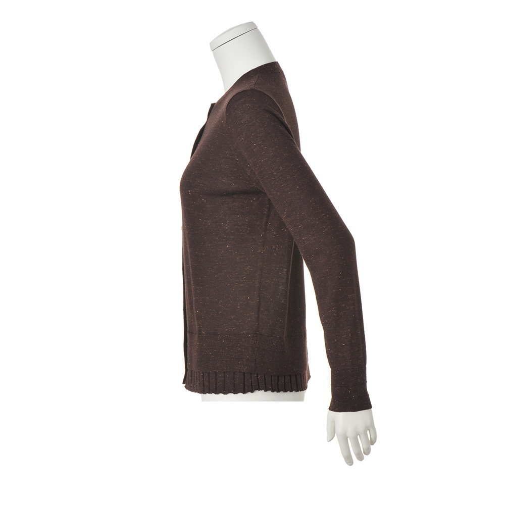 CAREER STYLE仕事も、服も、軽やかに楽しむ。冬の到来はまだ先だから、少しずつ深まる季節に合わせて着こなせるロングシーズン素材が洗練の決め手に。繊細な煌めきと深い陰影でアンサンブルを更新。こっくりとしたブラウンカラーにゴールドの煌めきが、シックでラグジュアリーな趣。極細のスーパーエクストラファインウールにメタリックラメを撚糸したハイゲージニットはとろけるように柔らかく、チクチク感のない肌触り。編み地にも拘った長袖カーディガン。天竺編みを基調に、ワイドリブを裾から覗かせて重ね着風に。≫ POINTトップ糸のメランジ感、よく見ると繊細な粒だけでなくフェザー状もミックスされたラメ、リブの凹凸感も相まった陰影豊かなニット。