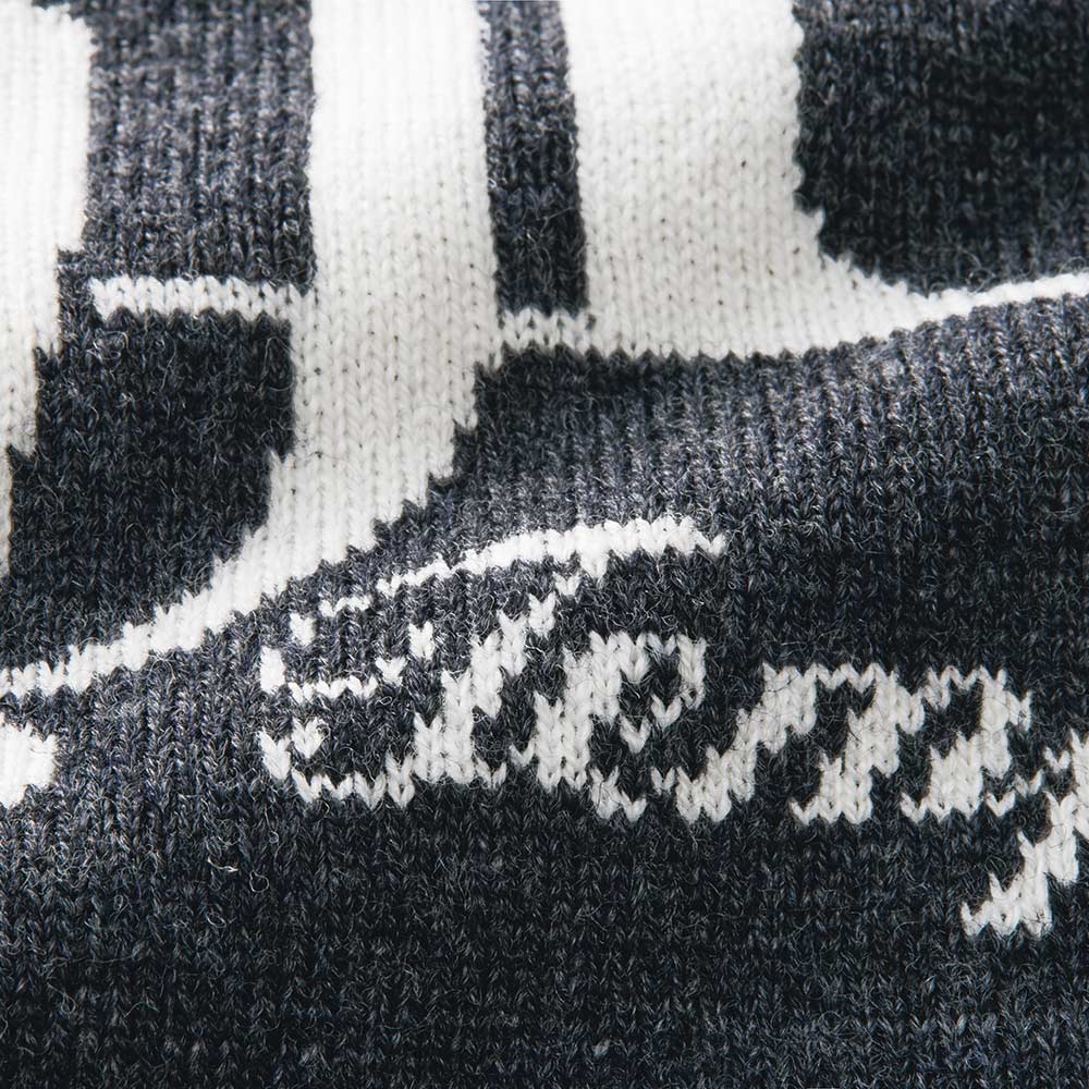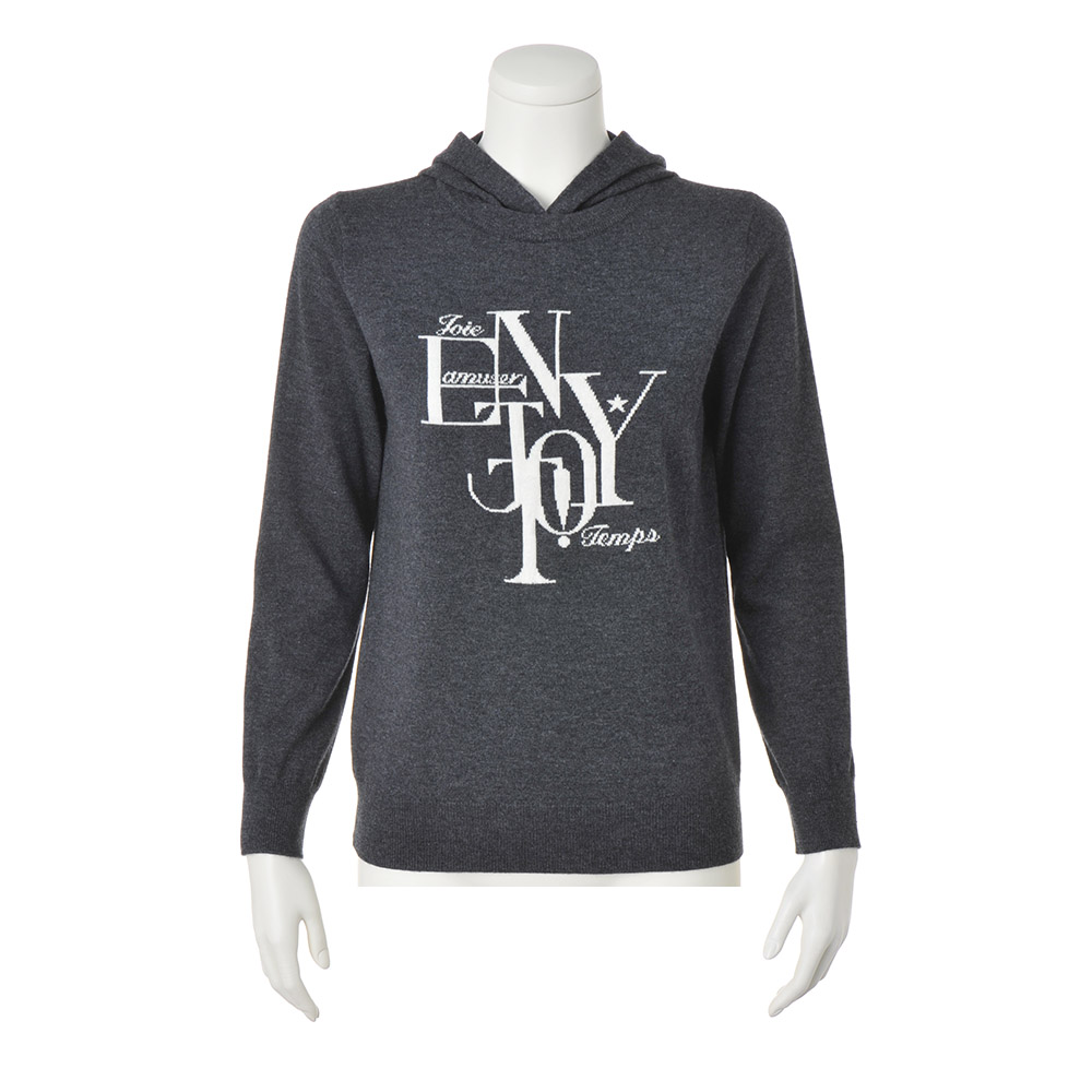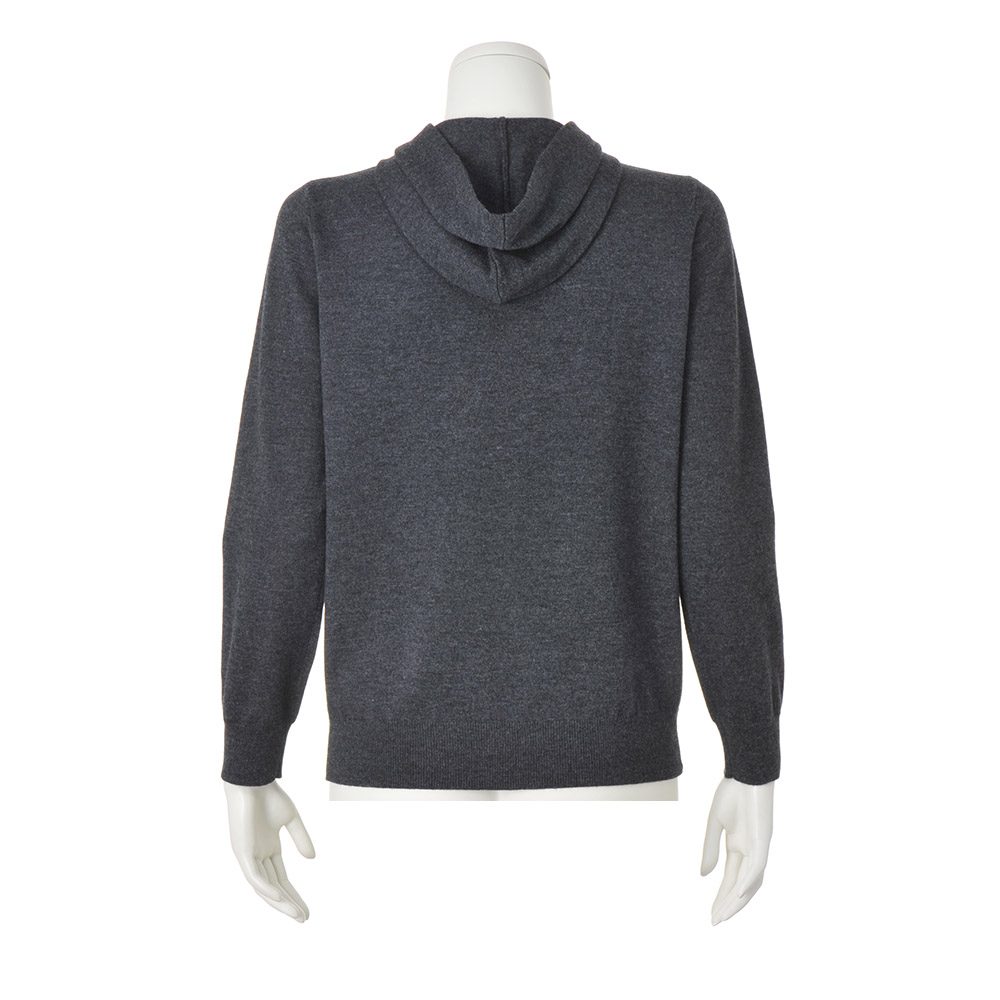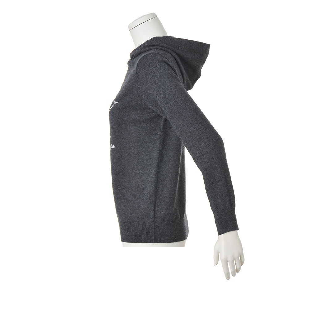 RICH CASUAL新基準で更新する、洒脱なスタイル。本物を知る大人にふさわしいのは、これ見よがしに華美な装いではなく、時代の息吹を軽やかに、肩肘張らない上質さを感じさせる最新カジュアル。細リブのネックラインにフードを付けた、後ろ姿も小粋なニット。梳毛と紡毛2種類の糸を撚り合わせ、上品な膨らみ感と軽やかな着心地の天竺編みで仕上げました。メランジグレーに浮かぶ胸元のグラフィカルなロゴが目を引くアクセント。細かな模様や筆記体の文字を滑らかに表現するため、ロゴ部分のみジャカード編みにしています。