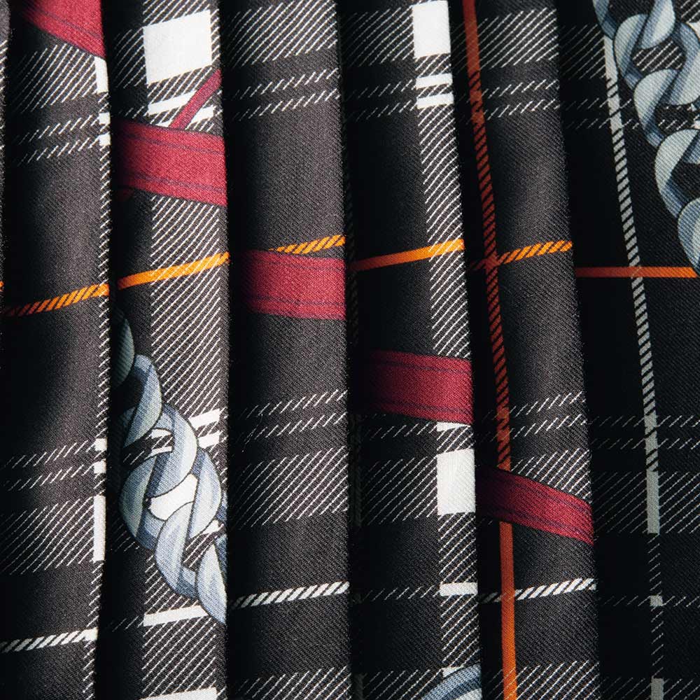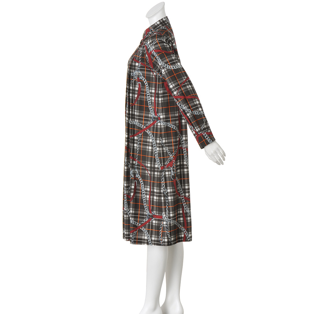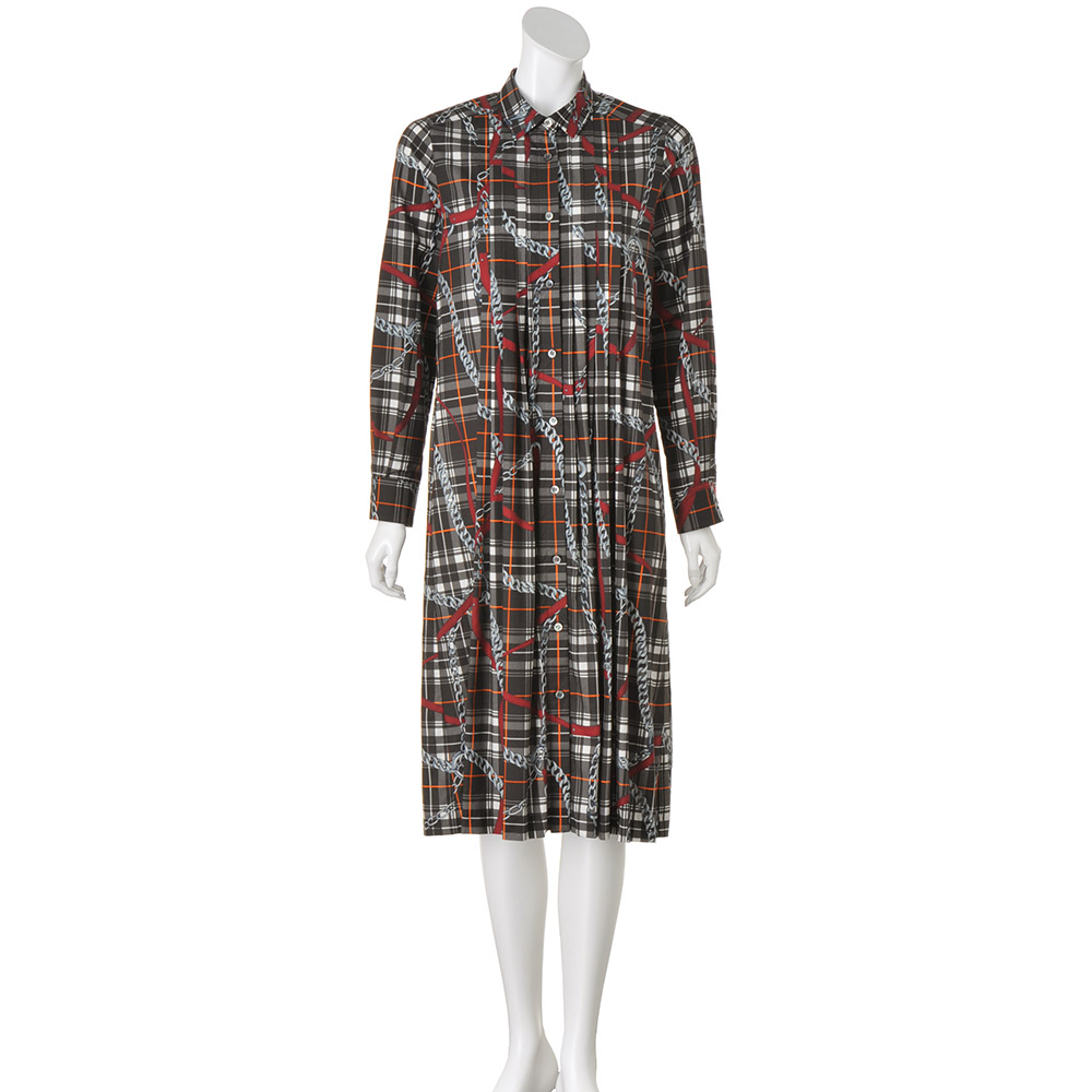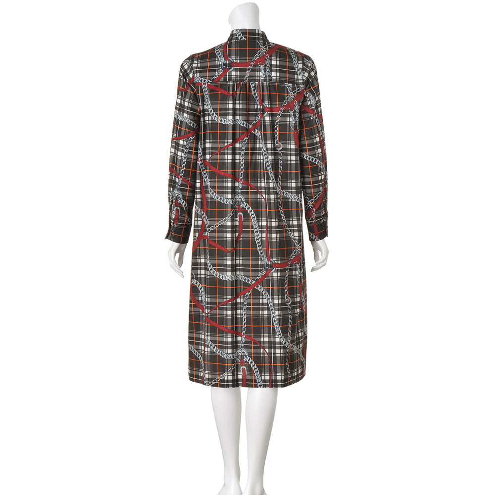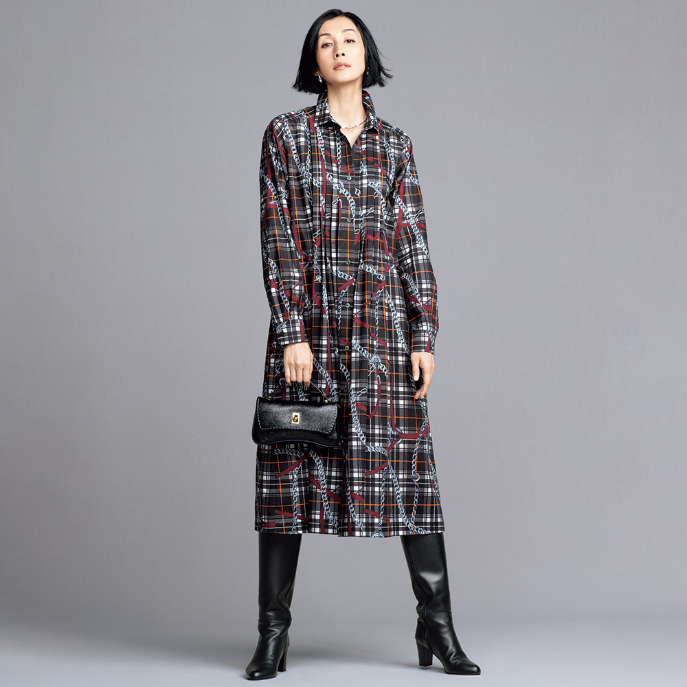 AUTUMN TONE GRAYISH大人のセンスが光るグレーの繊細美を纏う。デイリースタイルに繊細なモード感を授けるなら、グレーのカラーパレットに注目!大胆アレンジが楽しいクラシカル柄の新境地。膝下丈のシャツワンピースといえば、DAMAコレクション屈指の人気アイテム。待望の新作は、英国調の気品が香るダークグレー×ホワイト×オレンジのチェックと、ボルドーのテープがアクセントになったチェーンベルト柄を融合したレトロエレガントなプリントが登場。シンプルでありながらドラマティック、クラシカルでありながらモード…イタリア「RATTI」社の遊び心を品良く満喫できる一着です。もちろん、着る人を美しく見せるデザインは、そのまま踏襲。前身頃の左右に5本ずつ入れた中縫いタックで柄を軽妙に崩してこなれ感を演出しつつ、ウエスト辺りで縫い離してふんわりとしたニュアンスのある佇まいを演出。一方後ろヨークは、切り替え下のギャザーで柔らかな膨らみをもたせて、エレガントなバックスタイルを印象付けています。