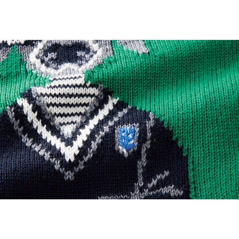 スポーティーカジュアルの最適解。スポーツテイストを大人の日常着に落とし込むなら「きれいめシンプル」でなじみやすく。テニスに行く時でなくても、注目の的になりそう。秋から着られるよう、メリノウールにコットンを高混率でブレンド。テニスプレーヤーらしくチルデンセーターを着た犬の、服の柄や小物の細部までジャカード編みで表現された、大人の遊び心をくすぐるニットです。