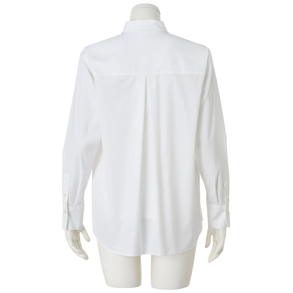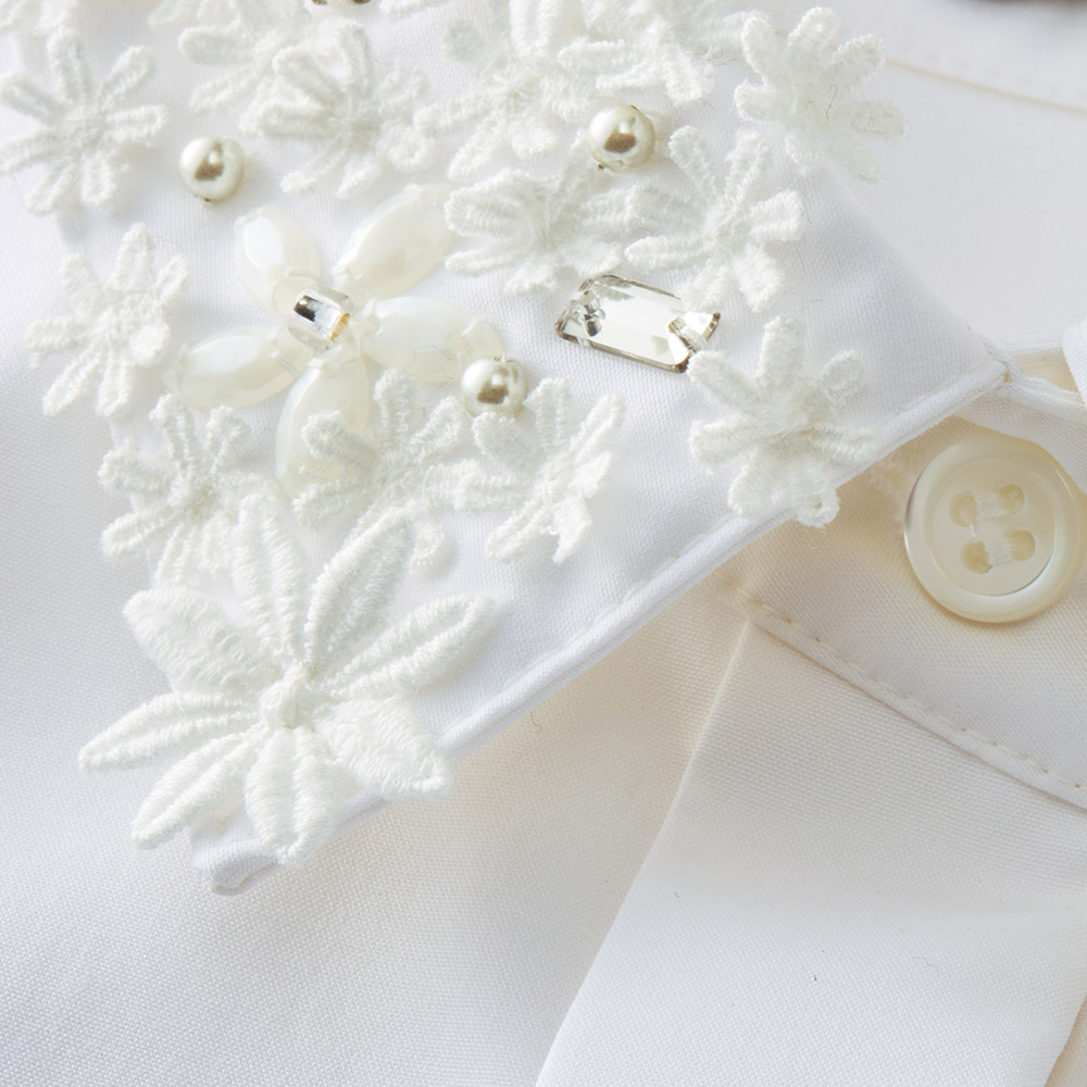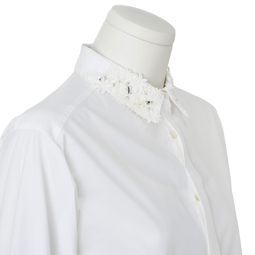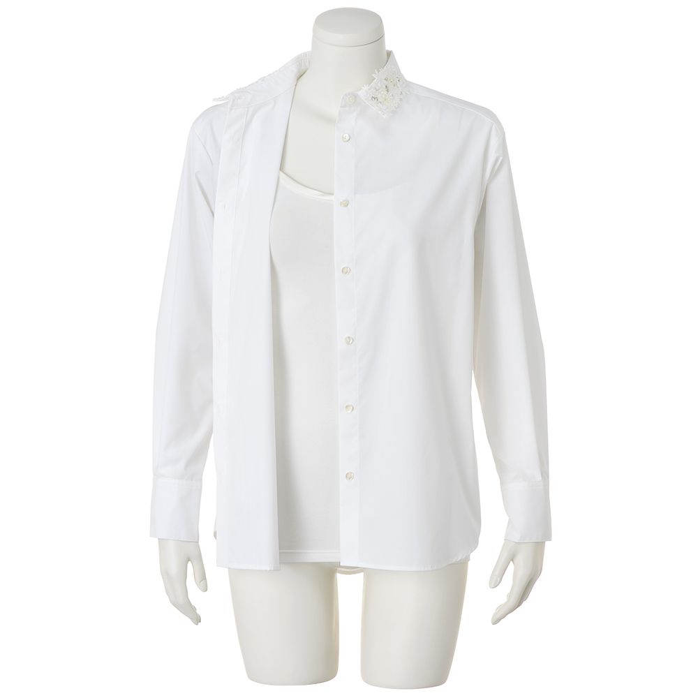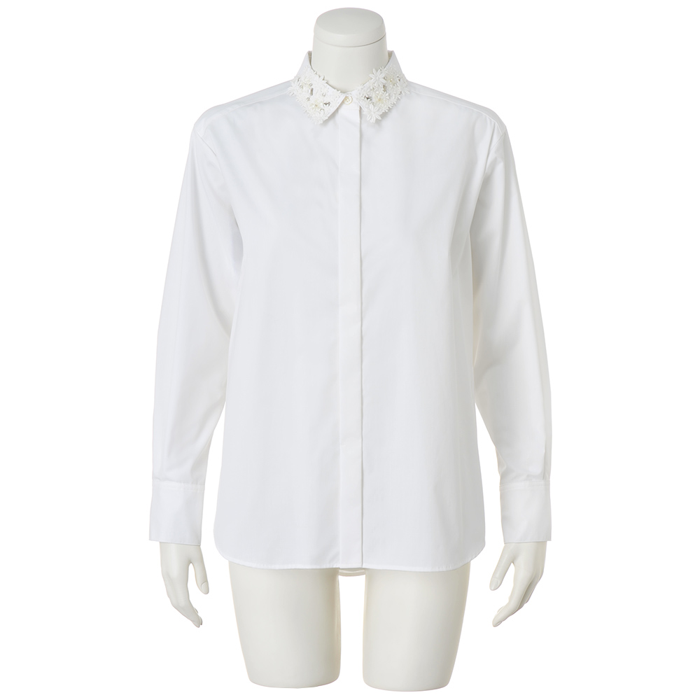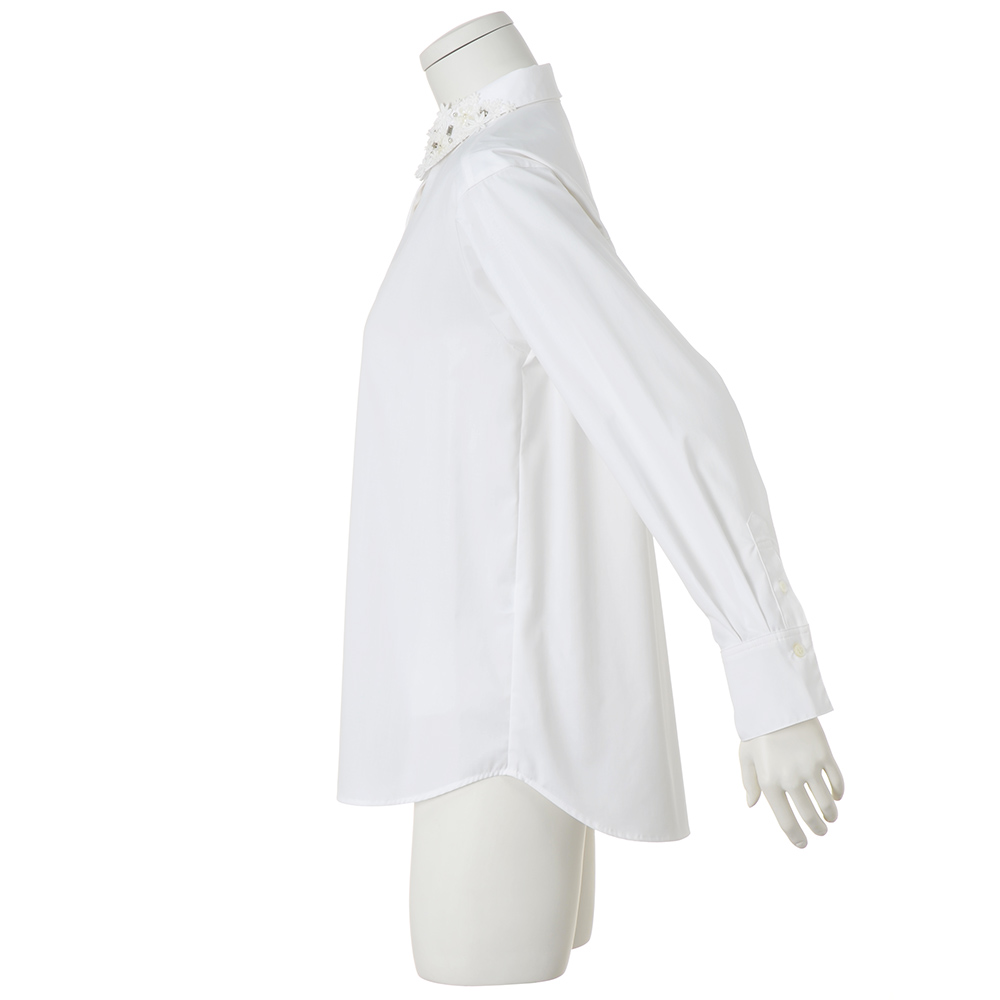 光沢感と滑らかな肌触りが特徴のコットン混ブロード素材の比翼仕立てシャツ。襟部分に花モチーフのケミカルレースとビジュー、パールビーズを刺しゅうし、顔周りに洗練された華やぎを添えて。清楚な装飾がマチュアな気品を醸し出します。≫ POINT程良くゆとりを持たせたシルエット。逆比翼仕立てで印象はすっきり。