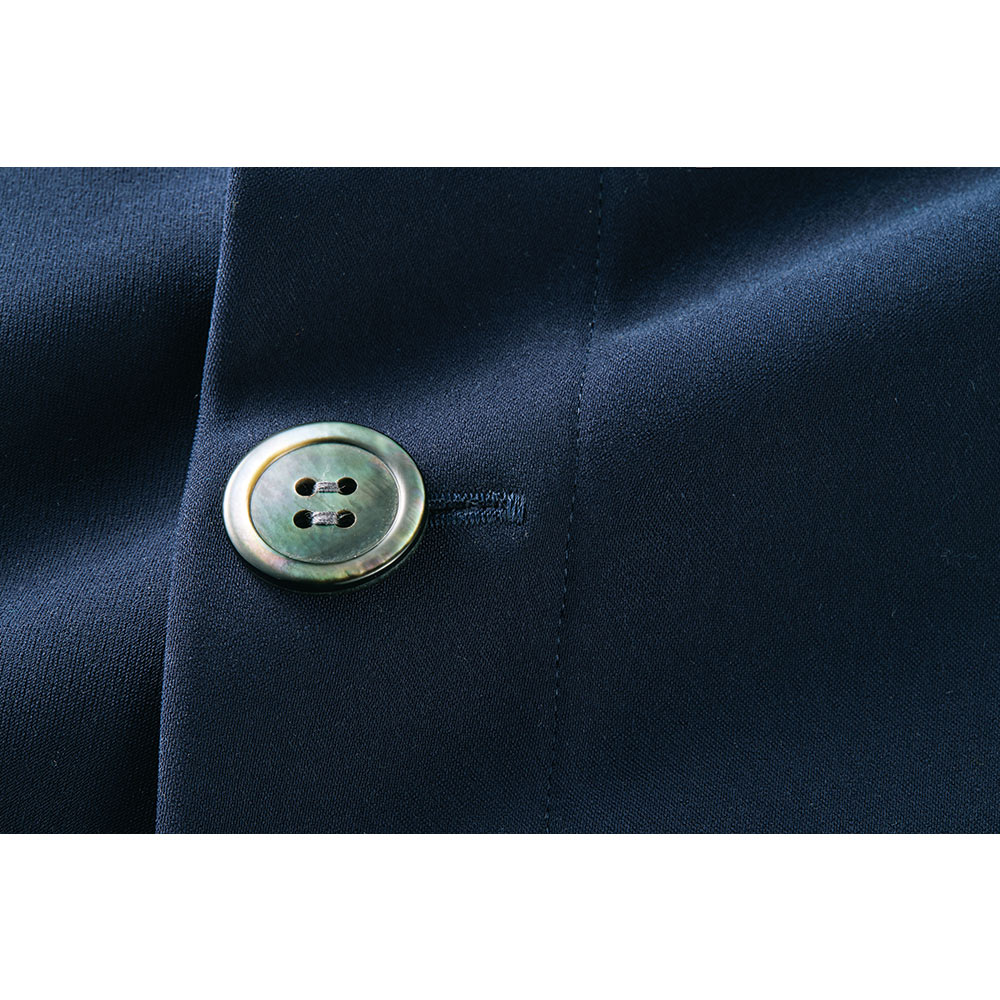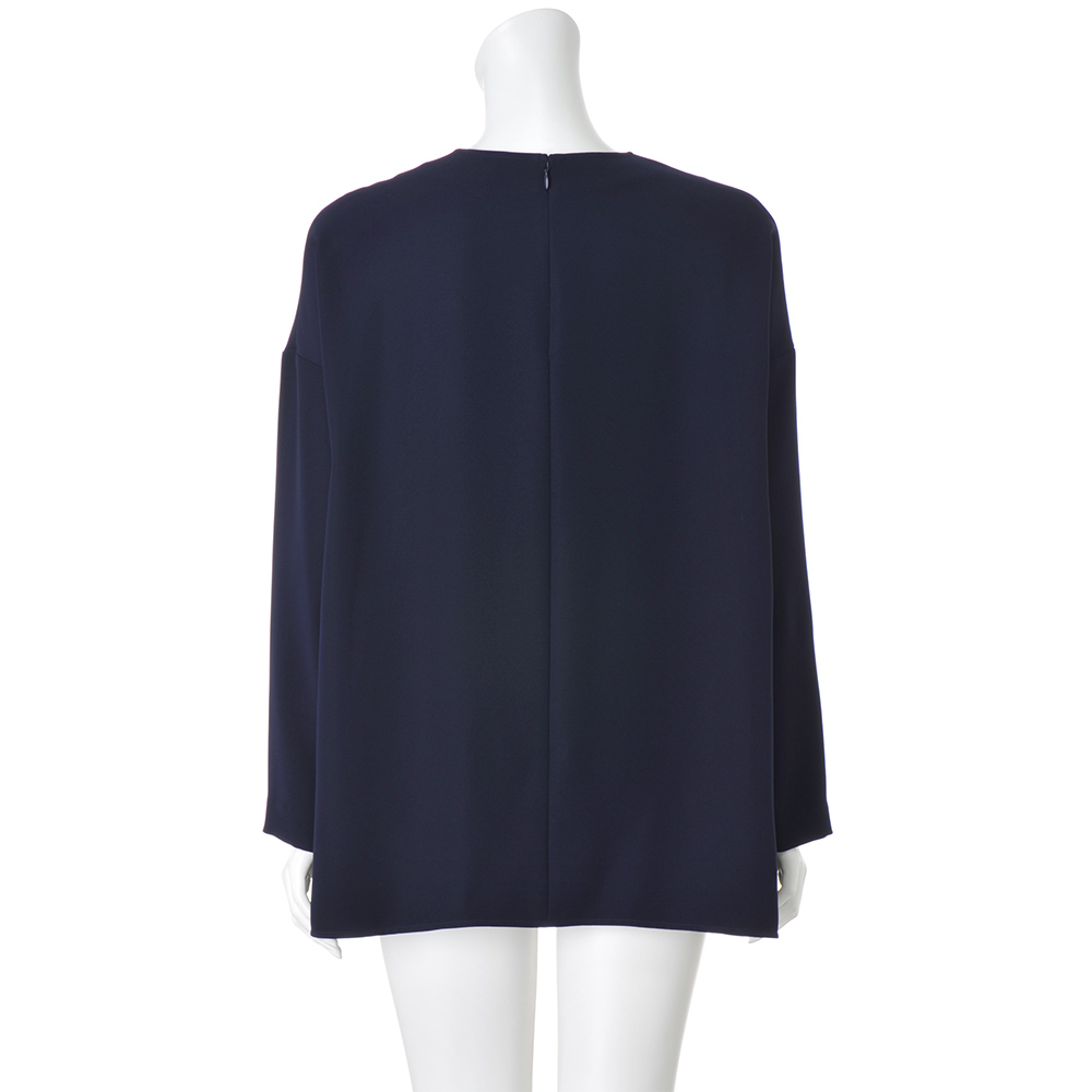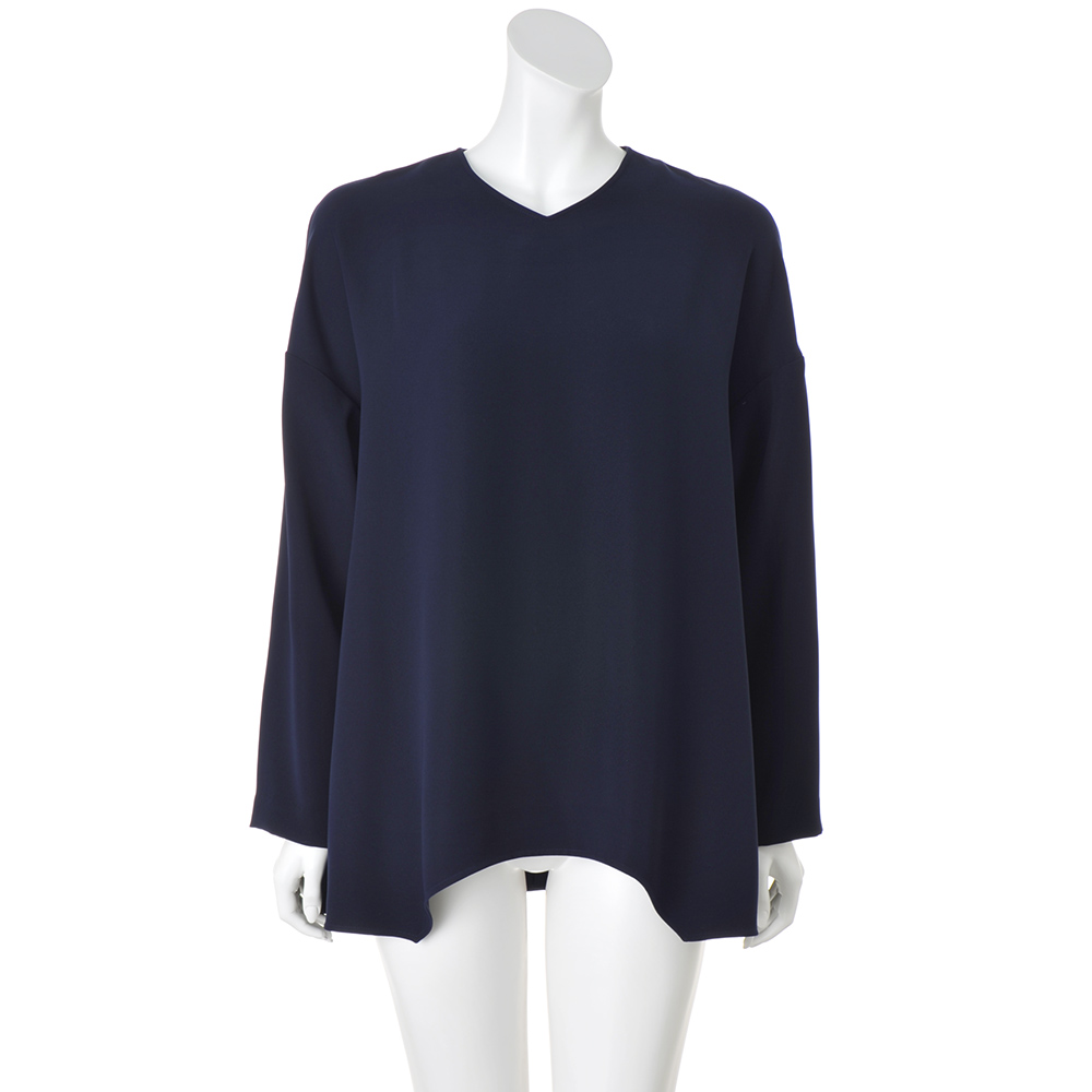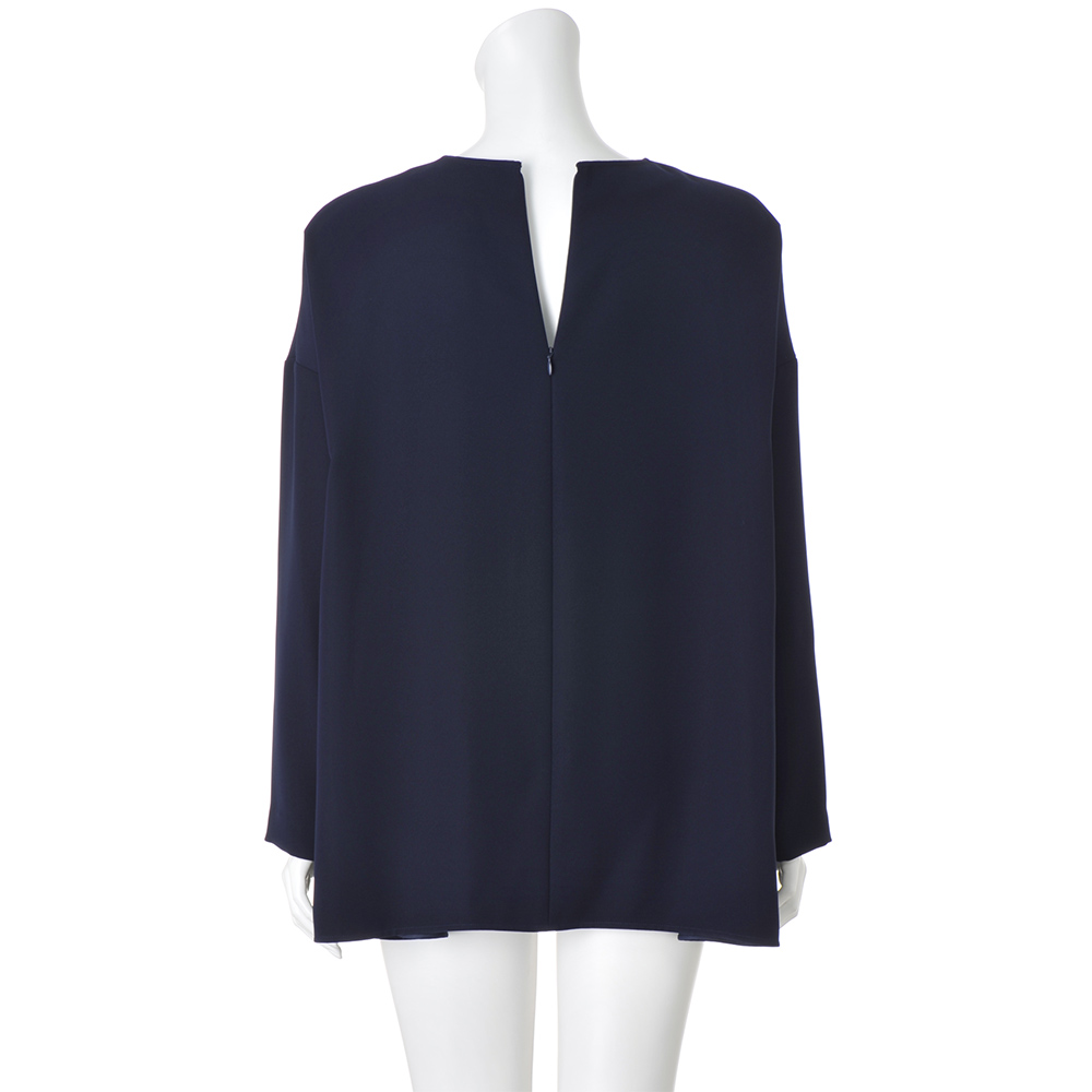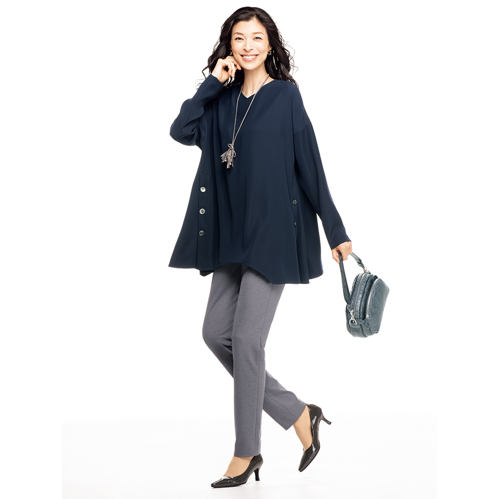 TUNIC今秋のエッセンスをいち早く先取り。ワントップでニュアンスが完成し、体型カバー力にも優れたチュニック。エレガンス派もカジュアル派も満足していただける選り抜きのアイテムをどうぞ。プルンとした膨らみ、パウダリーな表情が魅力のダブルクロス。着用シワが目立ちにくい品格漂う素材を贅沢に使用し、日常から華やかな席までオールマイティーに着回せる一着に仕上げました。フレアーフォルムの身頃は、ドレープが静かに波打って無地なのにニュアンスリッチ。両脇下がりのイレギュラーヘム、ベントの黒蝶貝ボタンでアイポイントを添えています。また、肩をぐっと落としたドロップショルダーが鮮度のいいシルエットを生んで。襟ぐりは浅いV開きを採用し、女性らしさをキレよく薫らせました。瑞々しく清楚なネイビーが好印象を後押しするファクターに。