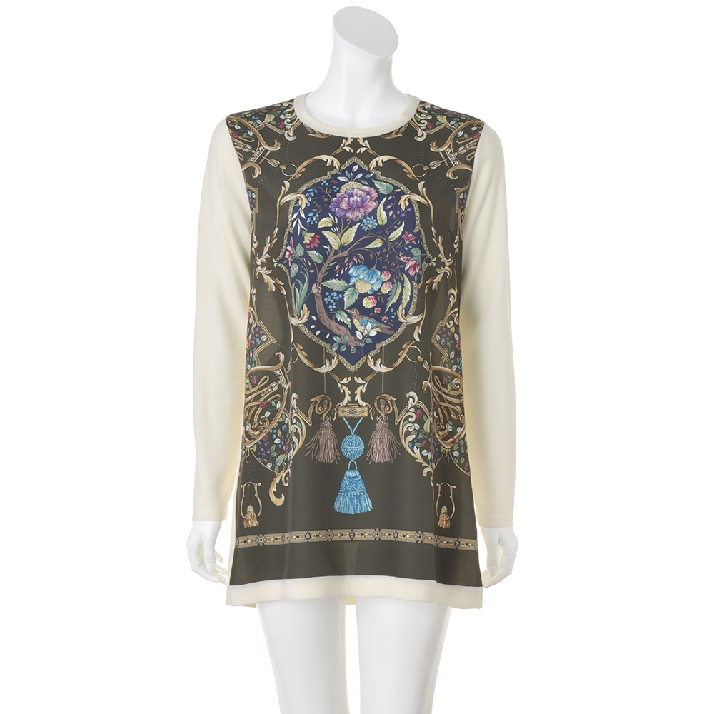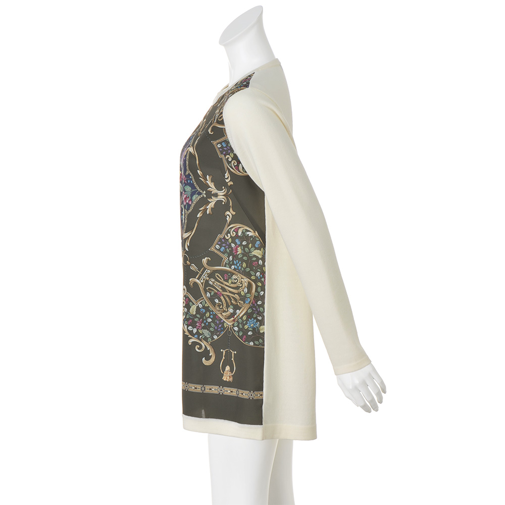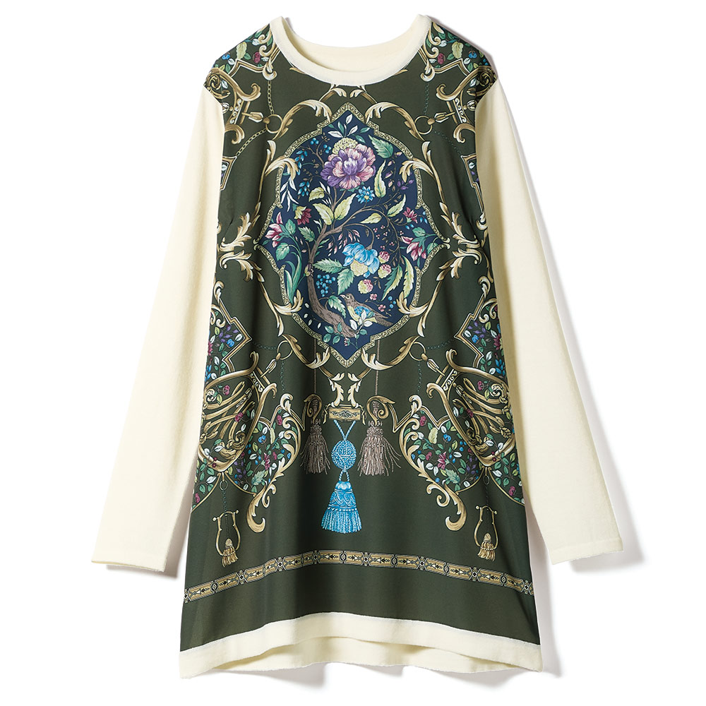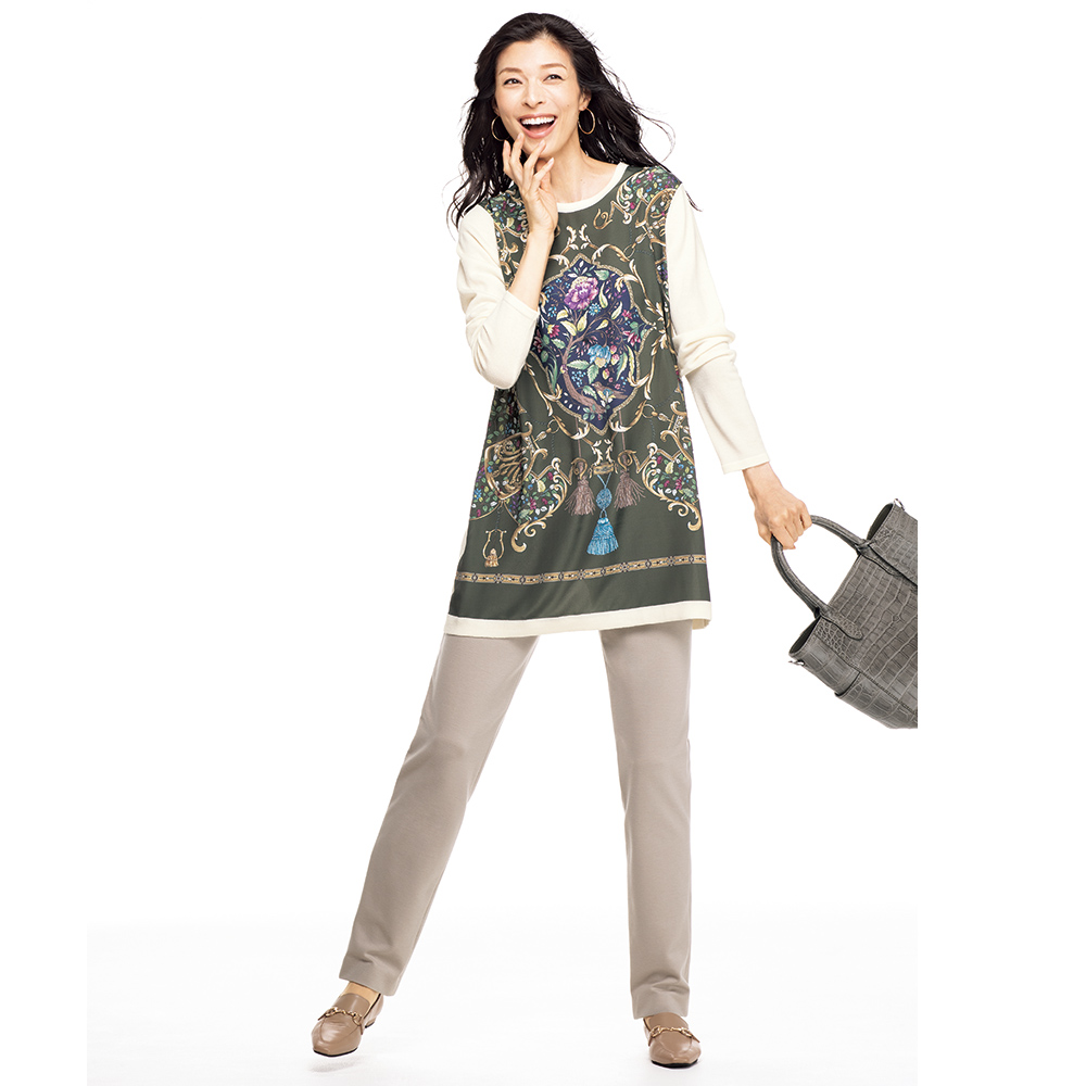TUNIC今秋のエッセンスをいち早く先取り。ワントップでニュアンスが完成し、体型カバー力にも優れたチュニック。エレガンス派もカジュアル派も満足していただける選り抜きのアイテムをどうぞ。主役級プリントと上質ニットの合わせ技お洒落好きご用達のドッキングチュニックが、新柄でお目見えしました。思わず目が留まる華麗なプリントは、繊細な筆致が綴るボタニカルモチーフとオーナメント柄。ツイル地の光沢がゴールドの絵柄を引き立てて、ヒロイン級の見映えを演出します。カーキを基調にしているため華美にならず、どこかモダンに映るのも大人好みです。合わせたニットは繊維が細く、ソフトな肌触りが特徴のオーストラリア産エクストラファインメリノウール。ふわっと軽く柔らかな風合いが、暖かい空気を纏うような着心地を叶えます。後ろ身頃を一面オフホワイトのニットに仕立てることで、シンプルかつ可憐な表情に。ディテールの妙で魅せる大人のシンプリシティパネルプリントを囲んで襟ぐり・裾にもニットを配し、異素材を一体化。オフホワイトが秋冬の明るい差し色に。