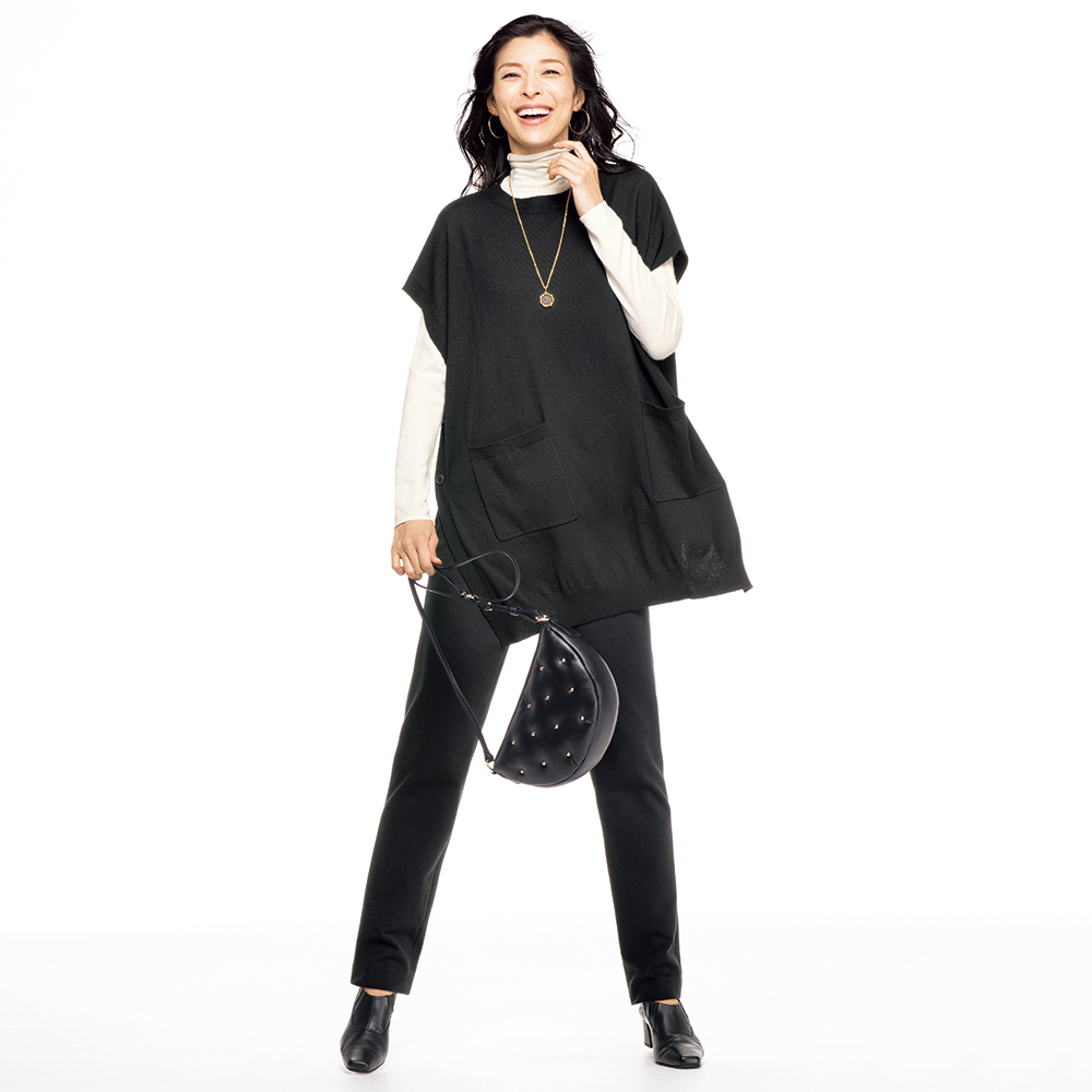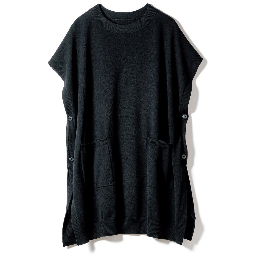 TUNIC今秋のエッセンスをいち早く先取り。ワントップでニュアンスが完成し、体型カバー力にも優れたチュニック。エレガンス派もカジュアル派も満足していただける選り抜きのアイテムをどうぞ。レイヤードを洗練に導くモードなブラック暑さが続く日は一枚でプルオーバーとして、寒くなったらジレとして、シーズンを跨いで使い回せる便利なチュニックが登場します。ドレープが浮かぶニット地は程良い膨らみ感と軽やかさを兼ね備えた極細ウールを編み立てたもの。それゆえ着膨れ感がなく、滑らかでサラリとした着心地です。その糸を贅沢に使って、ボディが泳ぐエフォートレスなシルエットを描きました。身頃脇はリブ編みに切り替え、襟ぐりはリブテープで縁取り、シャープな表情に纏めています。両脇ベントの飾りボタン、パッチポケットなどディテールがさりげないアクセントに。ディテールの妙で魅せる大人のシンプリシティスクエア型の身頃はボディが入るとポンチョ風になって、身体の線を拾いづらくモードな着映えを発揮。
