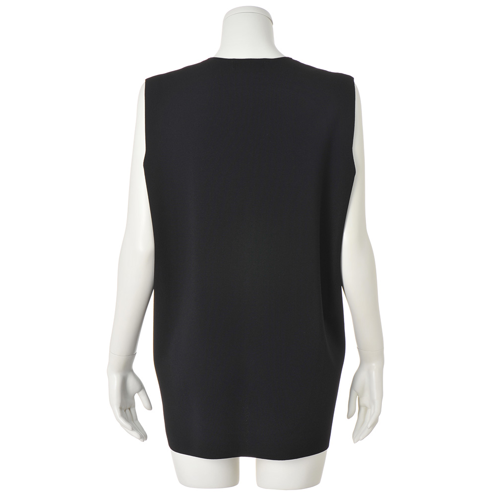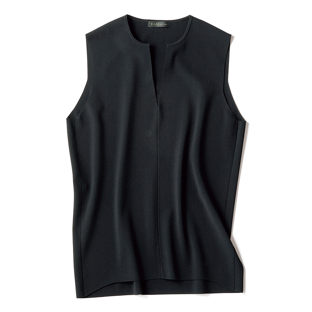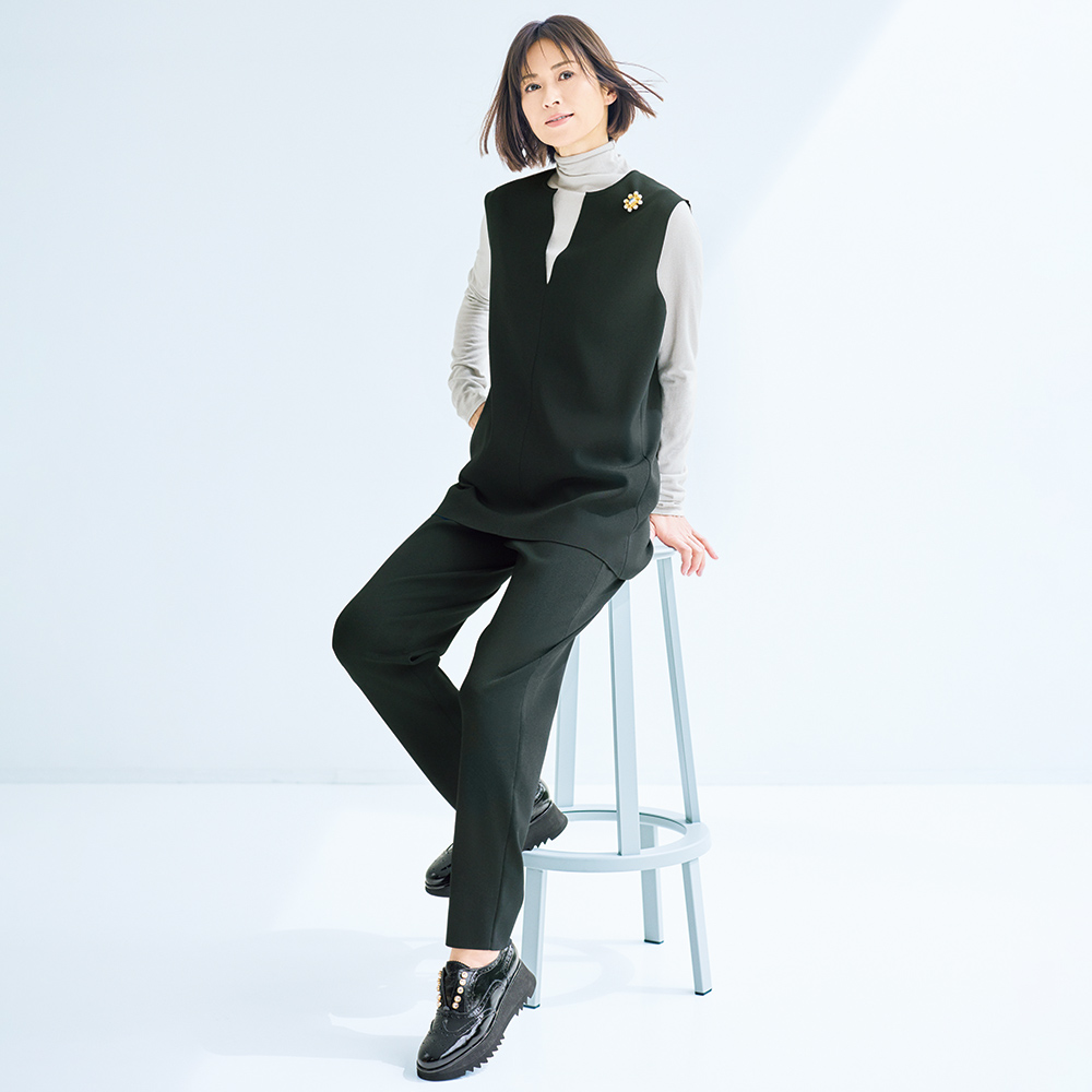 MINIMAL CHIC私らしさが輝く洗練ベーシックシンプルだから際立つ研ぎ澄まされた洗練とセンスが光る拘りで、着ればたちまちお洒落な印象に!ラクしてきちんと、は案外すぐに叶います。伸びやかさとキックバック性のある、しっかり目の詰まった布帛ライクな総針ニットでセットアップを作りました。ストレッチ糸を引き揃えて編み立てているのでハリ感もあり、フォルムの美しさが秀逸。シンプルに徹したデザインなので、単品使いも思いのままです。ジレは前振りにした脇線と裾の前後差で、後ろ裾をヒップに沿わせたモード感のあるシルエットに。季節の深まりに合わせてインナーを選べるよう、キーネック、深めのアームホール、ゆとりのある身幅にしています。≫ POINT動きやすく、オールシーズン着られ、家で洗える…、と良いこと尽くめ。単品でも活躍する万能アイテム。
