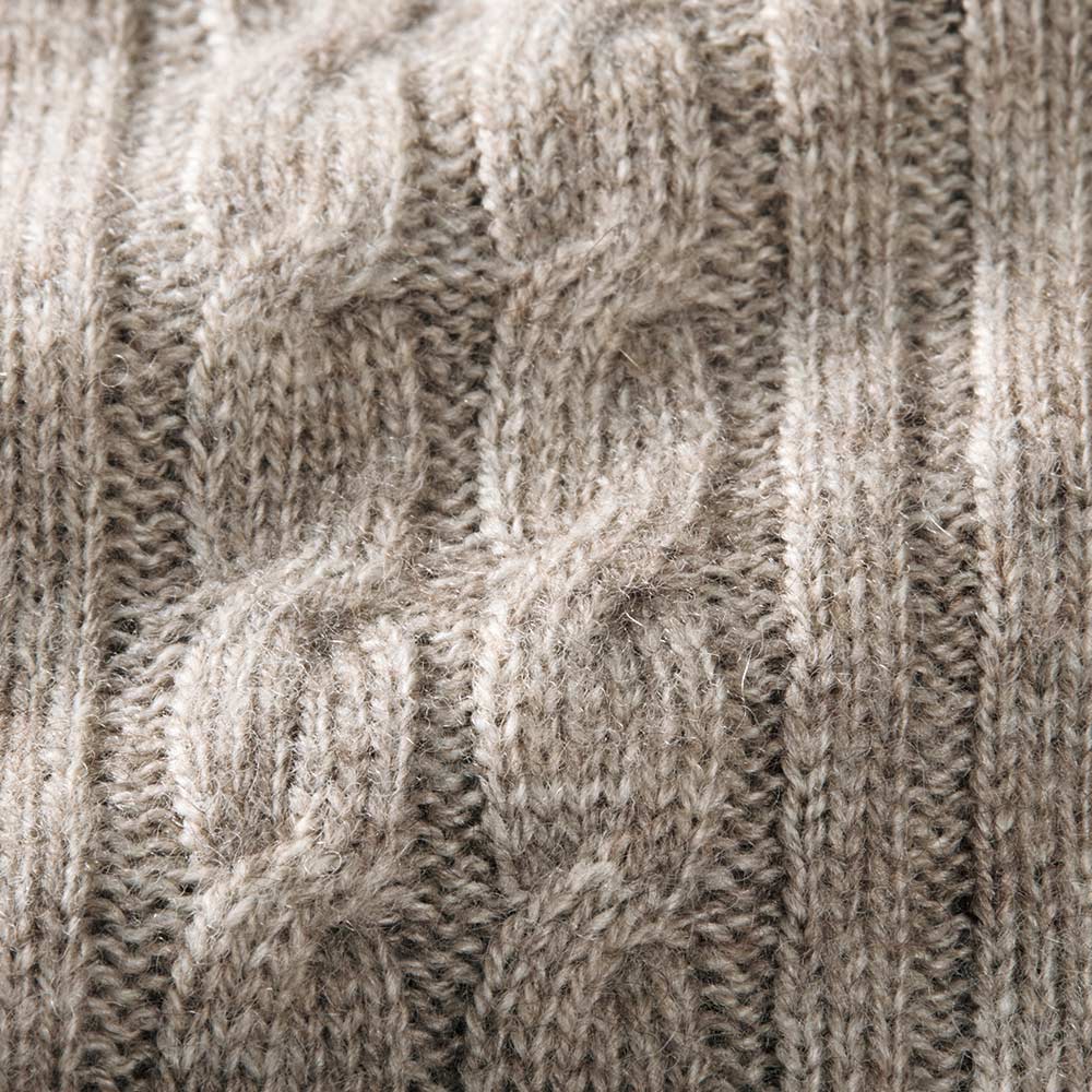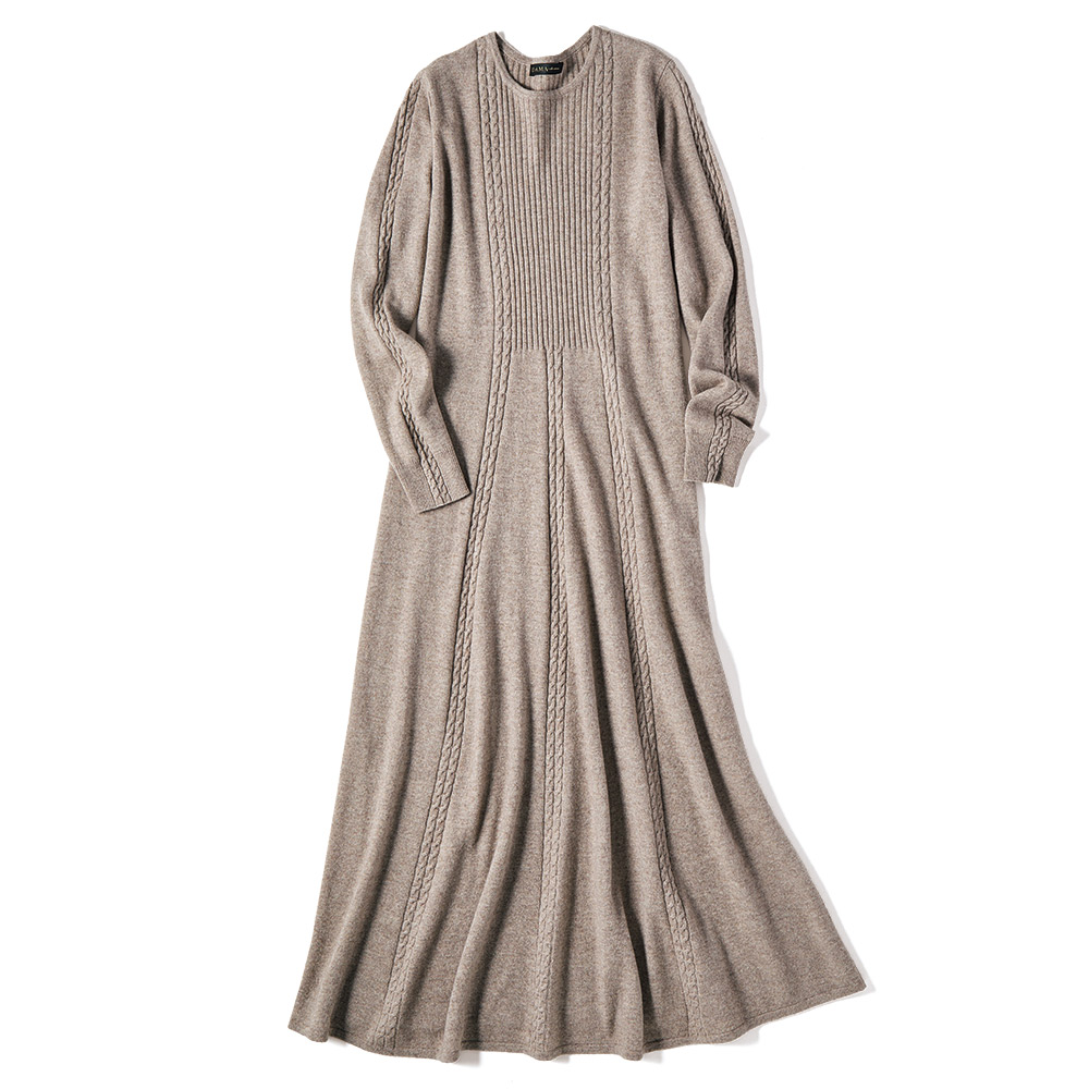 世代を越えて愛される、「温もり」のベーシック袖を通した時、ふと心がほどけるような心地よさこそ、冬のお洒落の愉しみのひとつ。エッセンシャルな素材をベースに、日常を潤す“上質感”、そしてトレンドをひと匙加味したワードローブ。自分だけでなく、誰かに教えたくなる、シェアしたくなる−。世代を問わず永く愛していただけるスタンダードアイテムをご紹介します。温もりを醸す季節のシグニチャーぬくぬくと暖かな着心地のケーブル柄ニットをご紹介。使用しているのは上質なウールにカシミヤを混紡し、リッチな風合いに仕上げた冬にぴったりの素材。ワンピースは、計算された編み地変化による美麗なシルエットが自慢。上身頃のリブが程良いフィット感を添え、裾まで繋げた縄編みが華やぎあるフレアーを構築しています。素肌に溶け込む明るいグレージュも上級者見えのファクターに。≫ POINT後ろ身頃も前同様のデザイン、肩線にも縄編みが入って、全方位隙のない一着に。