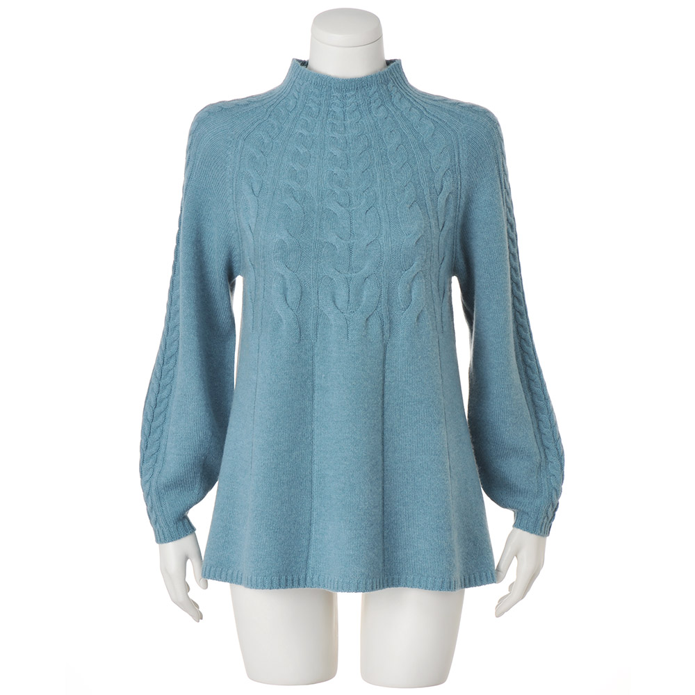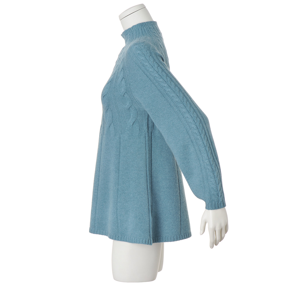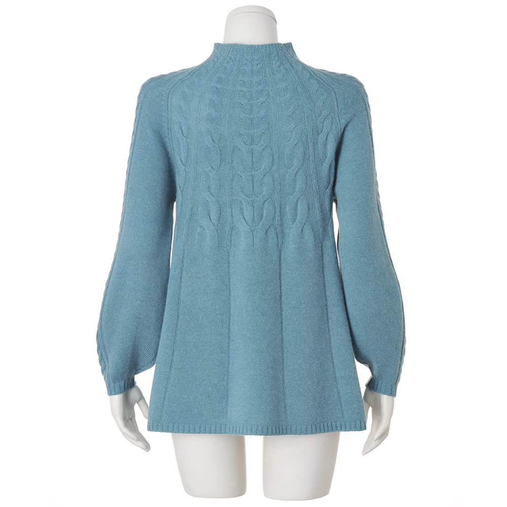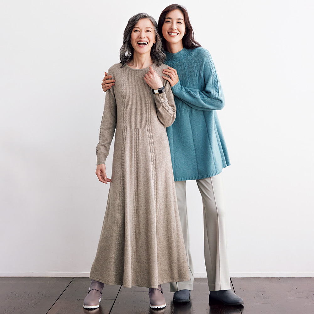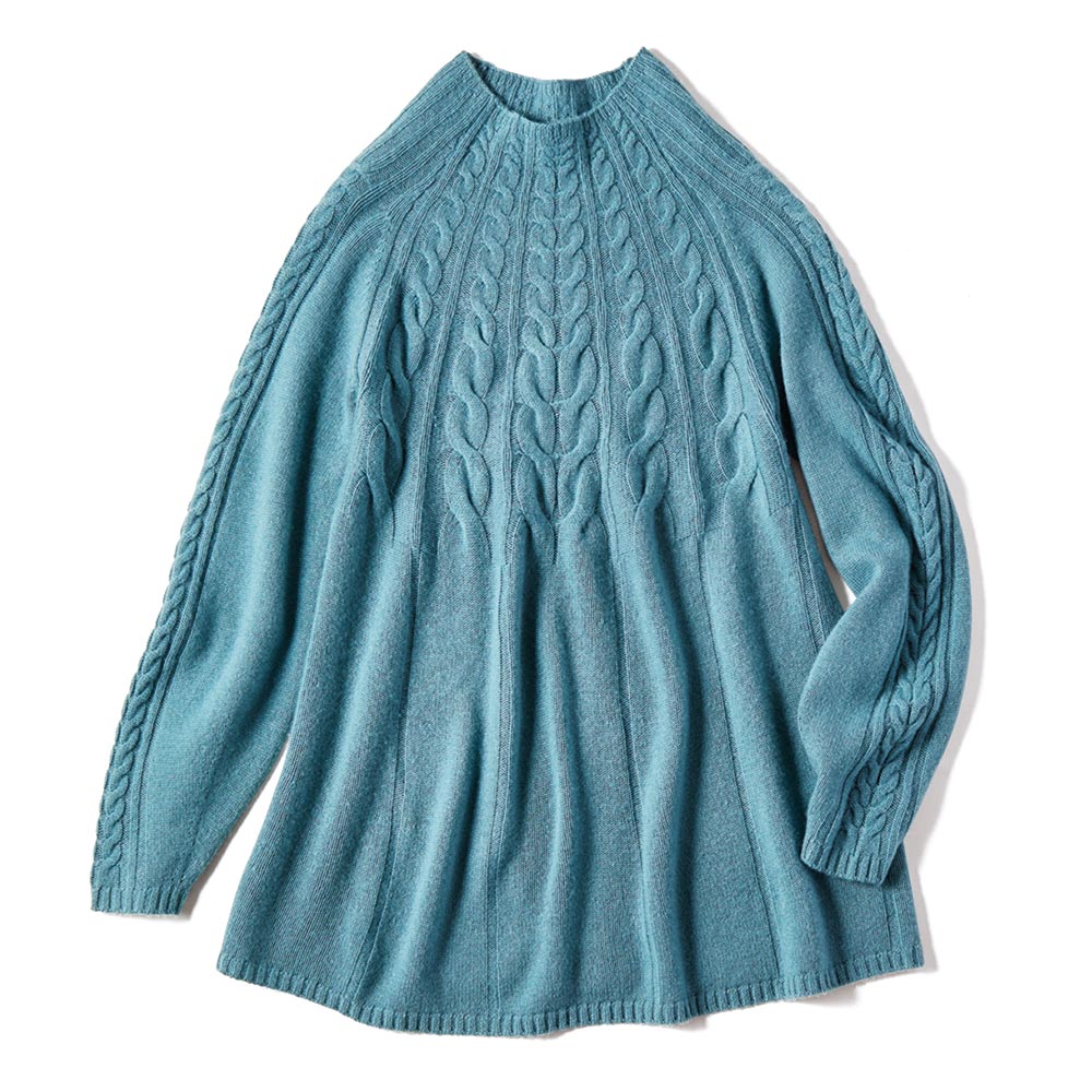 世代を越えて愛される、「温もり」のベーシック袖を通した時、ふと心がほどけるような心地よさこそ、冬のお洒落の愉しみのひとつ。エッセンシャルな素材をベースに、日常を潤す“上質感”、そしてトレンドをひと匙加味したワードローブ。自分だけでなく、誰かに教えたくなる、シェアしたくなる−。世代を問わず永く愛していただけるスタンダードアイテムをご紹介します。温もりを醸す季節のシグニチャーぬくぬくと暖かな着心地のケーブル柄ニットをご紹介。使用しているのは上質なウールにカシミヤを混紡し、リッチな風合いに仕上げた冬にぴったりの素材。ターコイズのチュニックは、首元から広がる求心状のケーブル柄がフォトジェニック。2本取りミドルゲージで立体感を付け、袖山にも細やかな編み込みをあしらいました。≫ POINTケーブル間・肩部分のリブが、すっきりした身体沿いを奏功。裾部分はほんのりフレアー。
