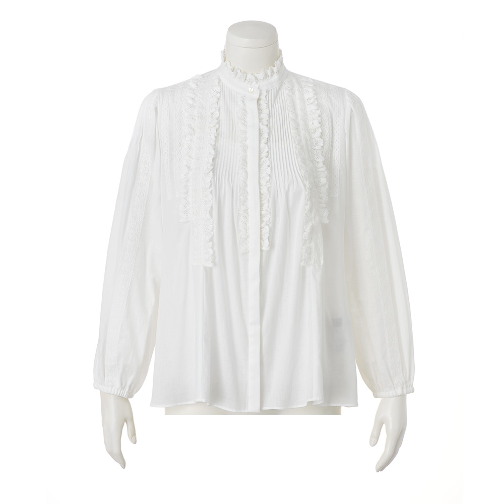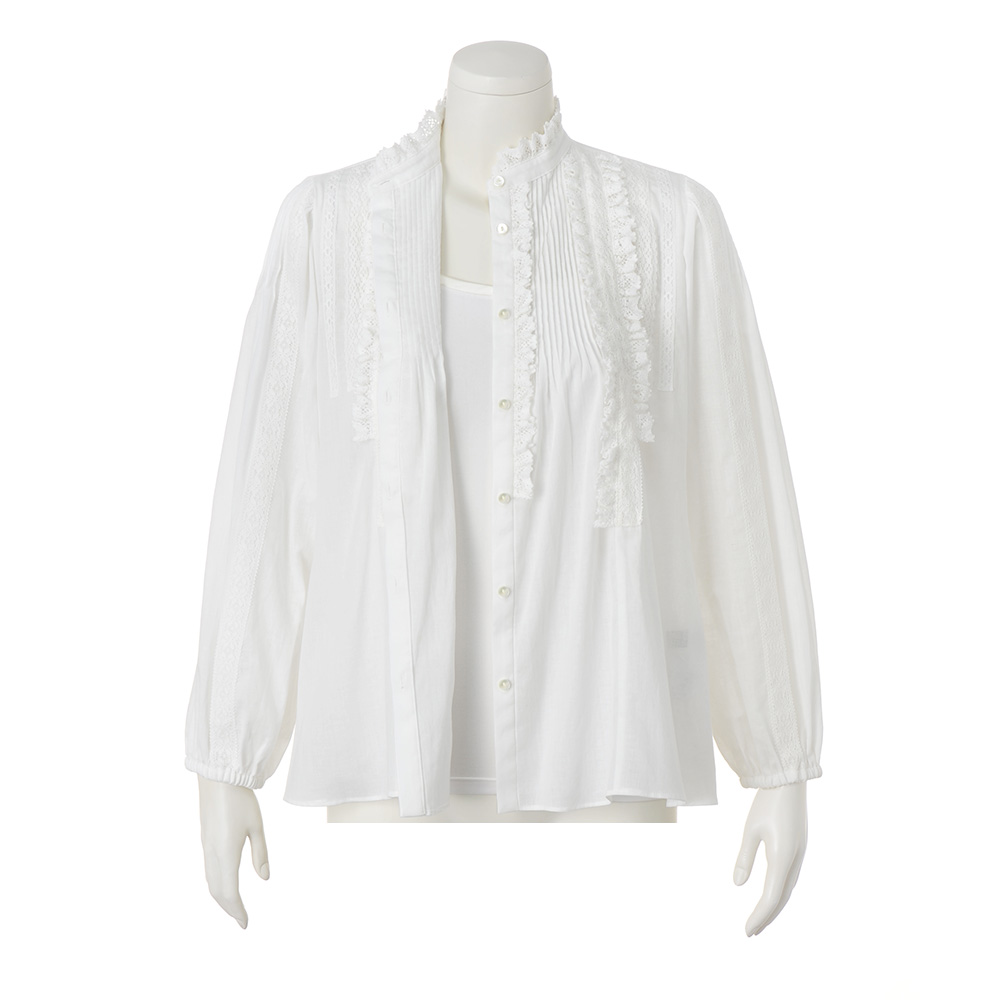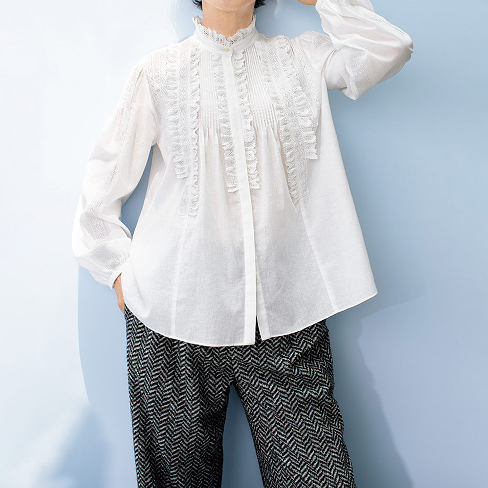 クラシックに気高さを纏って。黒の品格と白の清廉さは、美しい女性のワードローブに欠かせないもの。心華やぐ季節は、甘やかに女性らしく、品格に満ちた黒と白のエレガンスが似合います。柔らかな風合いに癒やされるコットンガーゼのブラウス。国内で丁寧に編み立てた4種類のトーションレースと繊細なピンタックをふんだんにあしらい、ナチュラル・ラグジュアリーな一着に仕立てました。レースの付け止まりをイレギュラーにすることで動きが出て、さりげないスタイルアップ効果も付与。また、袖口はゴム仕様なので、プッシュアップすると袖に立体的なボリュームが生まれます。≫ POINT愛用するほどに、肌になじんでいく柔らかなコットンガーゼ地。ブラックとオフホワイト、どちらも出番の多い定番トップスに。