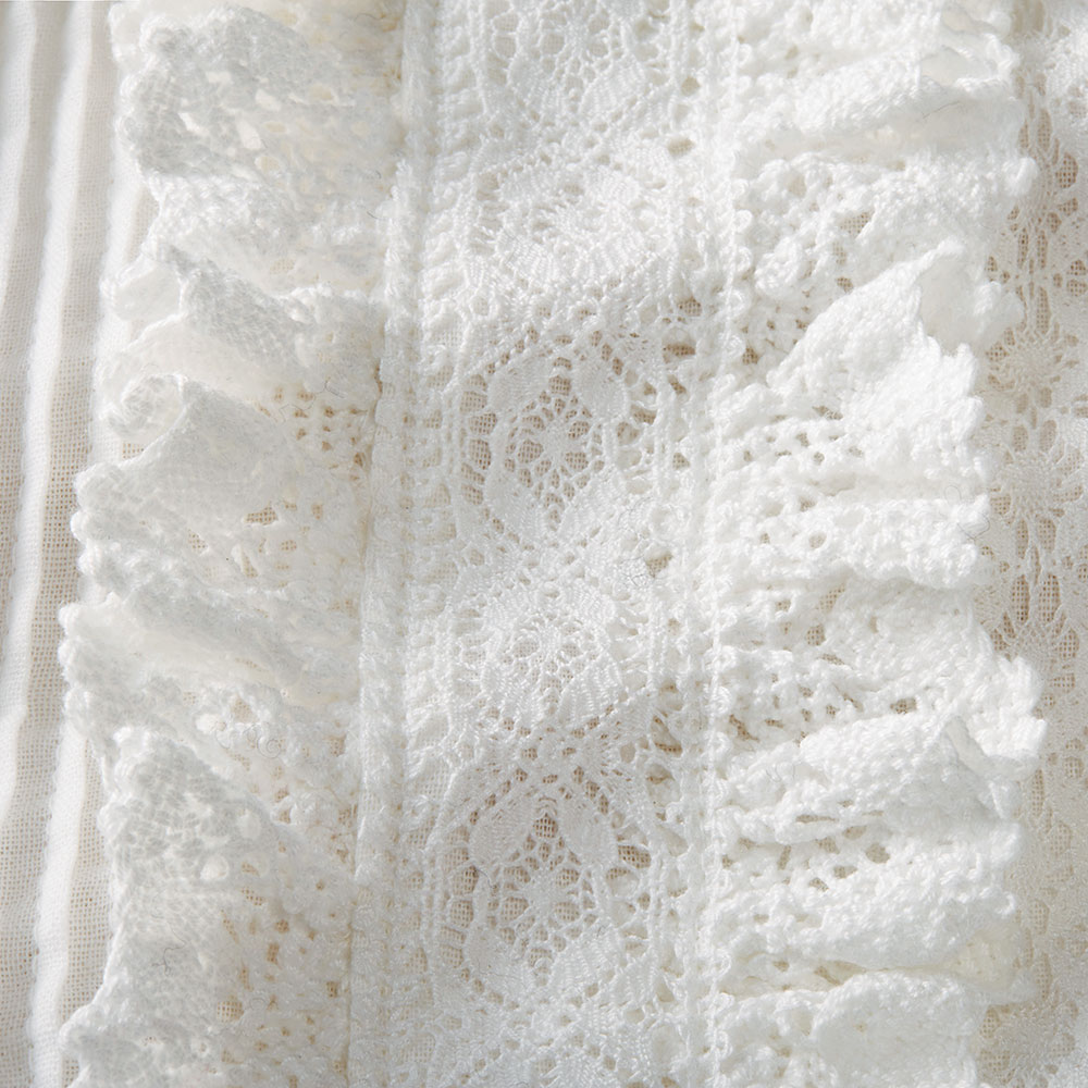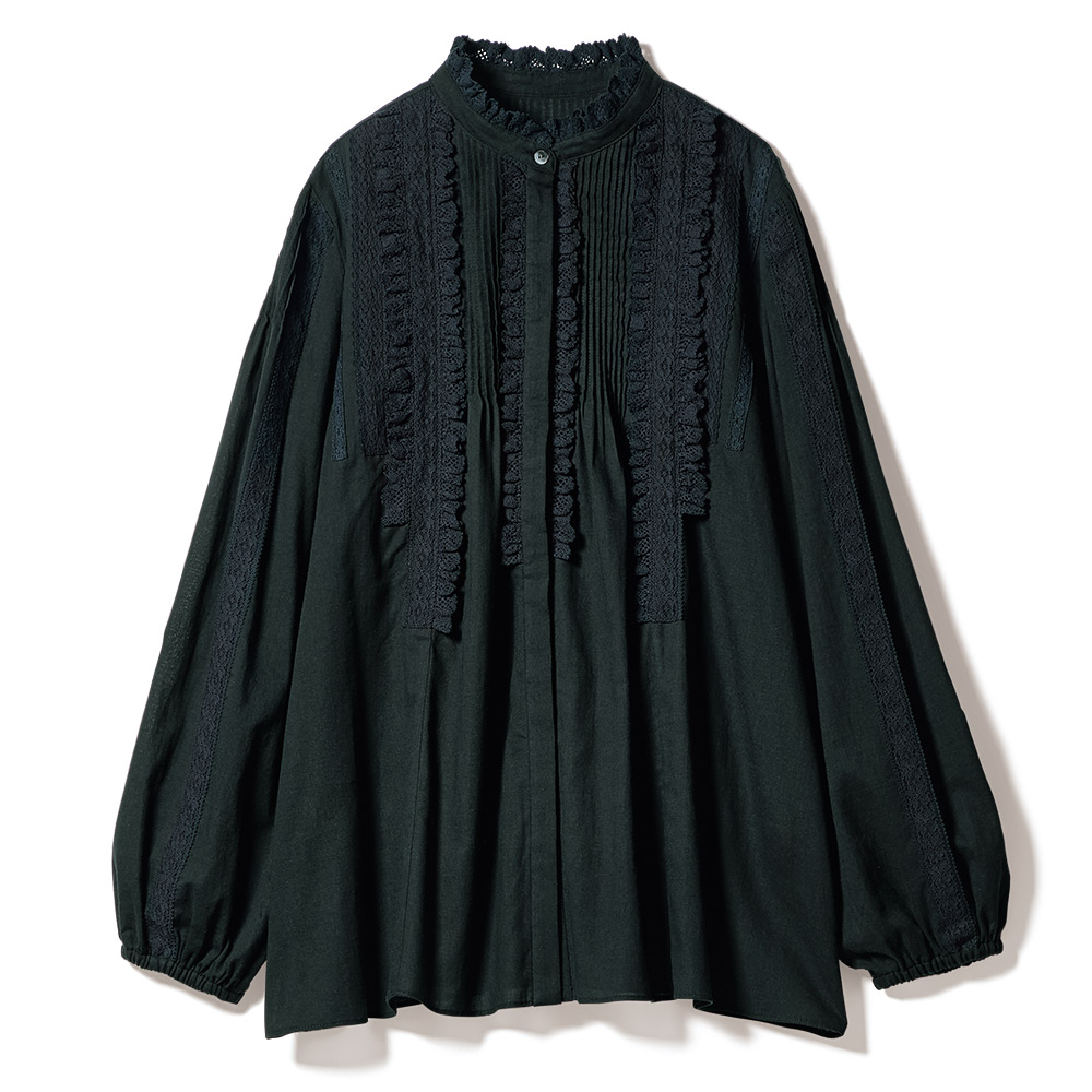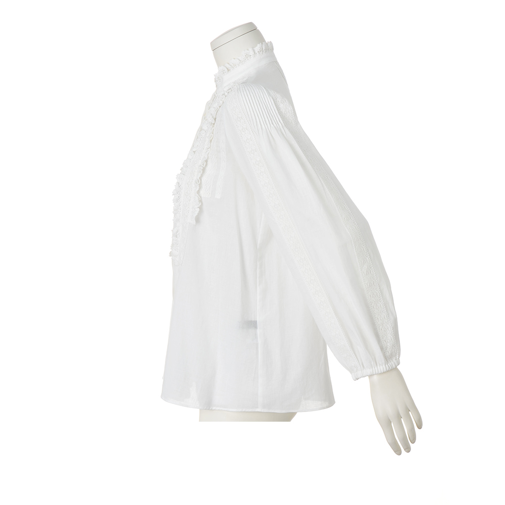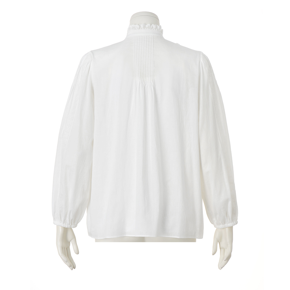クラシックに気高さを纏って。黒の品格と白の清廉さは、美しい女性のワードローブに欠かせないもの。心華やぐ季節は、甘やかに女性らしく、品格に満ちた黒と白のエレガンスが似合います。柔らかな風合いに癒やされるコットンガーゼのブラウス。国内で丁寧に編み立てた4種類のトーションレースと繊細なピンタックをふんだんにあしらい、ナチュラル・ラグジュアリーな一着に仕立てました。レースの付け止まりをイレギュラーにすることで動きが出て、さりげないスタイルアップ効果も付与。また、袖口はゴム仕様なので、プッシュアップすると袖に立体的なボリュームが生まれます。≫ POINT愛用するほどに、肌になじんでいく柔らかなコットンガーゼ地。ブラックとオフホワイト、どちらも出番の多い定番トップスに。