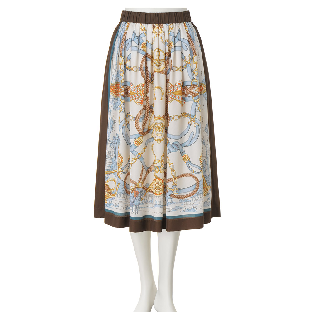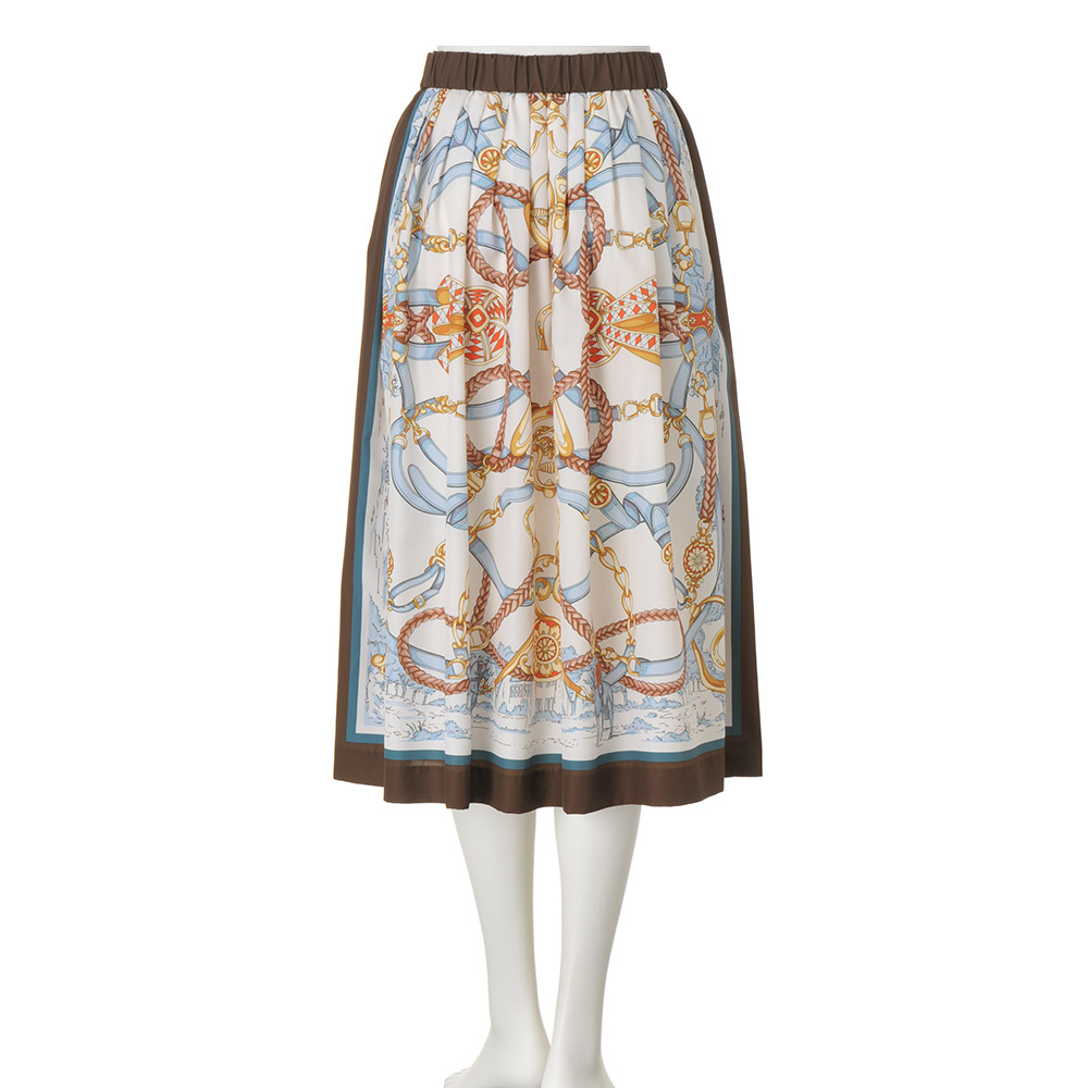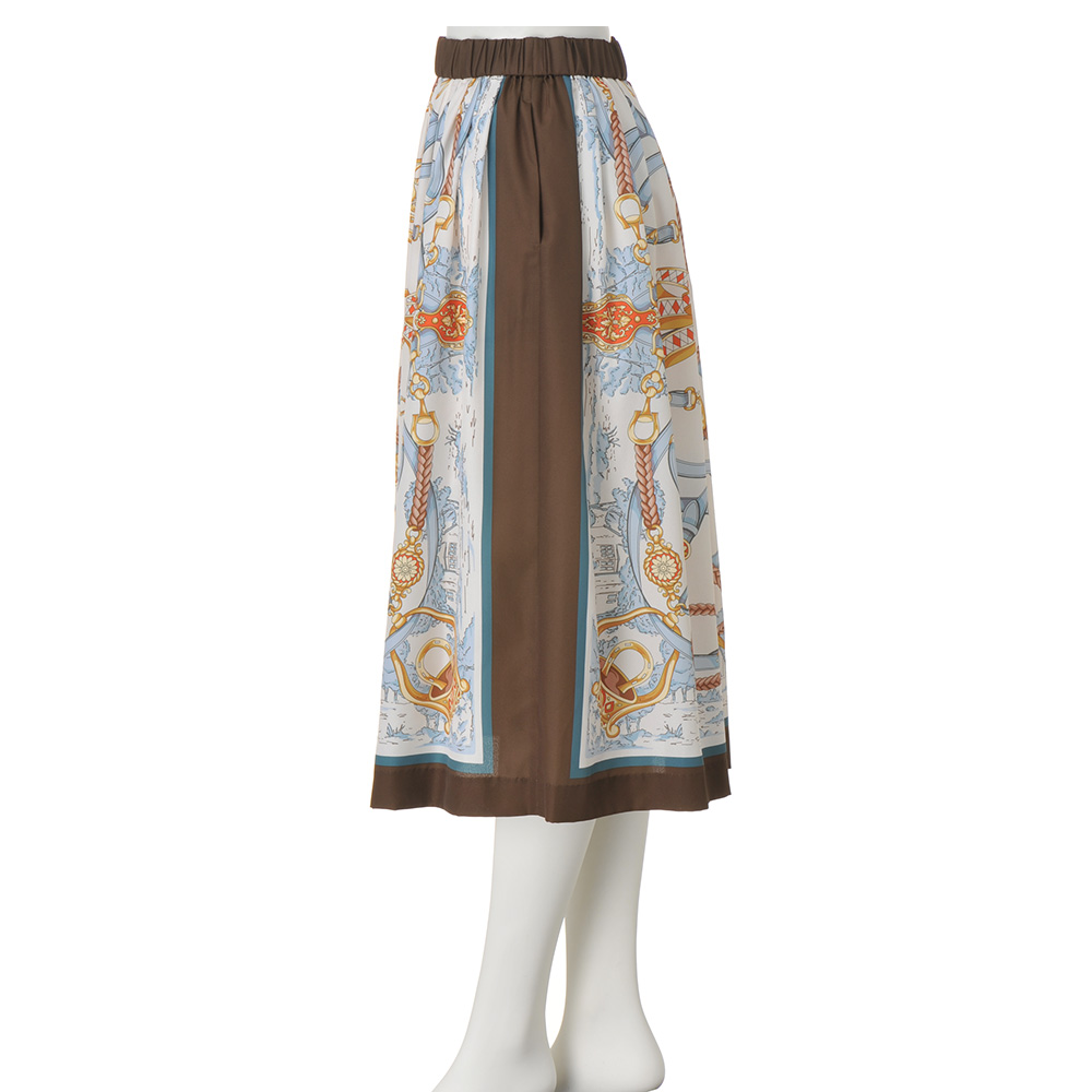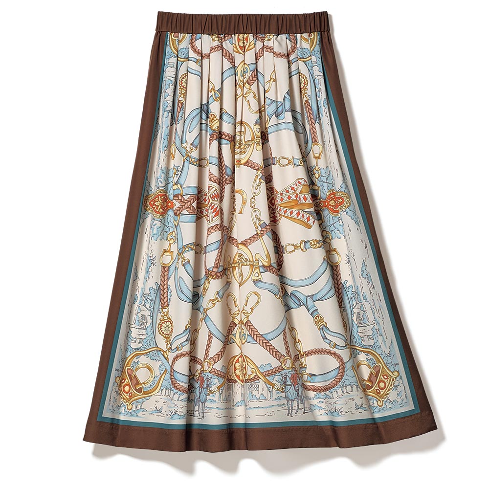 本物を装うお洒落の成熟を語る逸品。豊かに経験を重ねた大人がたどり着く、洗練の本質を語る服、「本物」。ラグジュアリーと真摯に向き合い、誕生したアイテムをお届けします。日常スタイルが輝く上質さとモードの共演。プリントは、イタリア「BINDA」社が1900年代に手掛けたスカーフ柄からのセレクト。DAMAコレクション用に現地で色や柄行きをアレンジした、ここだけで手に入るアイテムです。ウエストゴムと片倒しタックで仕上げたギャザーフレアーラインを、両サイドのブラウンでピリリと引き締めて、嬉しい細見えを叶えています。≫ POINTプリントは、「BINDA」社のアーカイブからインスパイアされたクラシカルな馬具モチーフのパネル柄。80周年を迎える「BINDA」社とのオリジナルコラボデザインです。