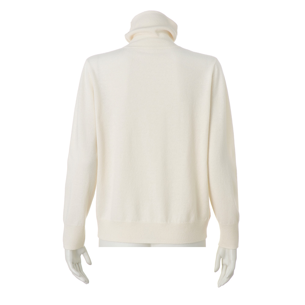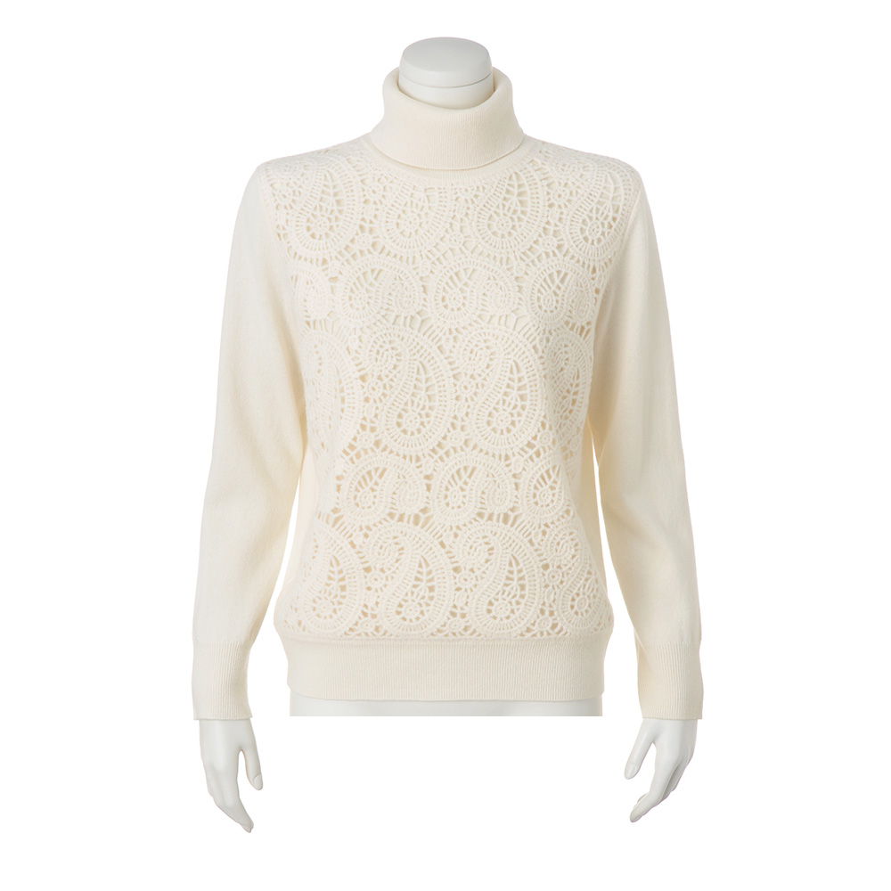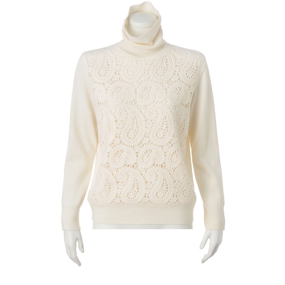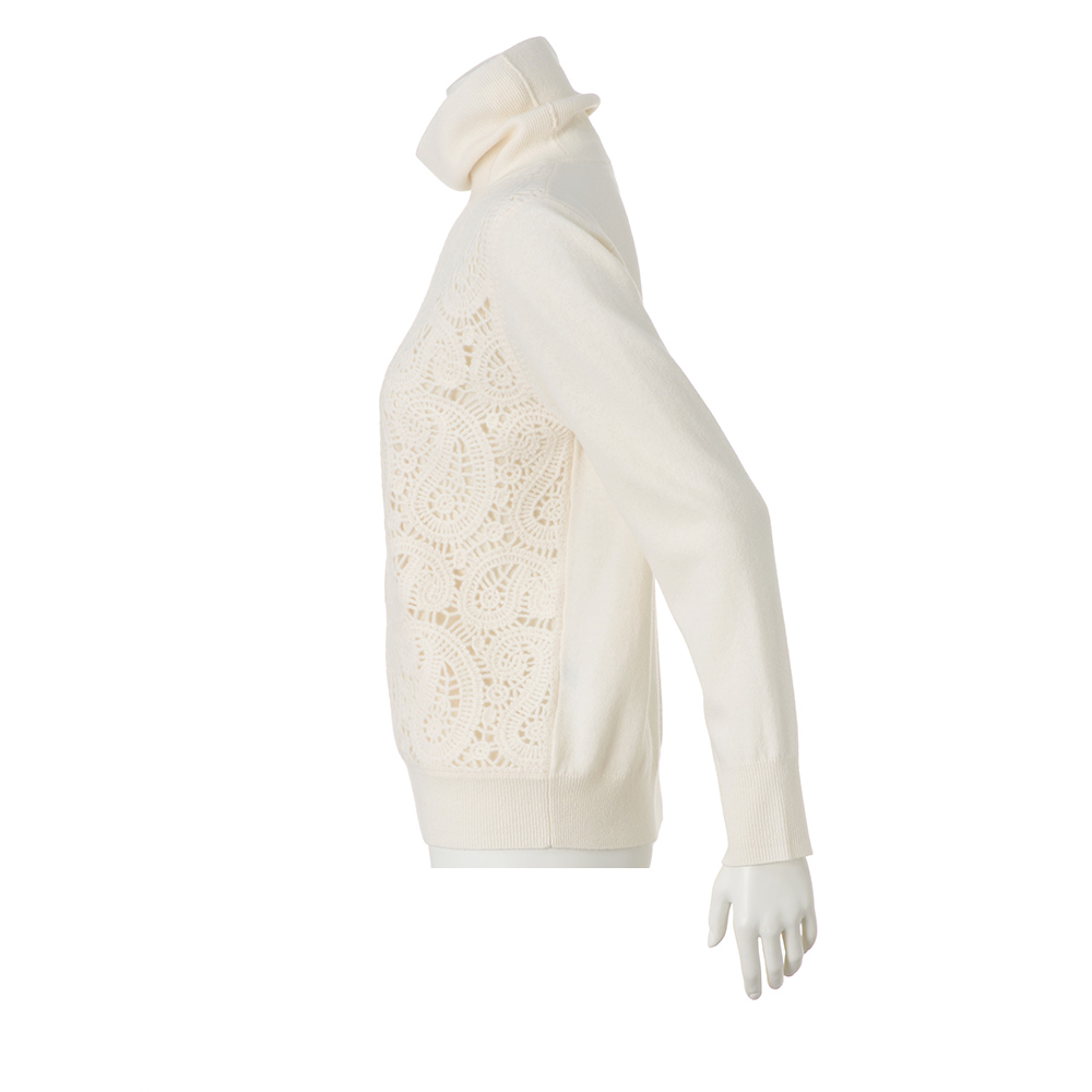 ELEGANCE CAREER 働く私を、軽やかに刷新!仕事だからと真面目すぎてはつまらない。冬も印象的な色や柄を軽やかに取り入れて、働く私をブラッシュアップ!気取らないニットに華やかな気分を添えて。ストレスを感じさせない着心地に加え、一枚で絵になるニットプルオーバーなら、急な打ち合わせや会食が入っても慌てることなく臨めます。前身頃の大小のペイズリーモチーフを組み合わせた透かし柄は、ハンドクロシェ風のルックスを機械編みで実現。透け感を気にせず着られるよう裏地を当てているのも、優美な編み地の陰影を深め、着ている人をより美しく見せる美点に。素材はソフトな風合いとウォーム感に優れたオーストラリア産スーパーファインメリノウール。袖と後ろ身頃はしっかりと編まれたハイゲージ天竺、タートルネックと袖口、裾は程良くフィットするリブ編みなのも着やすさのポイントです。