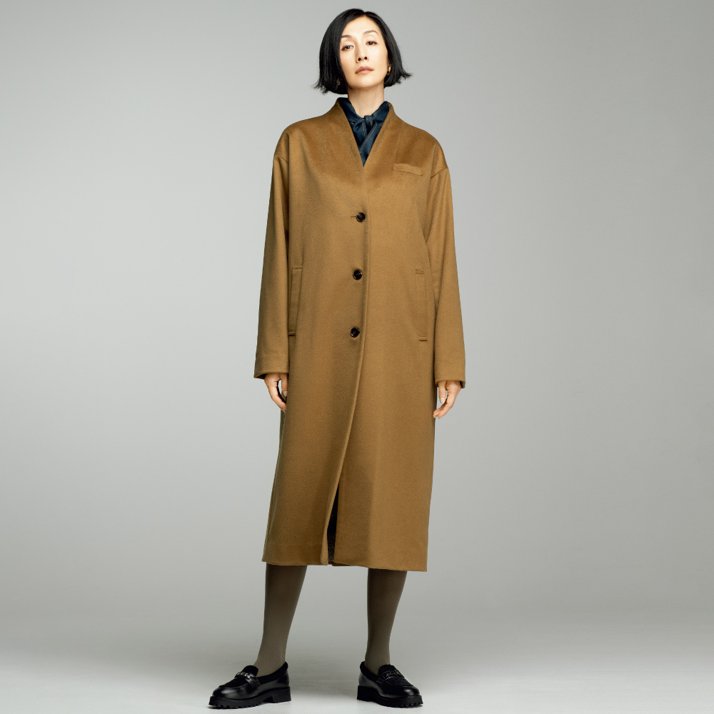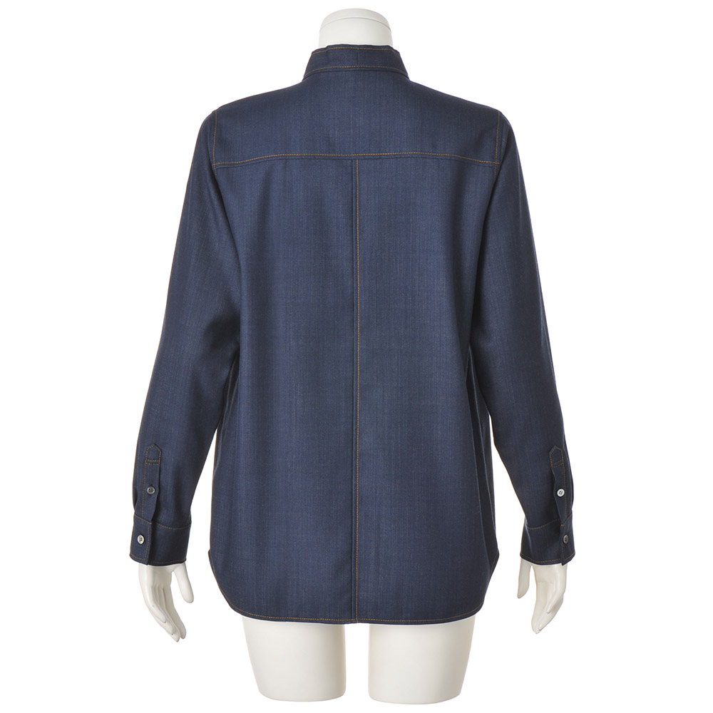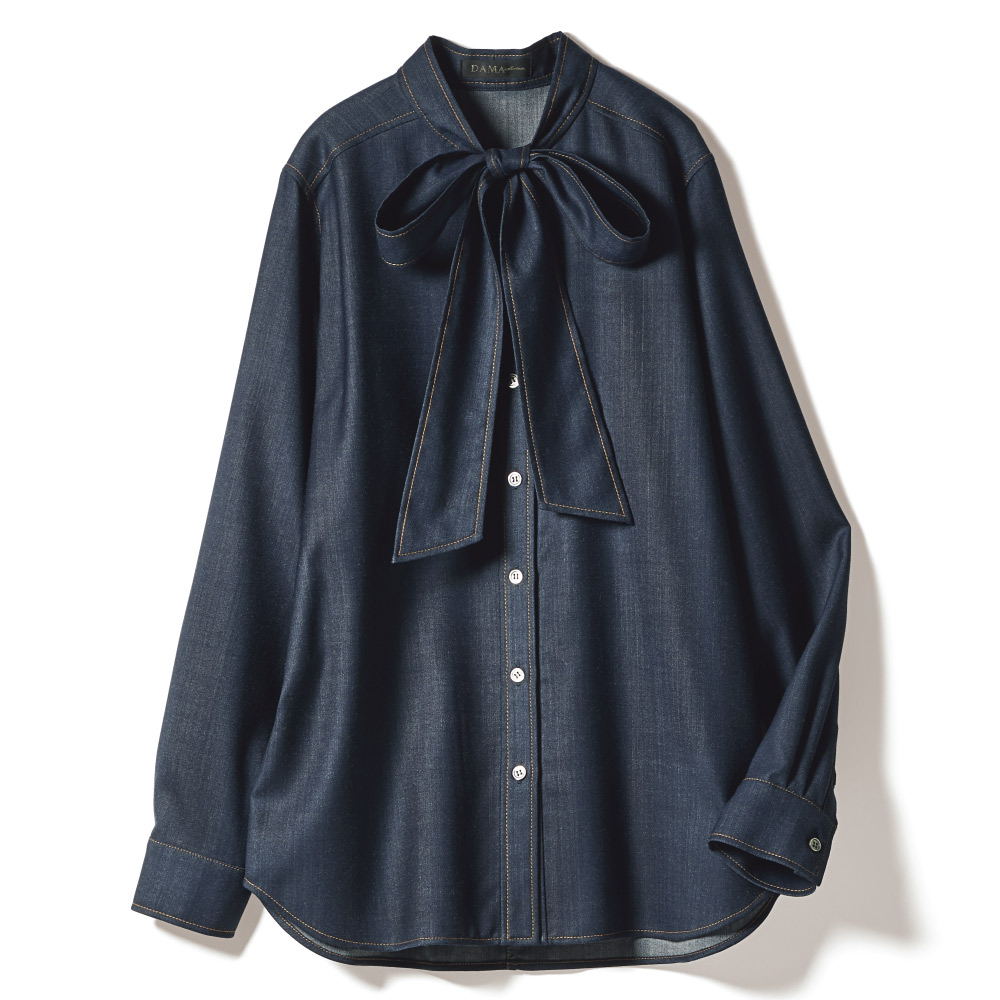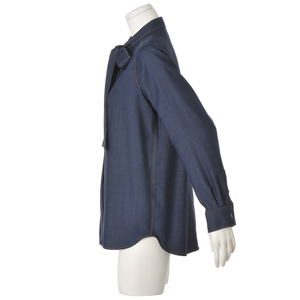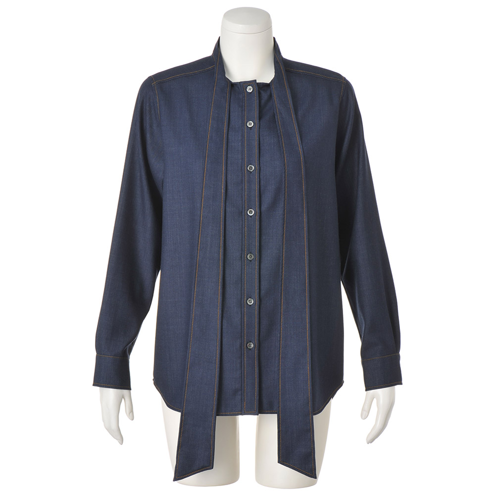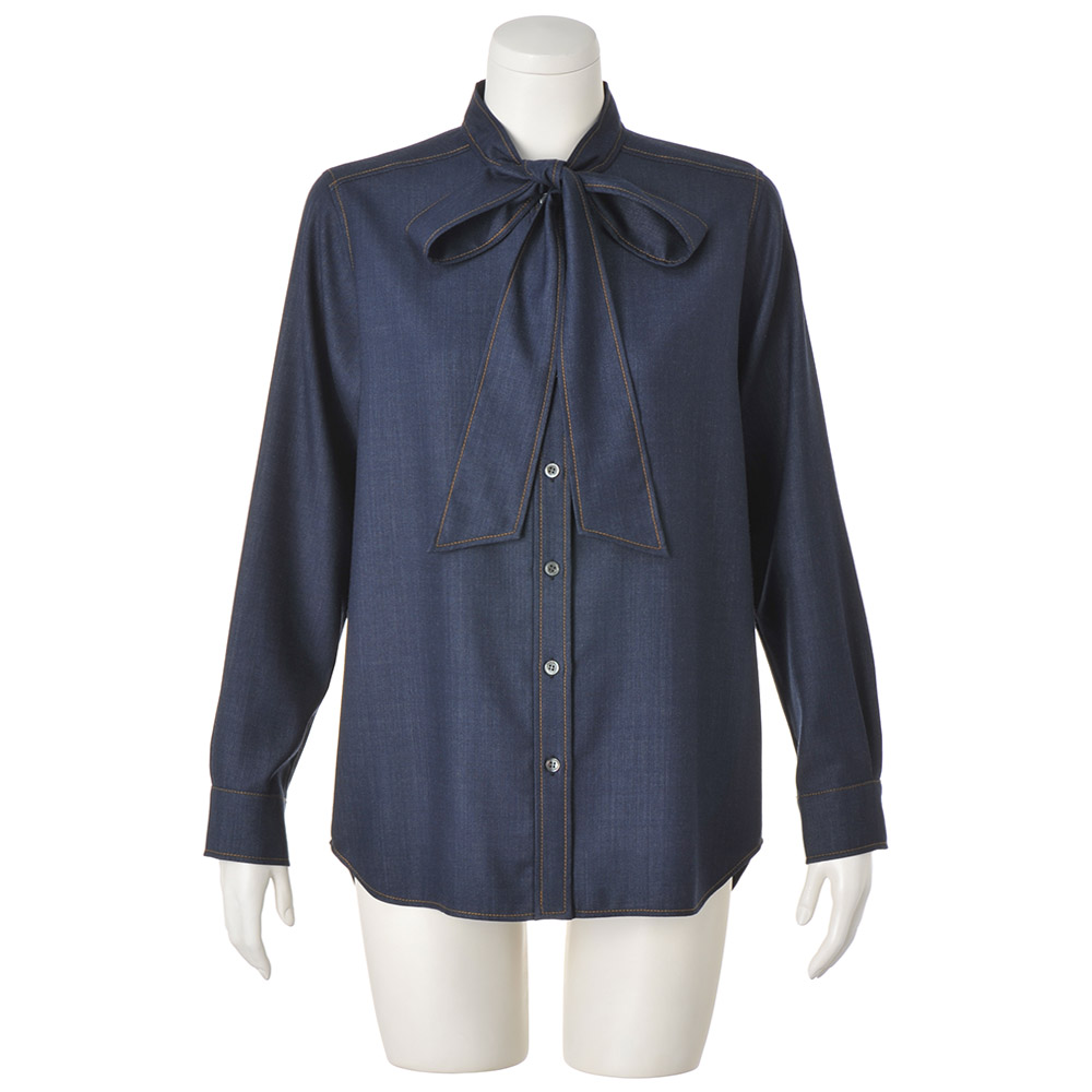 上質素材と遊び心でベーシックを更新落ち着いた深いインディゴカラーが、洗練されたカジュアルに導くブラウス。上品な艶としなやかな風合いを持つ「西川毛織(株)」のウール混のデニム調素材は、デニム特有のカジュアルさにウールの暖かさと上品さがプラス。スタンドカラーから続くボウタイや剣ボロ付きのカフスなど、随所に配色のステッチを効かせたデザインで、カジュアルにもエレガンスにも着こなせる一着に仕立てました。