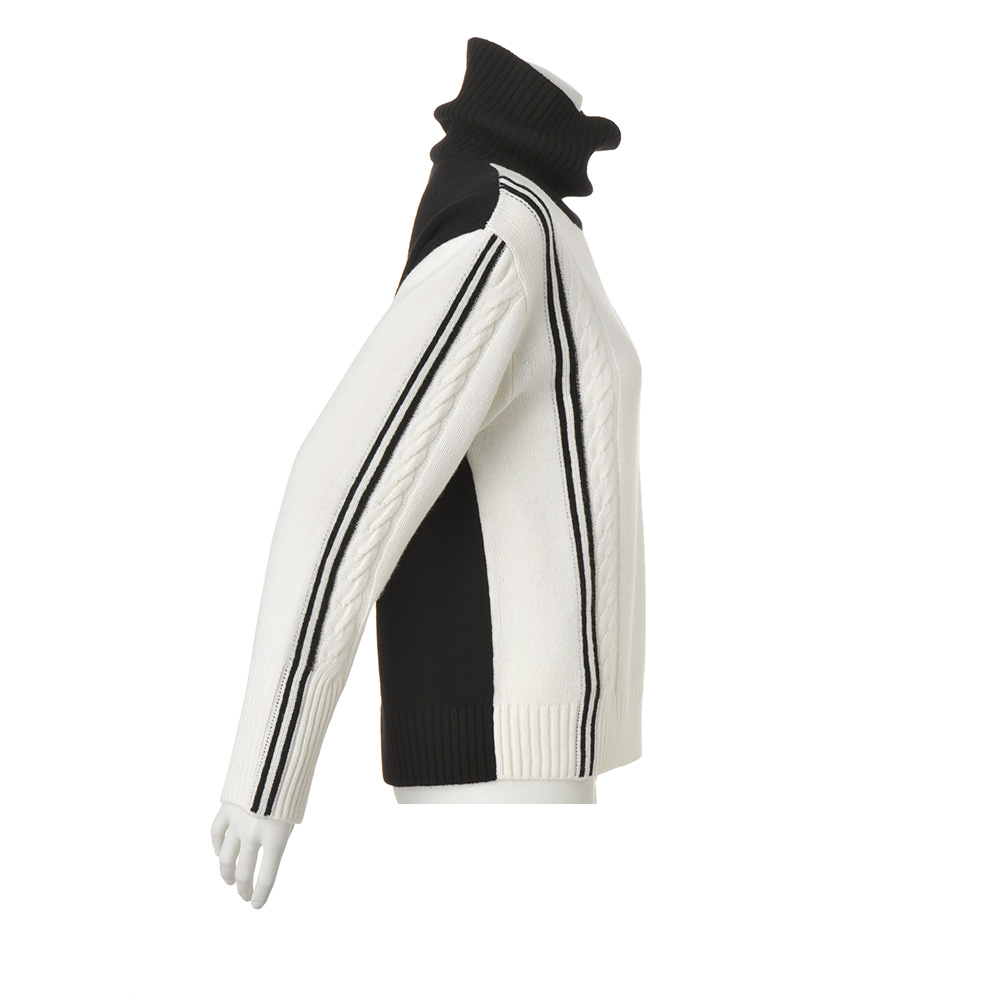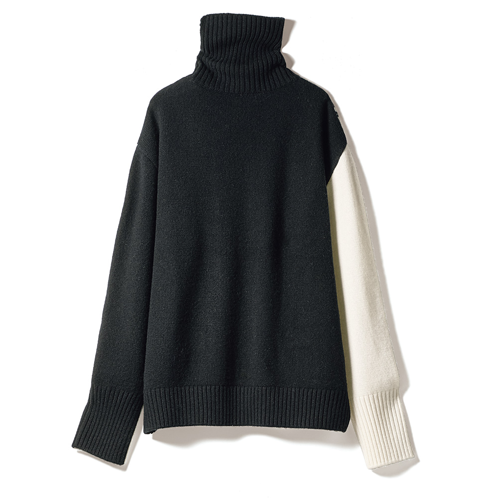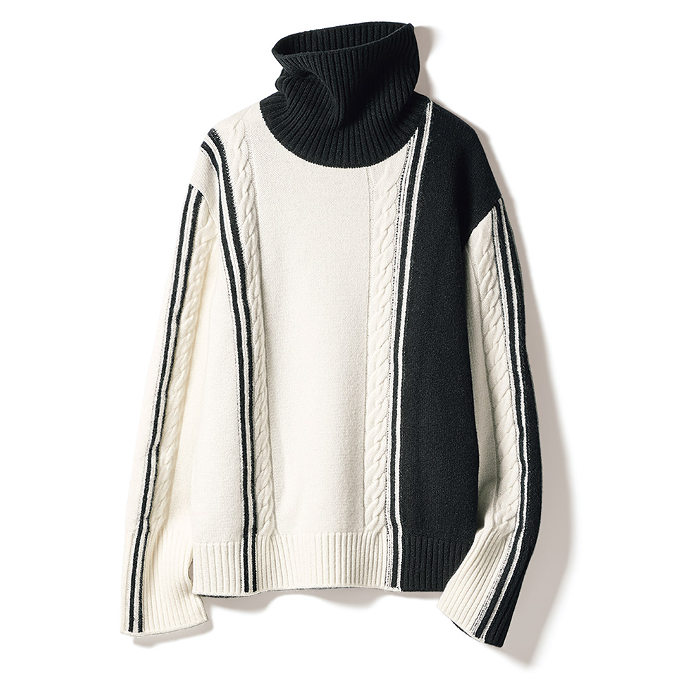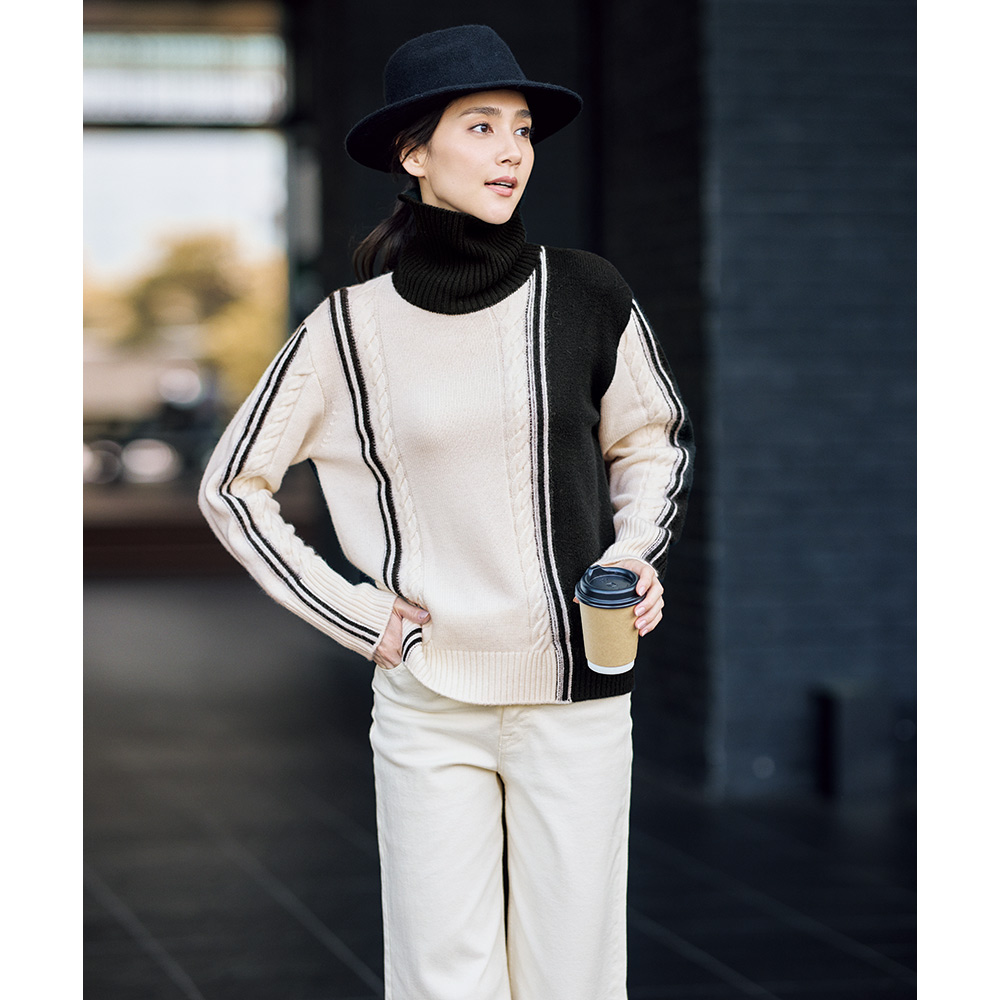 カジュアルこそ、品良く、軽やかに!軽く暖かな冬素材に女性らしいディテールを映したアイテムで、大人の毎日をさらに美しいものに。色と編み地の対比がモードな存在感モノトーン配色でコーディネートに取り入れやすいのに印象は個性的、カジュアルからきれいめまで着こなせるニットプルオーバーができました。触れるとふんわり柔らかな風合いながら、しっかりと厚みがあって暖か。ウール本来の膨らみ感と軽さが活きるよう、細く繊細なウール原料のセミ梳毛と紡毛を撚糸して編み上げています。フロントとバックスタイルでがらりと変えた配色バランスも新鮮。前身頃と両袖の前面に効かせたケーブル柄と配色ダブルラインのアクセントが縦ラインを演出。スラリと見える効果もプラスして。≫ POINT天竺編みをベースに、ケーブル編みを前身頃に2本、袖に各1本。襟・袖口・裾の太畝のリブも軽快なアクセント。